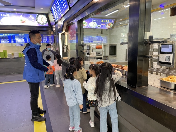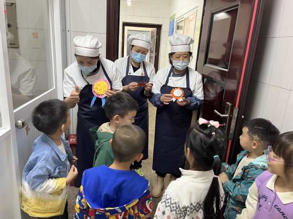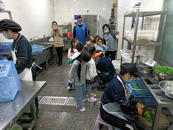 在饮食中心的叔叔阿姨们热情地的欢迎下,幼儿们先后参观了食堂后厨的洗碗间、切菜间、烹饪间、餐厅。 洗碗间内,幼儿看到阿姨们将盘子洗得干干净净;切菜间内,阿姨们正在对蔬菜等食品进行清洗和切碎;烹饪间内,厨师叔叔展示了精美菜肴的制作……整个后厨人员各司其职,毫无懈怠。质监办公室的工作人员带领幼儿们认识消防栓、灭火器、逃生指示牌等,幼儿们通过现场观摩,明白安全生产的重要性。
