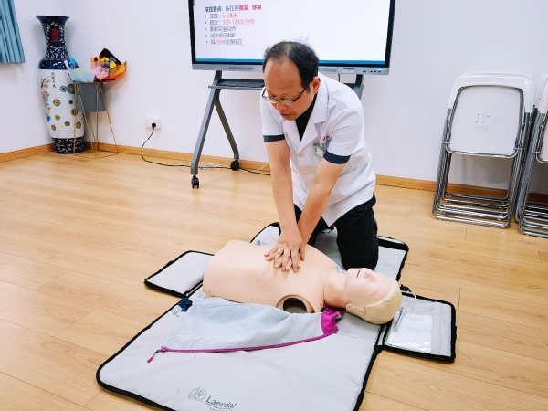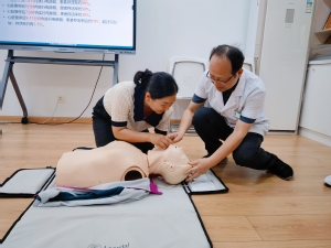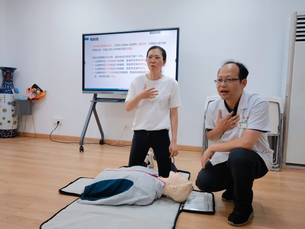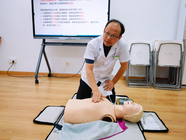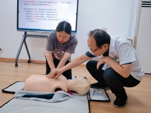 接着通过现场实操演示,饶健生动地讲解了什么是心肺复苏术(CPR),并现场演示了心肺复苏术的操作过程、自动体外除颤器(AED)设备的使用方法,普及了气道异物梗阻自救互救等知识。教职工们一边认真聆听,一边比划着操作。确保操作要领熟记于心。