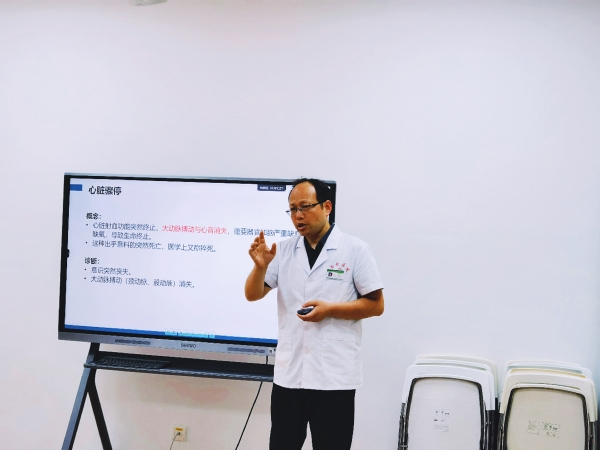 首先,饶健通过PPT演示运用通俗易懂的语言生动得讲解了心肺复苏的相关理论知识,强调了心肺复苏的重要性和“黄金四分钟”对救治的重要意义,让教职工深刻认识到时间就是生命。