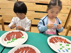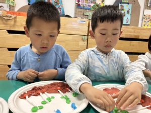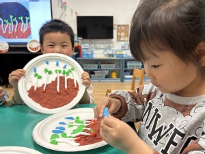 孩子们发挥奇思妙想,用超轻黏土在圆盘上塑造出土地、种子和幼苗,再点缀上雨滴,一幅幅充满童趣的“谷雨”作品跃然眼前。孩子们互相欣赏作品,分享创作的喜悦,展现对谷雨的独特理解。