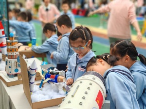 在科学嘉年华活动现场,亲子科技作品展上,矿泉水瓶、纸箱等废旧材料经过巧妙改造,变身为会发光、能移动的科技作品;科学探索区里,孩子们用彩和黏土制作各种各样的航天器,创意十足;会跳舞的机器狗、各种各样智能机器人表演和“雏鹰无人机挑战赛”更是点燃了现场的热情,孩子们在动手实践中体验科技乐趣。特色鲜明的创造性游戏则打造“三航”情景化场景,孩子们在其中合作、创想,充分体现“玩中学”理念 ,为孩子们带来了一场充满趣味与知识的航空航天之旅。
