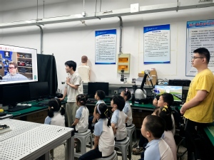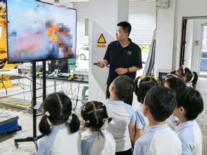 在“智能机器人控制研究室”,孩子们见到双臂机器人、灵巧手、遥操作机器人等设备。研究生们通过PPT讲解机器人发展与应用,播放达芬奇机器人、仿生机器人等多种机器人的应用视频,随后孩子们在互动体验区体验遥操作机器人,力觉传感器带来的真实触感让他们惊叹不已。实验室楼下,宇树科技四足机器人“贝贝”献上科技舞蹈秀,流畅完成后空翻、太空步等动作,并通过AI情感交互与孩子们比心、握手。正是科研人员的不懈努力,才让这些充满科技感的机器人得以生动展现在大家眼前。