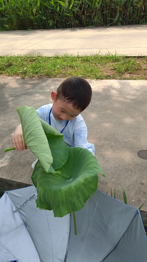 当“荷叶”成为孩子们的玩伴,乐趣便接踵而至。孩子们和家长一同探索荷叶的奥秘:看水珠在莲叶上滚动,将莲花当作“小船”“风车”嬉戏,用绘画的方式表达对莲花的喜爱。在欢声笑语的游戏中,科学的种子悄然在孩子们心中扎根。