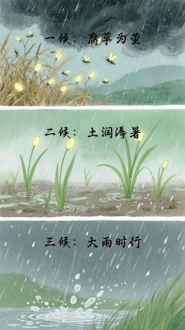 一候腐草为萤:古人认为草衰败和腐烂之后,生命的运化在继续,腐草“变成萤火虫。真实情况是萤火虫在枯草上产卵,湿热的大暑时节卵化而出。