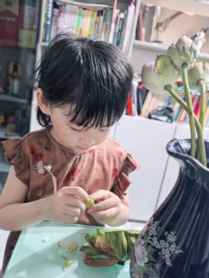 炎炎夏日里,孩子们还动手制作了大暑专属美食。剥莲子、享甘甜,在劳动中收获喜悦与成就感,甜甜的莲子不仅滋养了心田,更让孩子们对食物有了更深的感知。