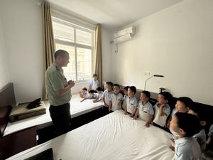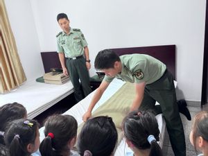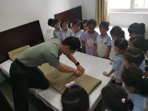 走进军营住宿区,孩子们被整齐的环境吸引:被子叠成方正的“豆腐块”,生活用品摆放成直线,连牙刷朝向都完全一致。教官现场演示叠被子技巧,娴熟捏出笔直棱角;孩子们目不转睛,随后纷纷尝试,在教官协助下努力叠出“小棱角”,真切体会军人严谨自律的生活作风。