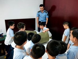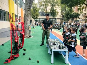 在队列训练中,孩子们随着“稍息、立正、跨立、敬礼”口令挺直身姿,模仿军人仪态,锤炼纪律意识与专注力;枪支体验环节,他们在指导下近距离接触模拟枪支,学习持枪、瞄准,感受军事训练的严肃与乐趣;手雷投掷时,大家踊跃尝试、反复练习,在克服困难中收获成就感。