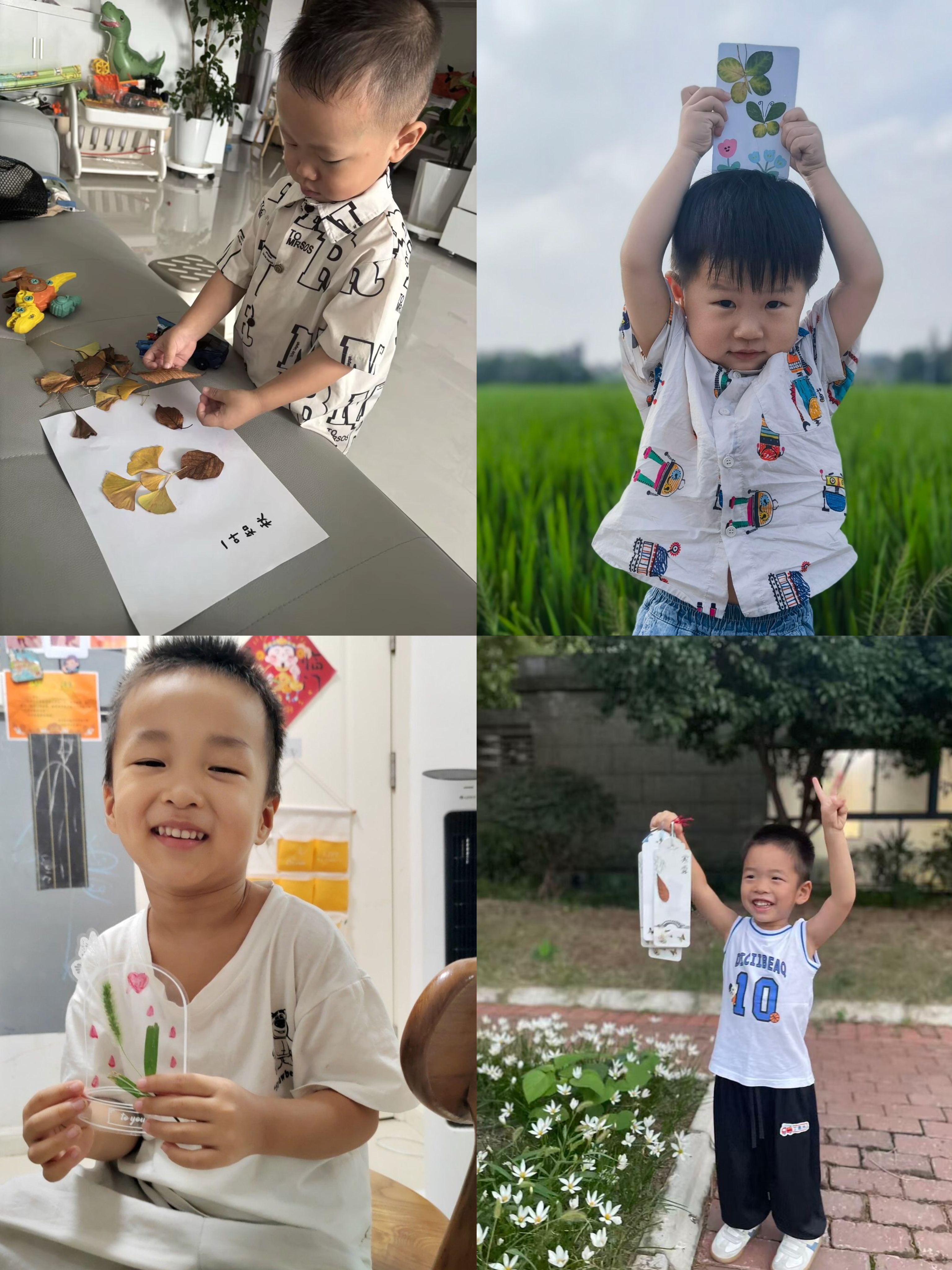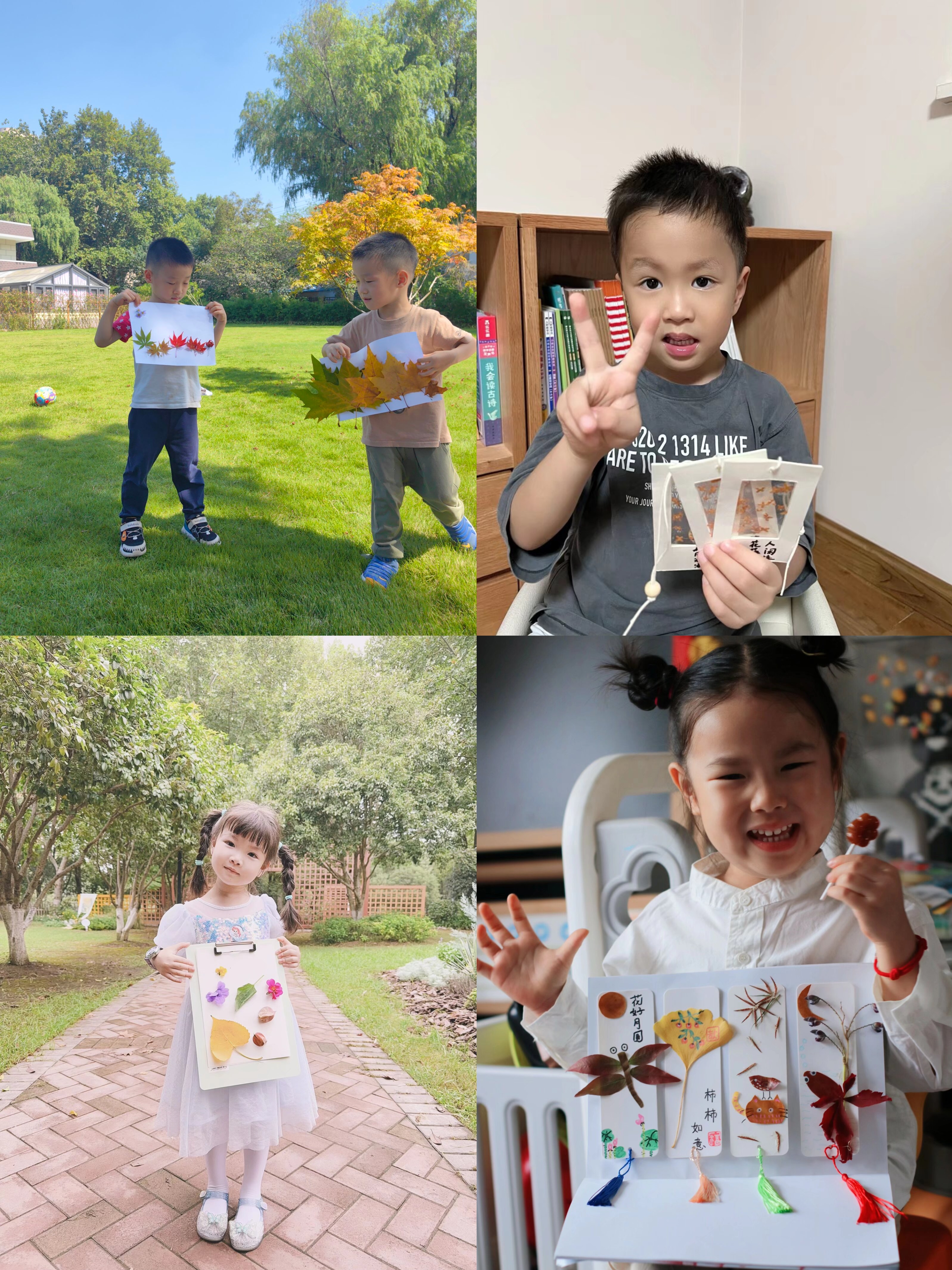 秋天来临,家长们带着孩子走进大自然,收集各式落叶制作书签。金黄的银杏、火红的枫叶……每一片叶子都成了孩子们眼中的宝贝。他们将树叶压平,贴上可爱的贴纸,再系上细绳,一枚枚独一无二的寒露书签就这样完成了。不仅留住了秋天的美好,也让孩子真切感受到寒露时节树叶的形态与色彩变化。