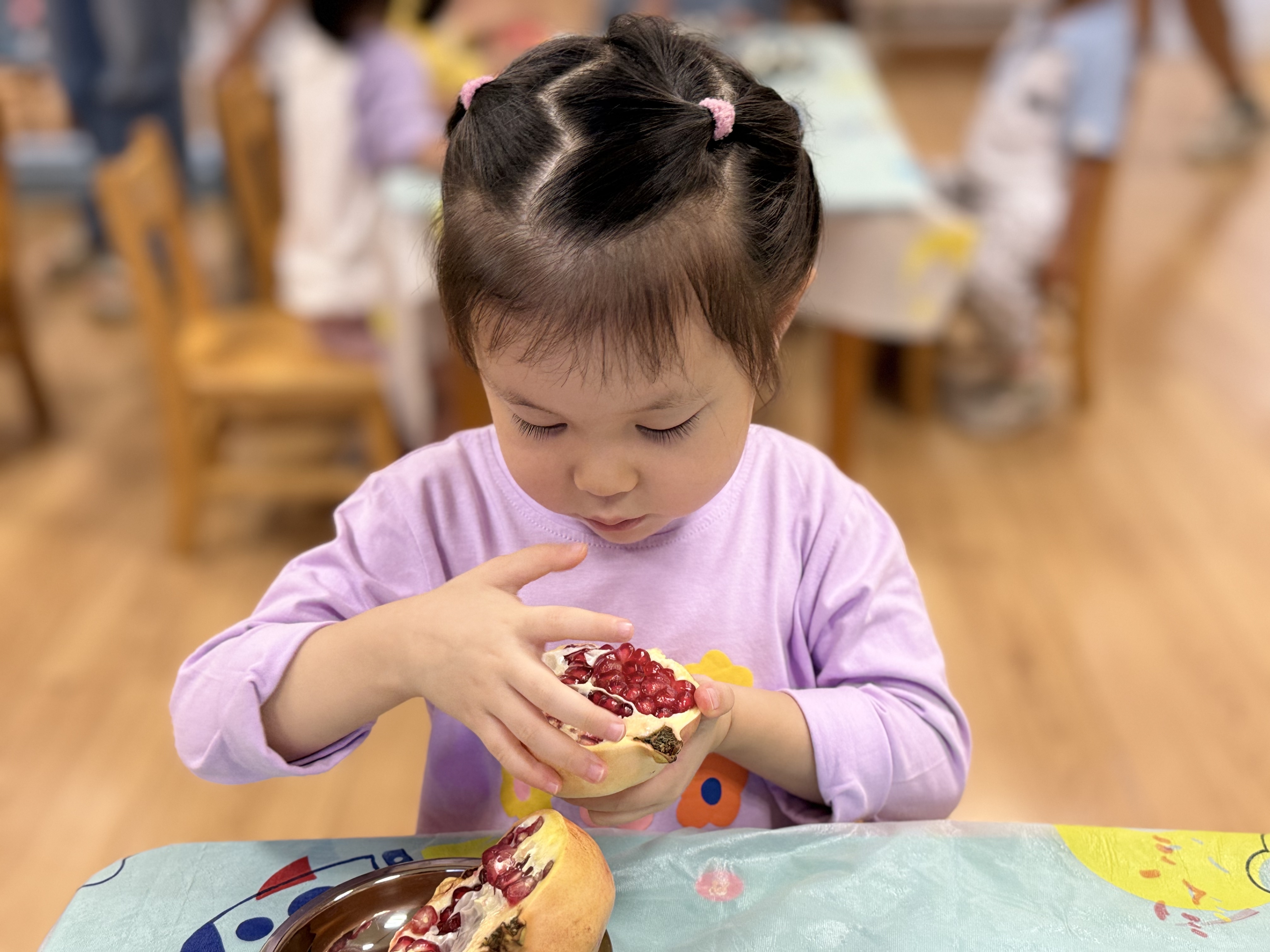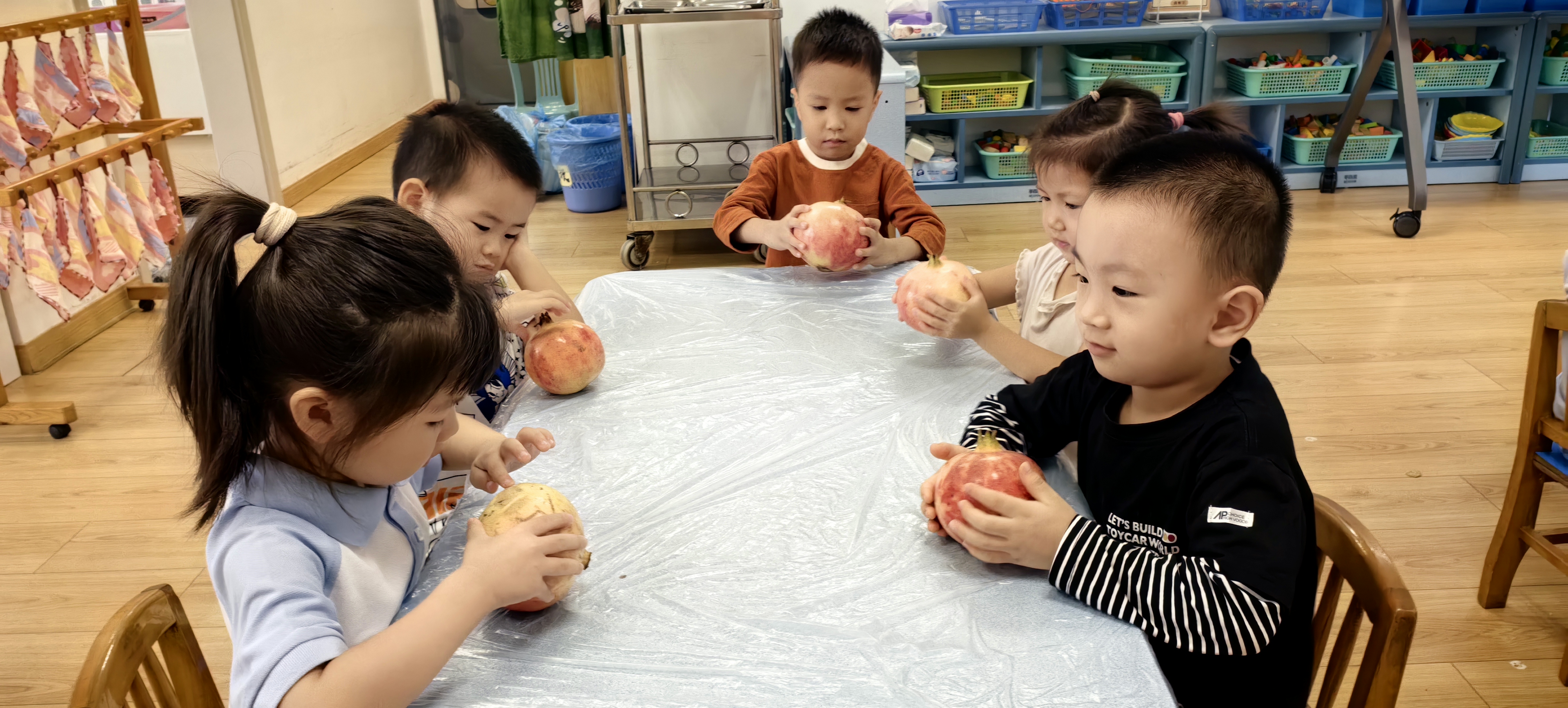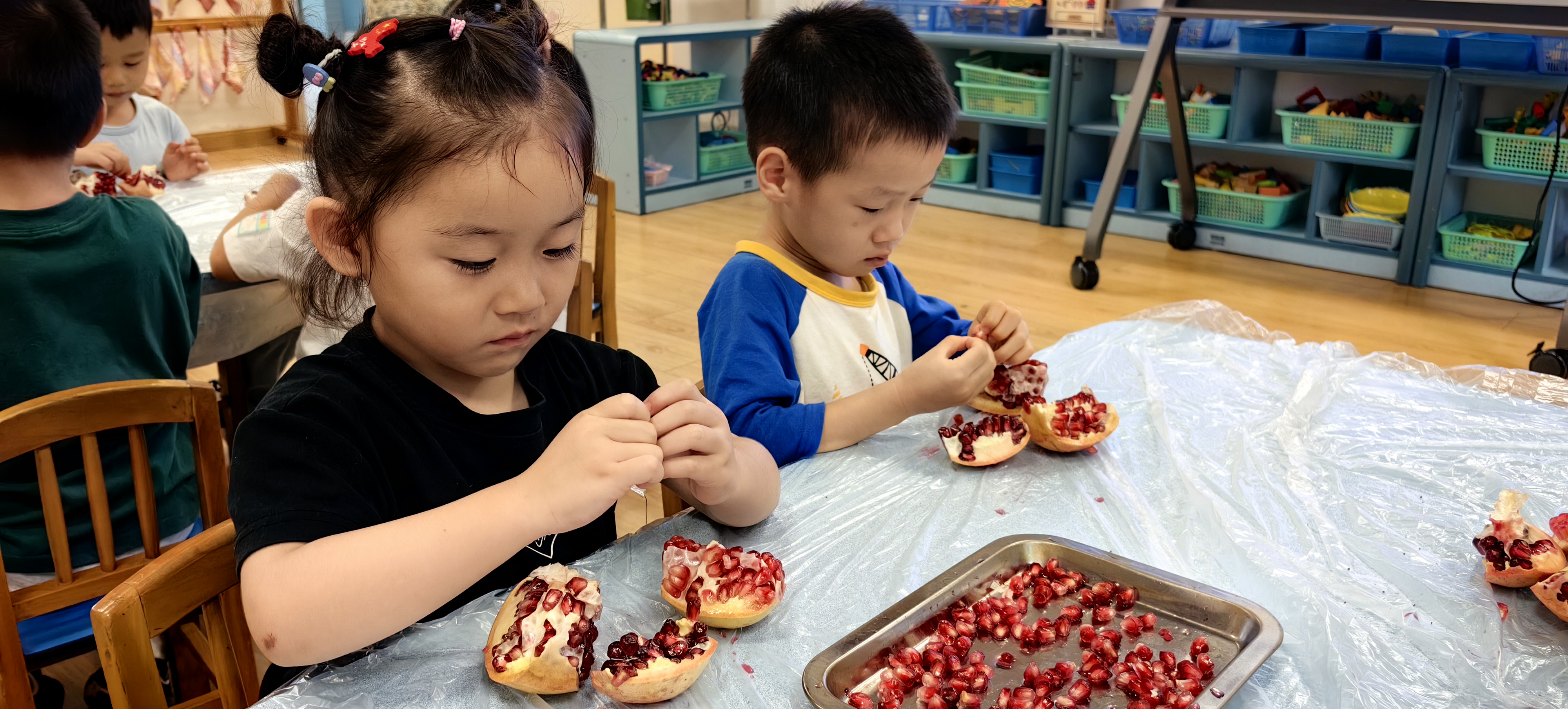 接着,大家一同探索剥石榴的方法。学会之后,孩子们用灵巧的小手剥开果皮,露出里面晶莹饱满的果粒。孩子们不仅锻炼了手部精细动作,还品尝到了甜甜的果实。不时有孩子开心地向小伙伴展示:“我的石榴粒最红!”