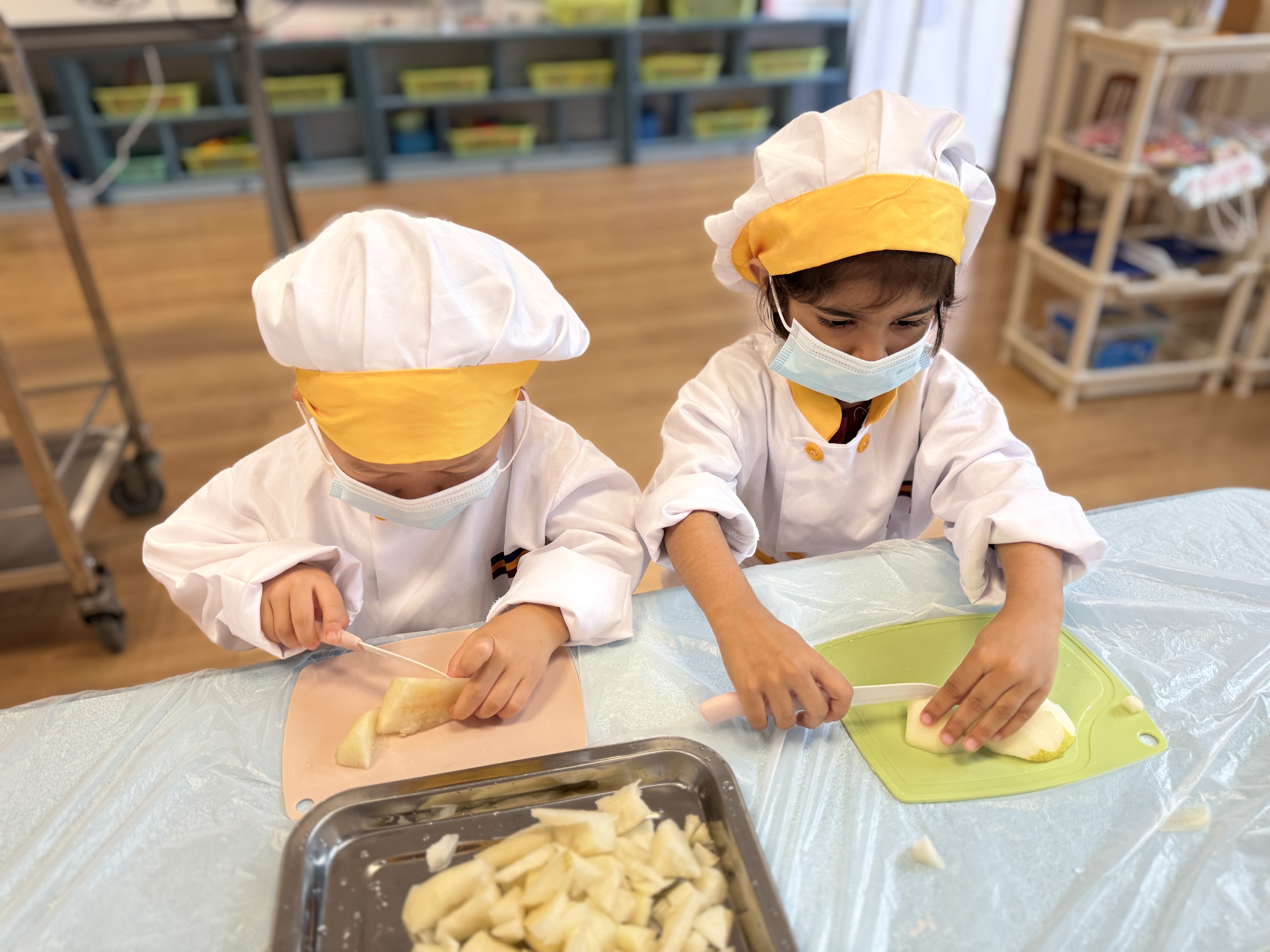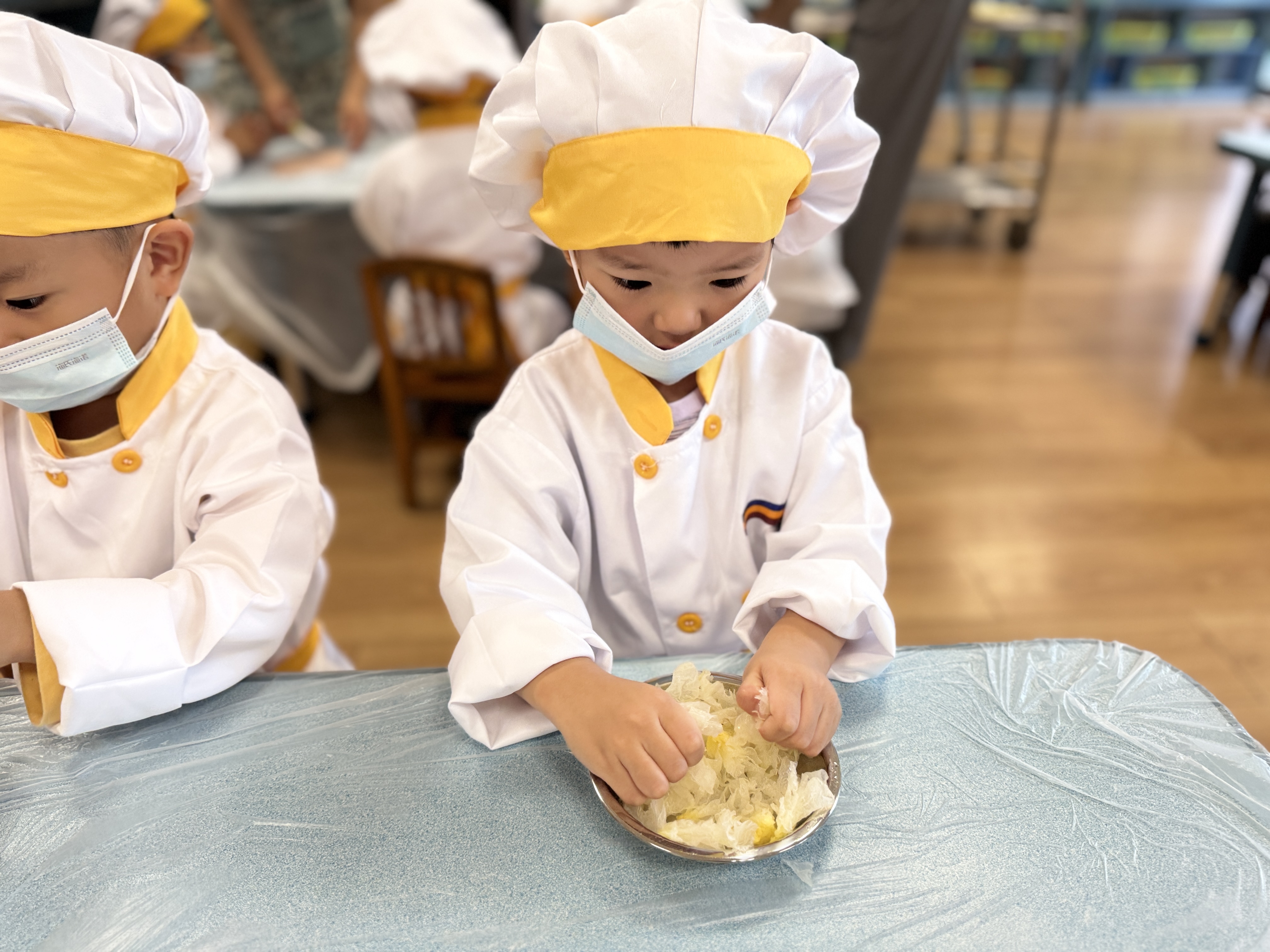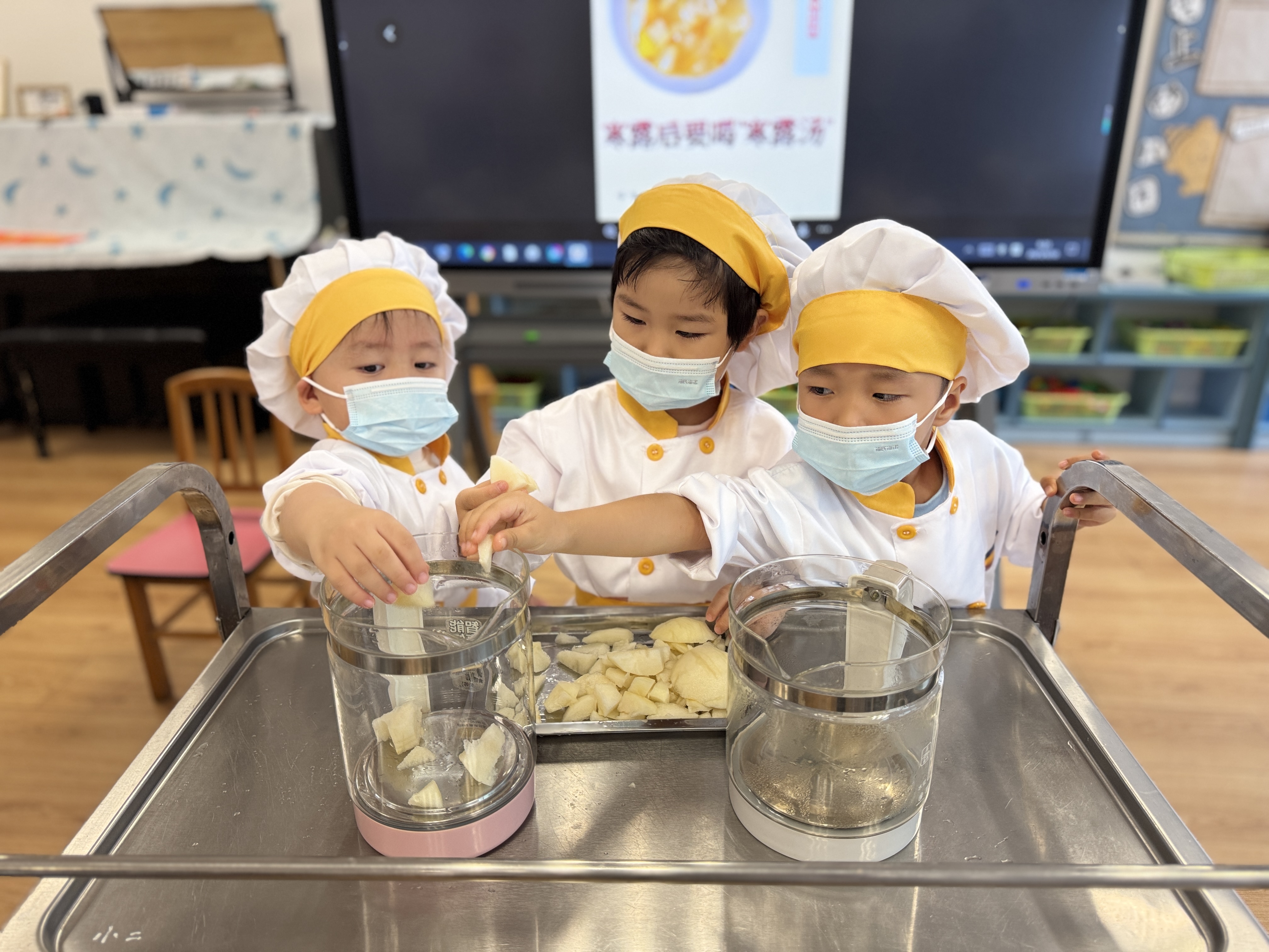 寒露时节,一碗热腾腾的“寒露汤”最能温暖身心。孩子们在老师的指导下学习制作这道暖汤。大家将梨子、银耳等食材一一清洗、泡发、削皮、切块……最后把准备好的食材放入锅中一同炖煮,静静等待香气四溢的时刻。