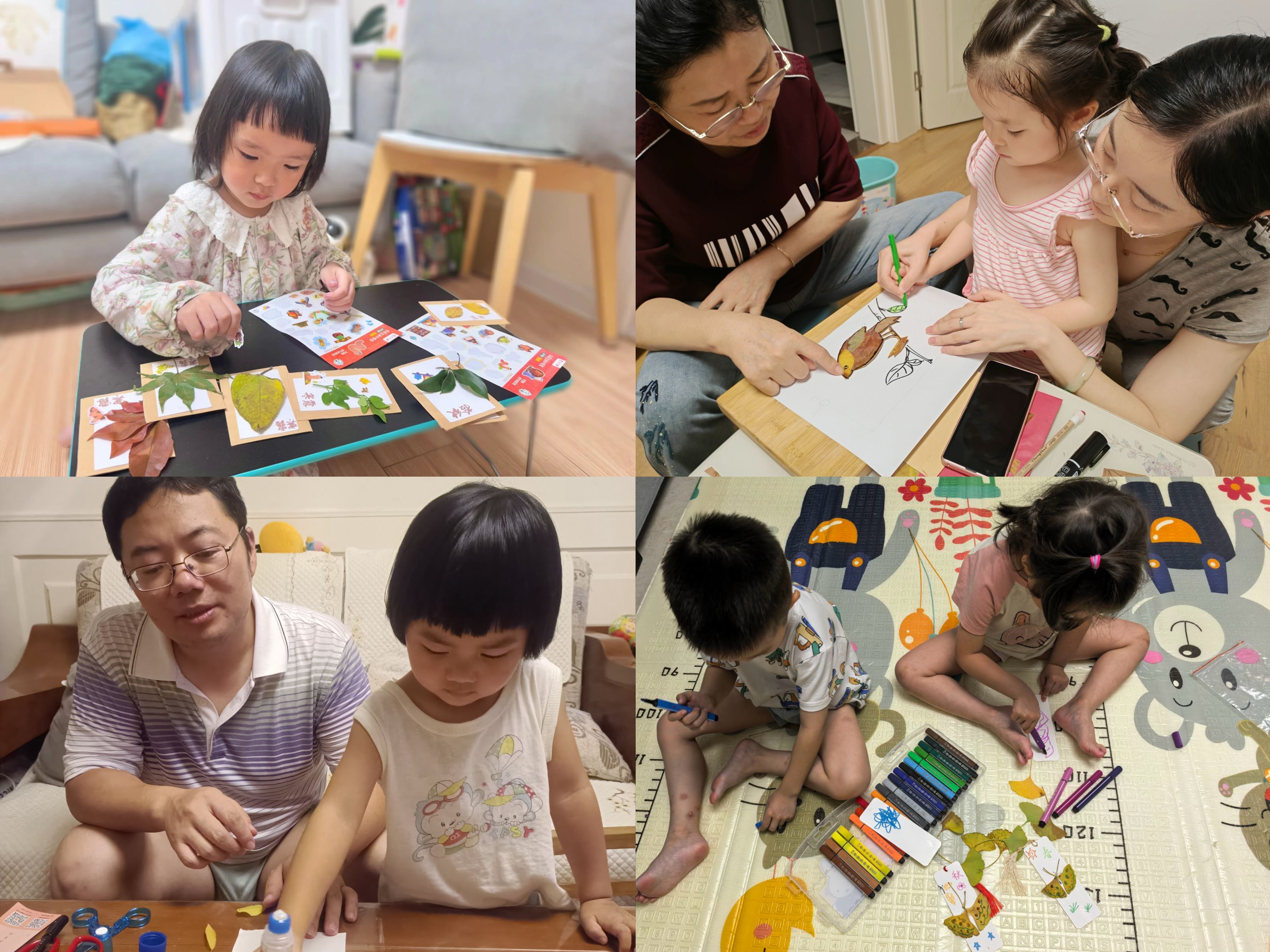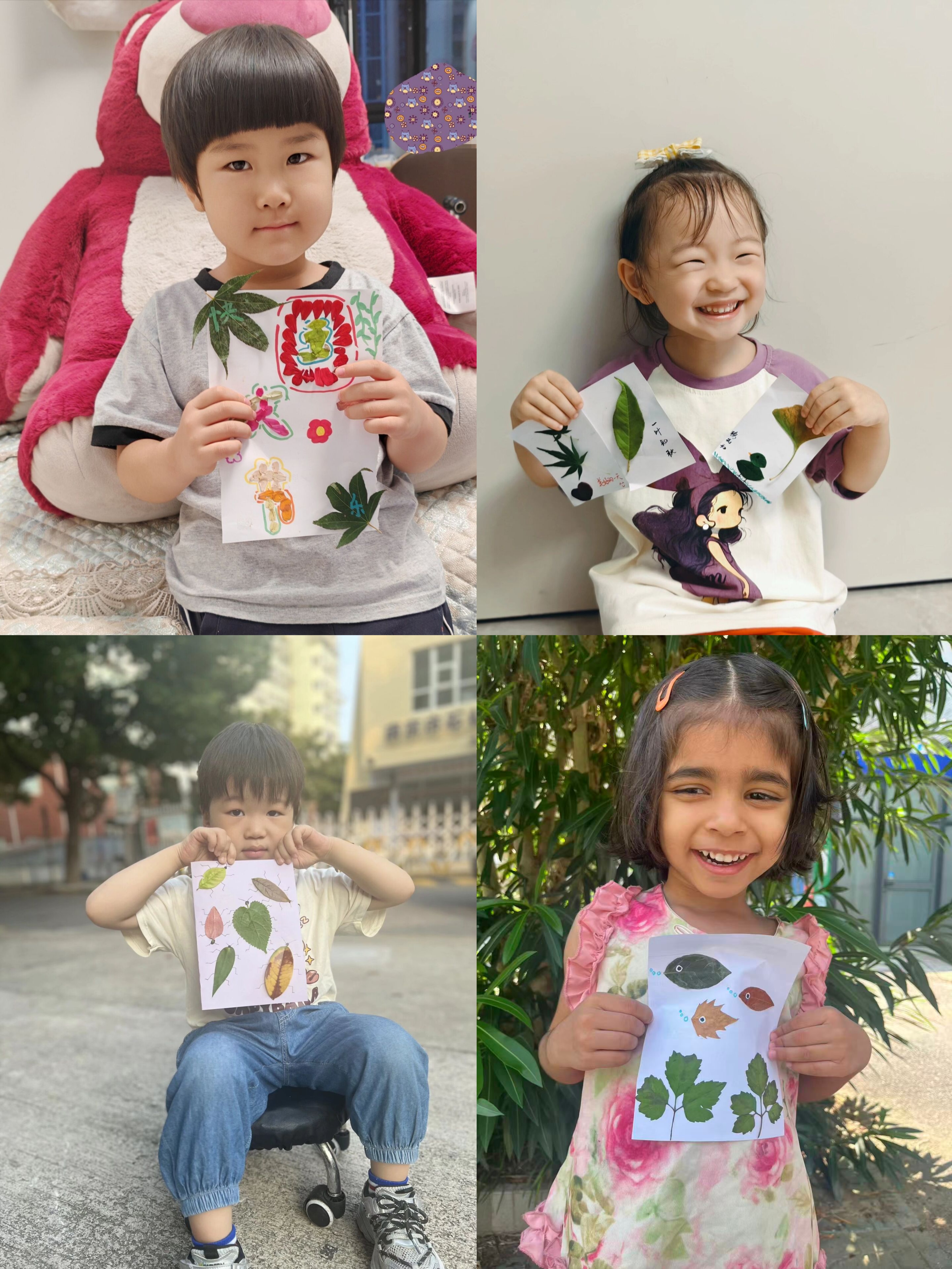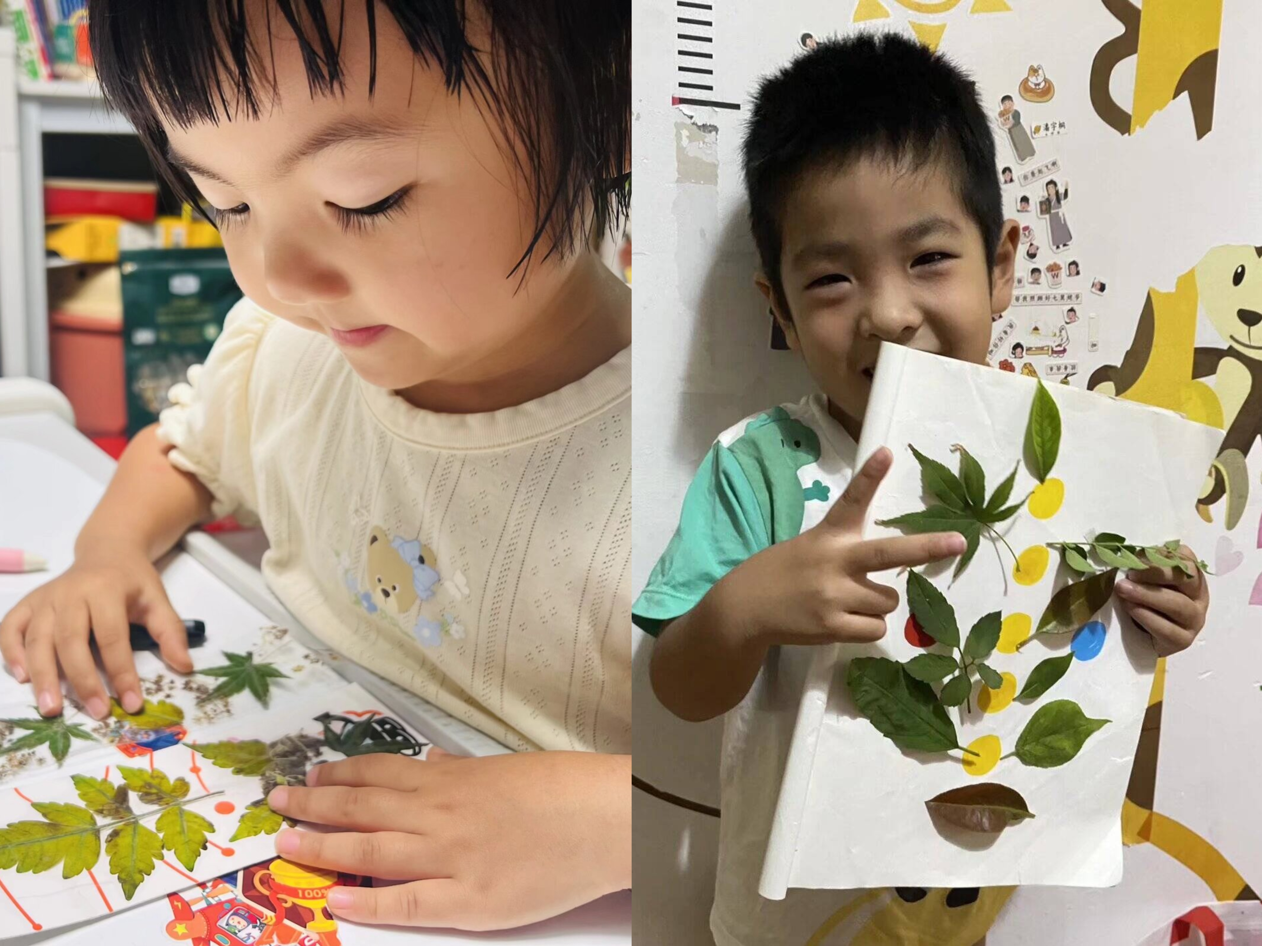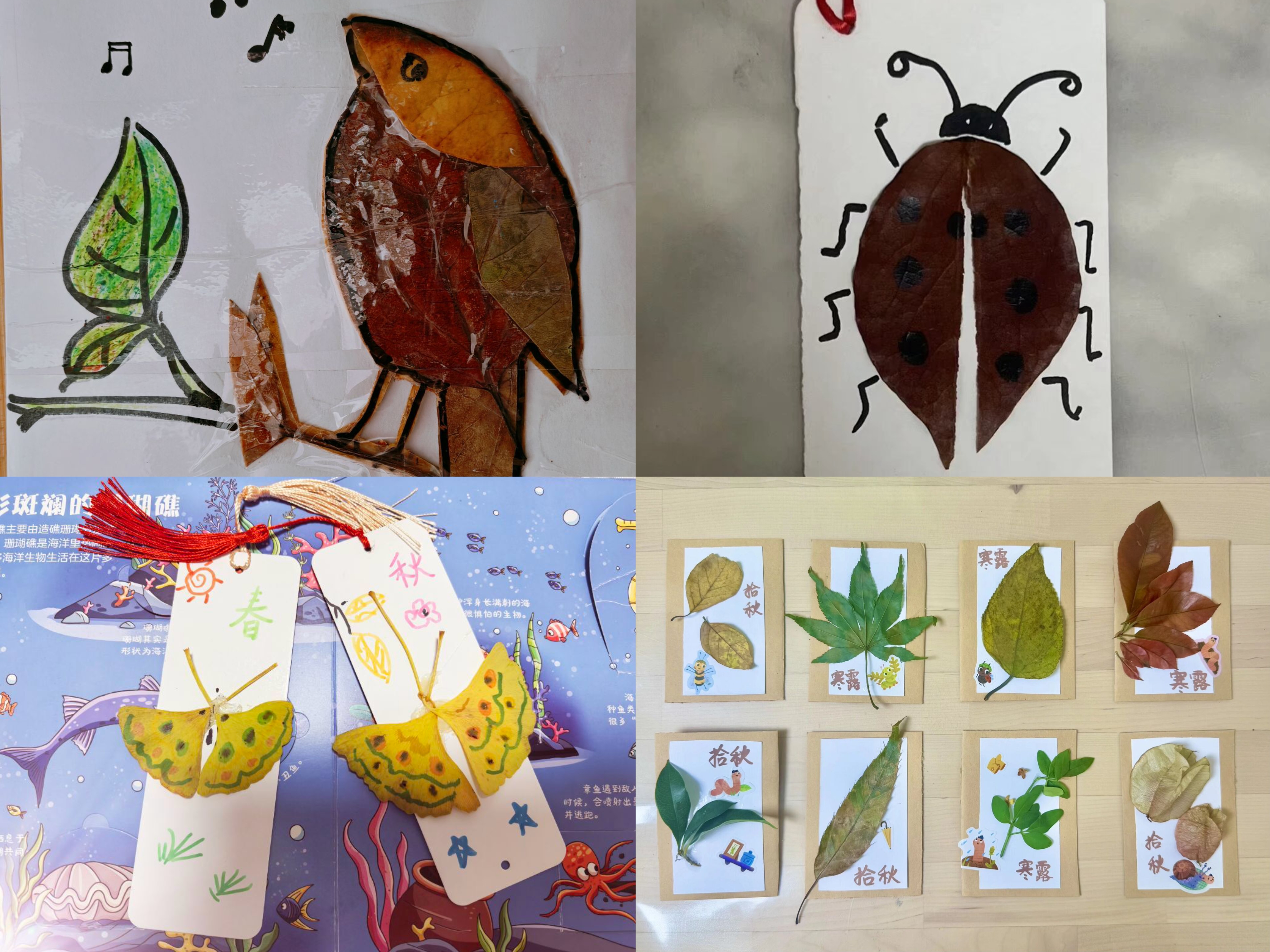 秋天来临,家长们带着孩子走进大自然,收集各式落叶制作书签。金黄的银杏、火红的枫叶……每一片叶子都成了孩子们眼中的宝贝。他们将树叶压平,贴上可爱的贴纸,再系上细绳,一枚枚独一无二的寒露书签就这样完成了。不仅留住了秋天的美好,也让孩子真切感受到寒露时节树叶的形态与色彩变化。