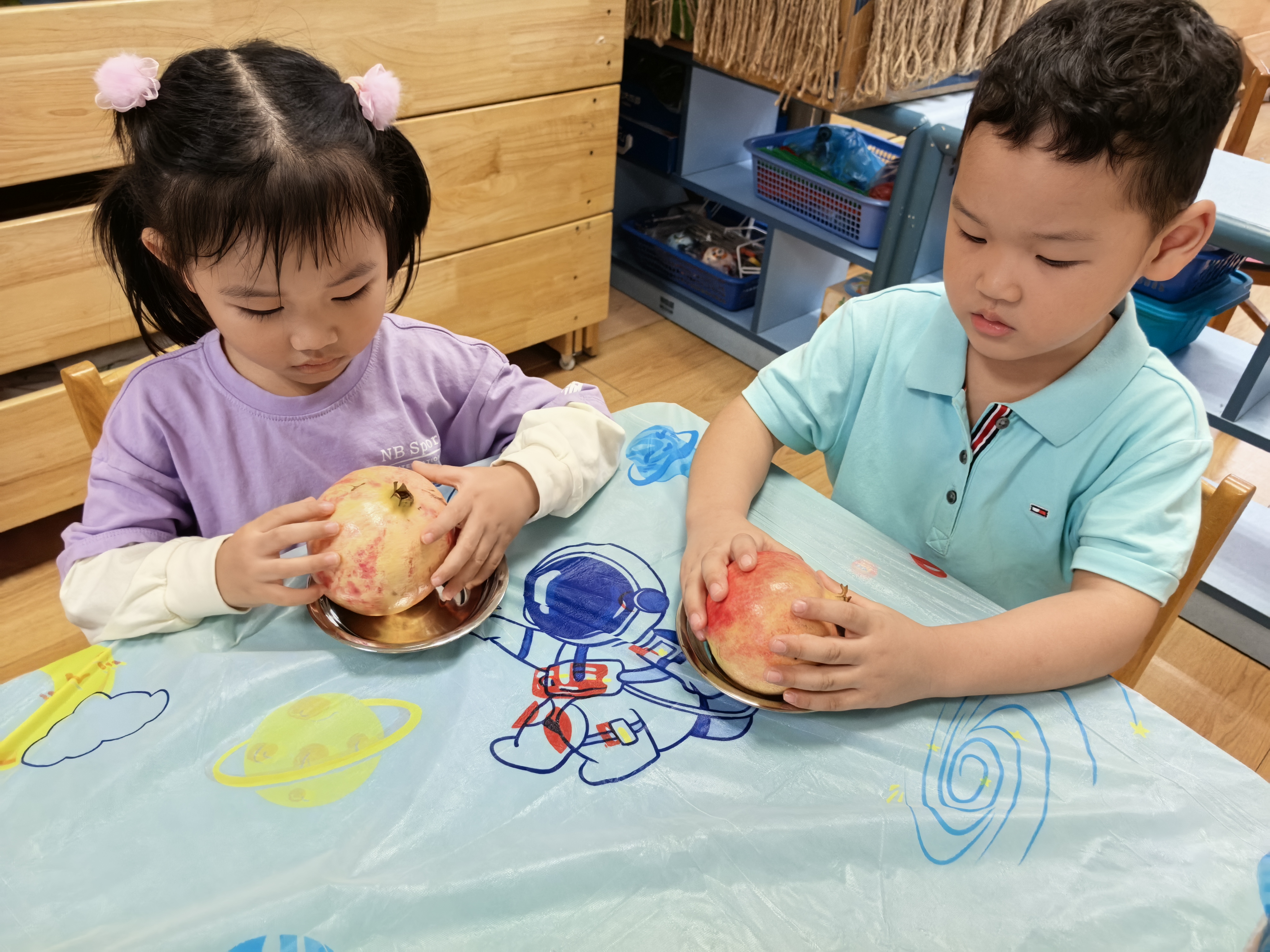 寒露时节的石榴最为香甜,挂满枝头,像一个个红彤彤的小灯笼。孩子们围坐在一起,仔细观察石榴的外形,触摸果皮,你一言我一语地分享自己对石榴的印象。