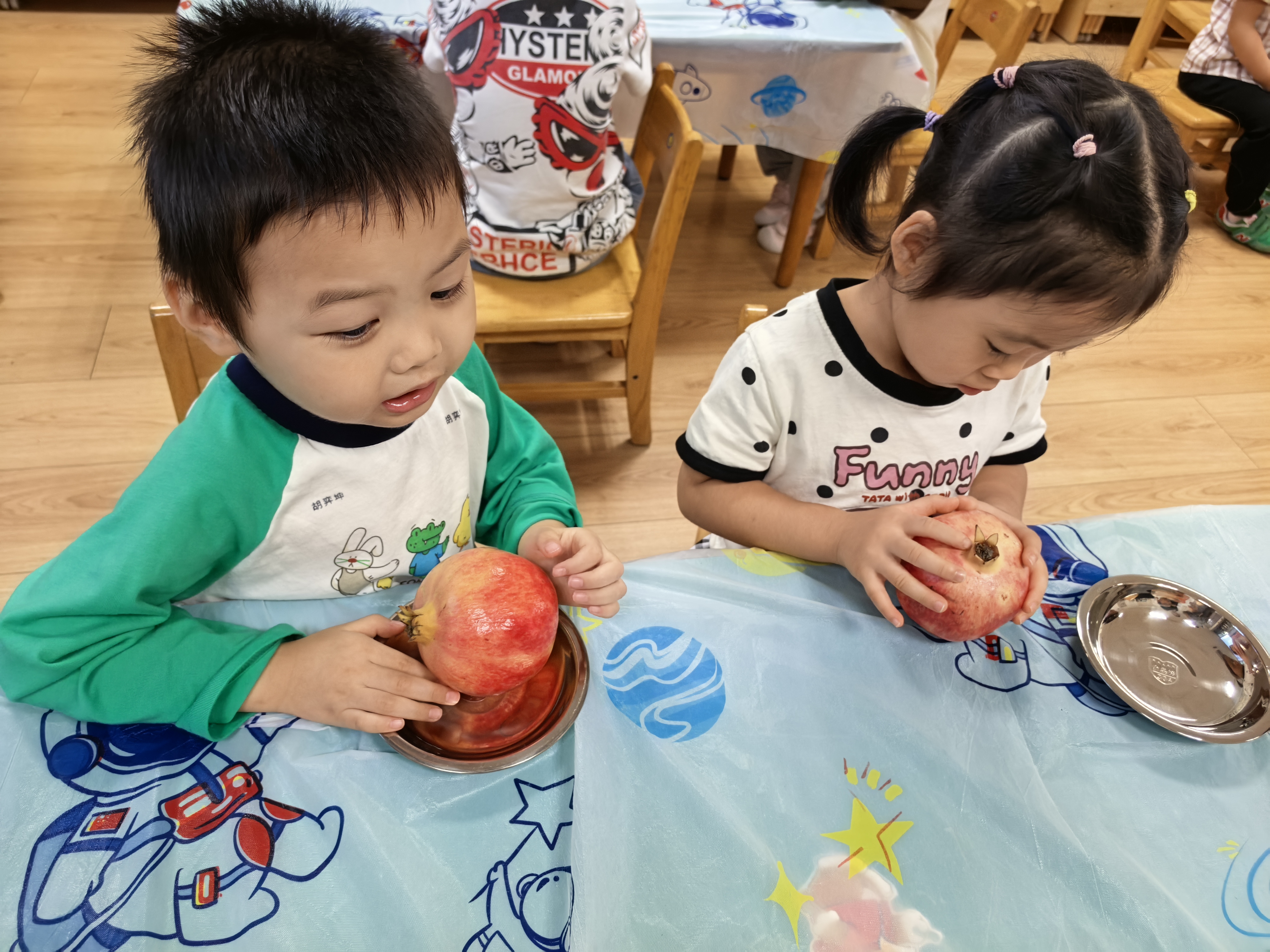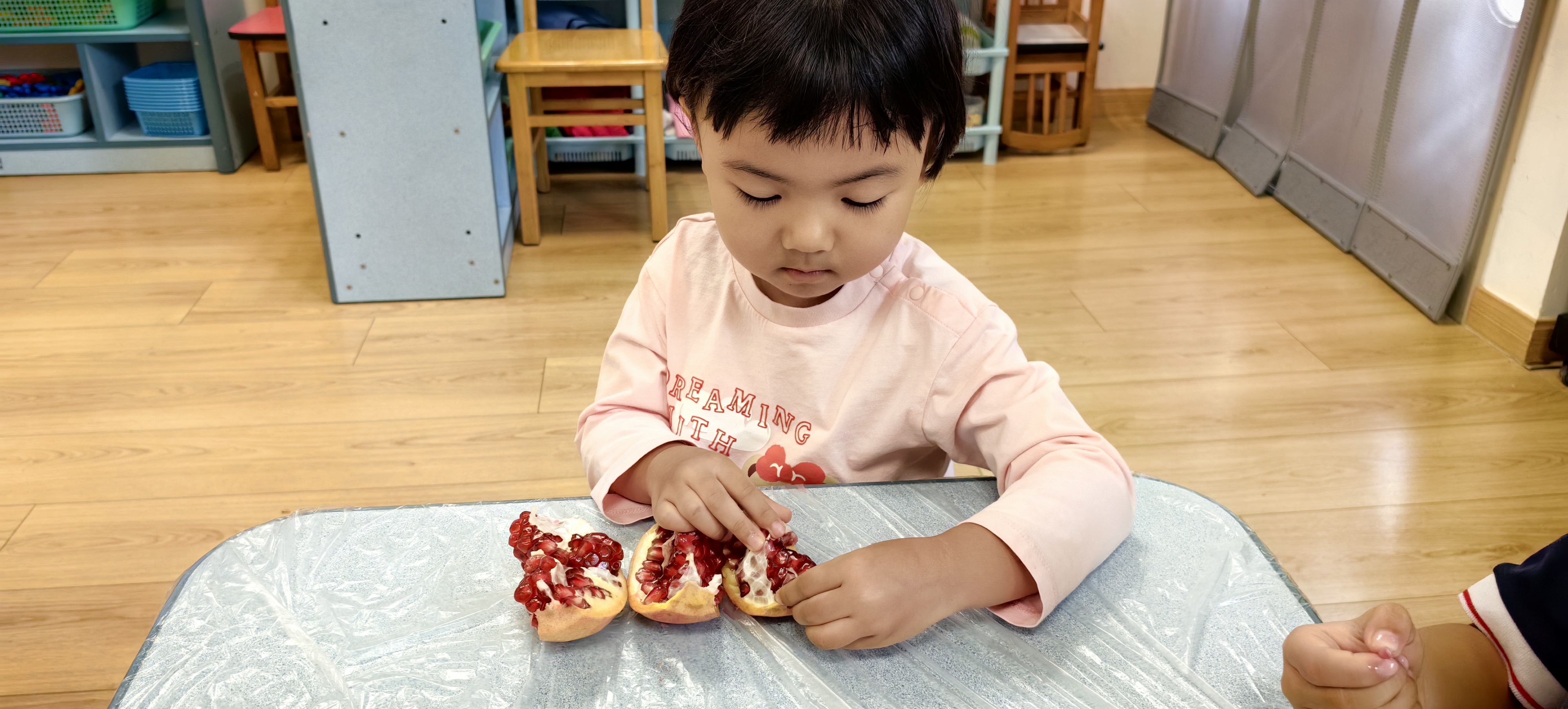 接着,大家一同探索剥石榴的方法。学会之后,孩子们用灵巧的小手剥开果皮,露出里面晶莹饱满的果粒。孩子们不仅锻炼了手部精细动作,还品尝到了甜甜的果实。不时有孩子开心地向小伙伴展示:“我的石榴粒最红!”