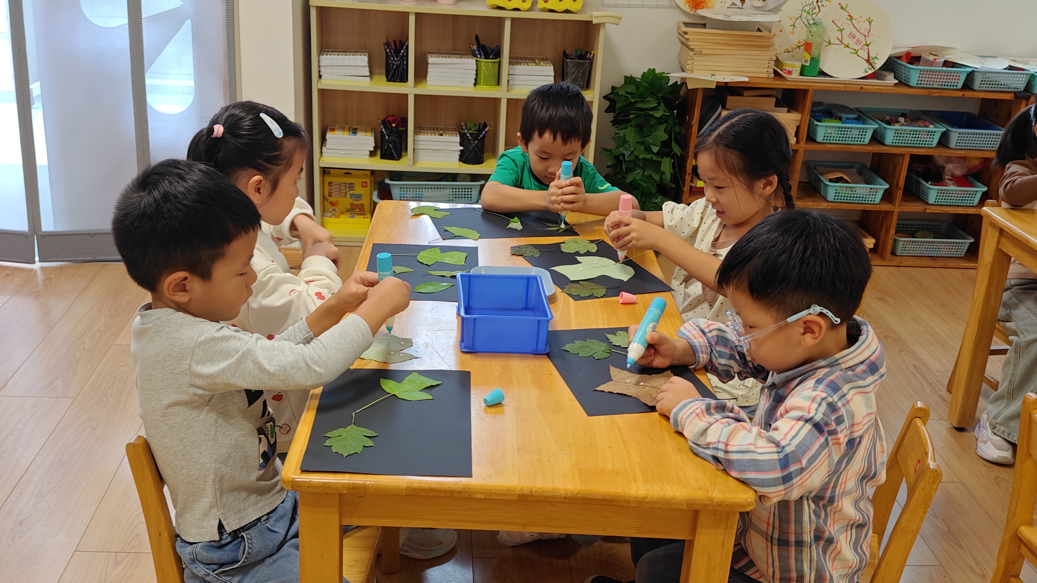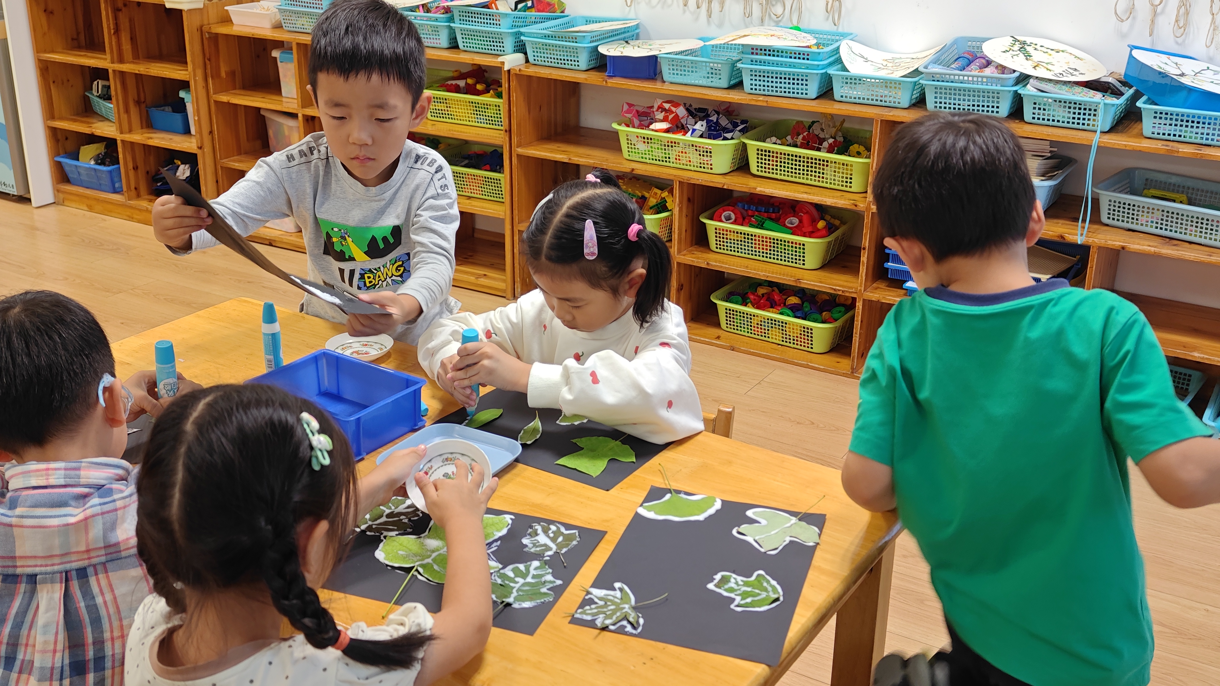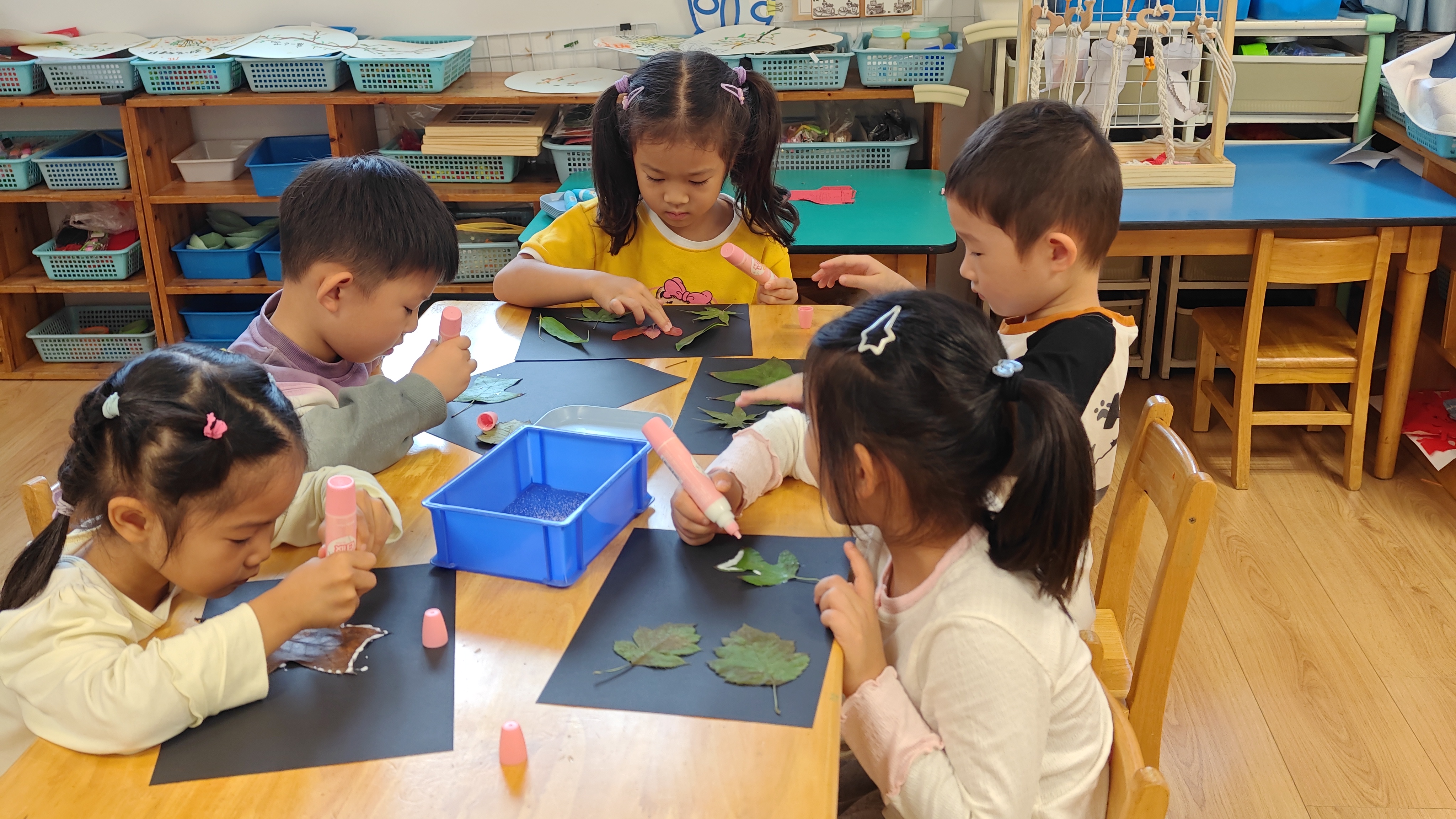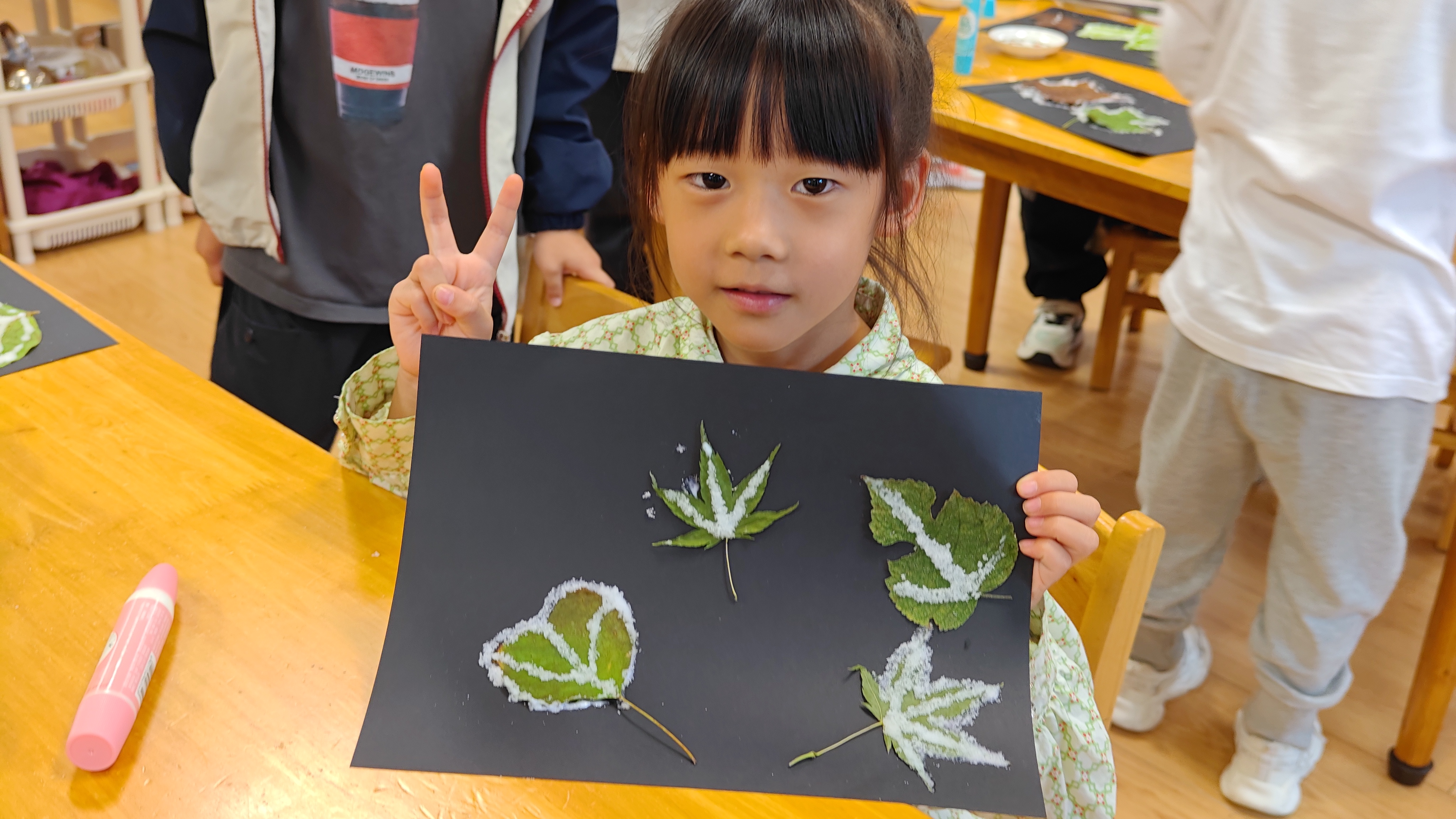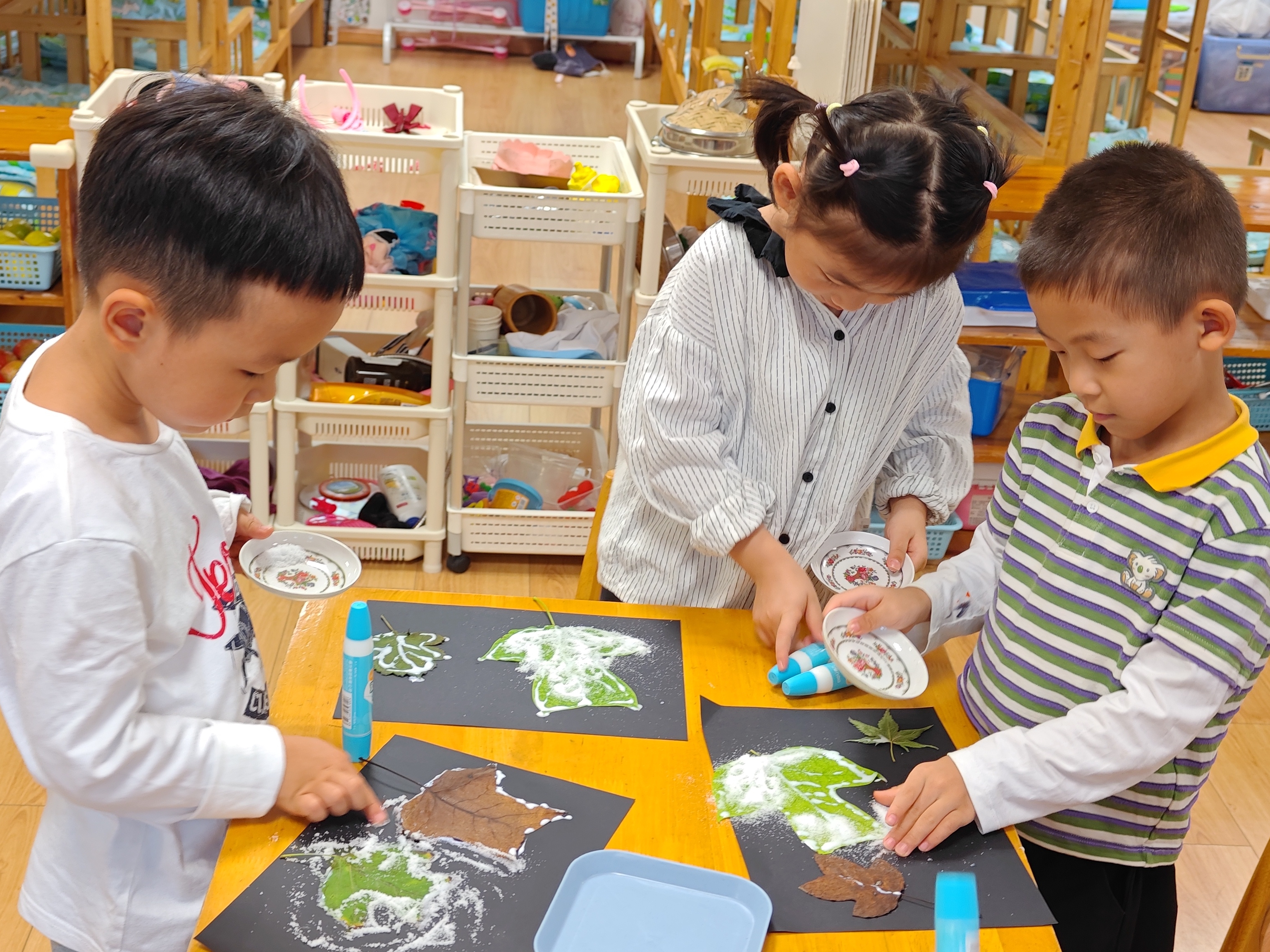 手工活动《盐化树叶》:孩子们变身“小小艺术家”,将落叶轻轻放在深色卡纸上,再用白胶勾勒轮廓,撒上洁白的盐粒——刹那间,盐如凝霜,秋叶“结霜”的画面跃然纸上。
