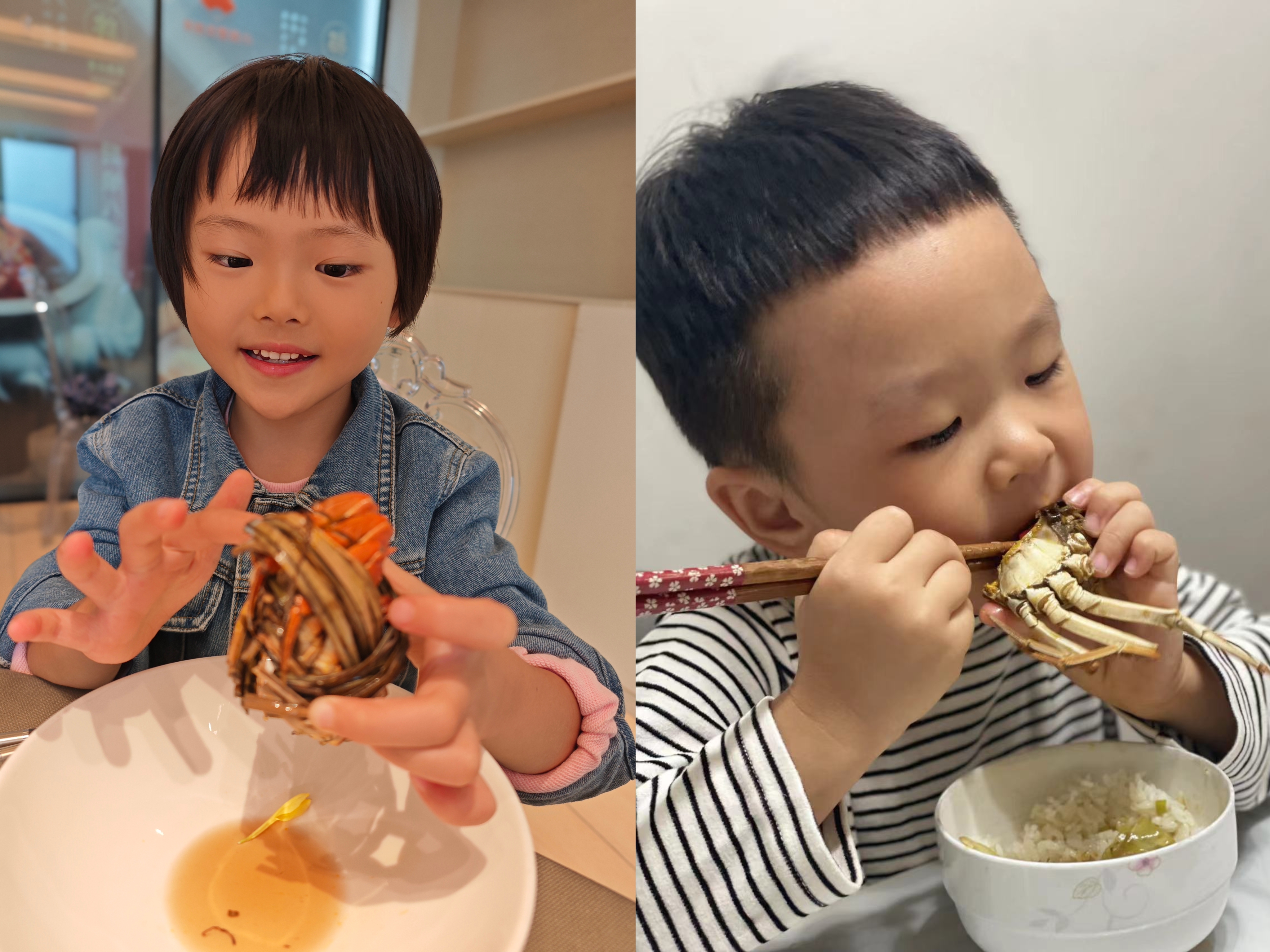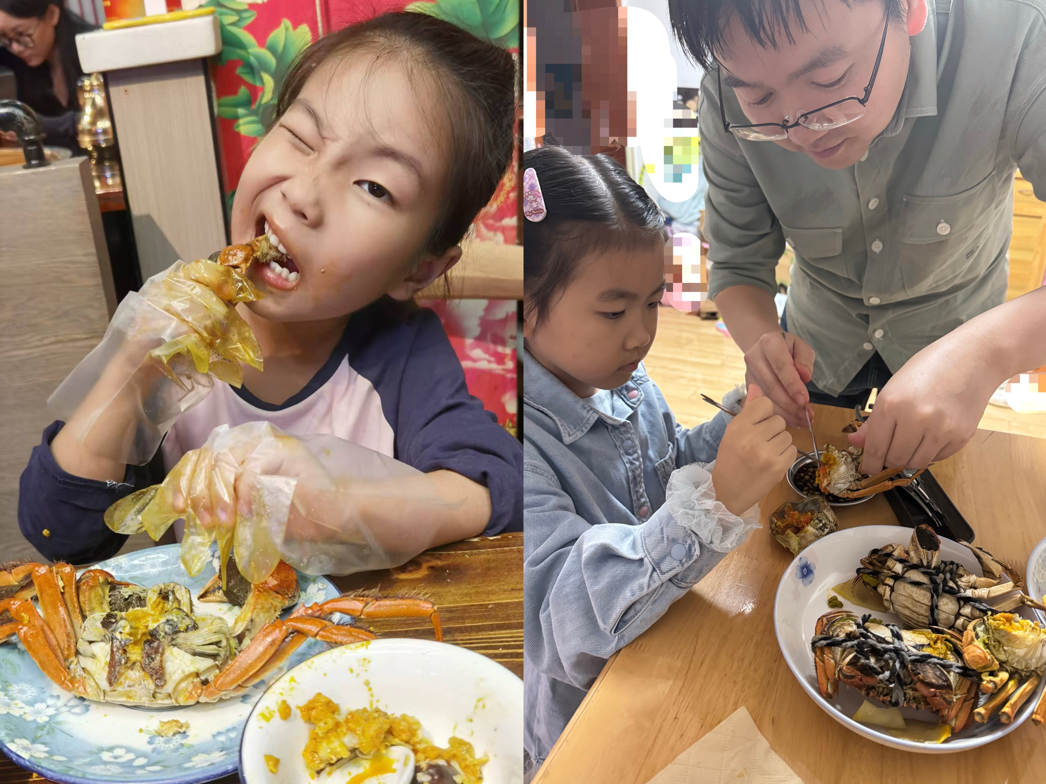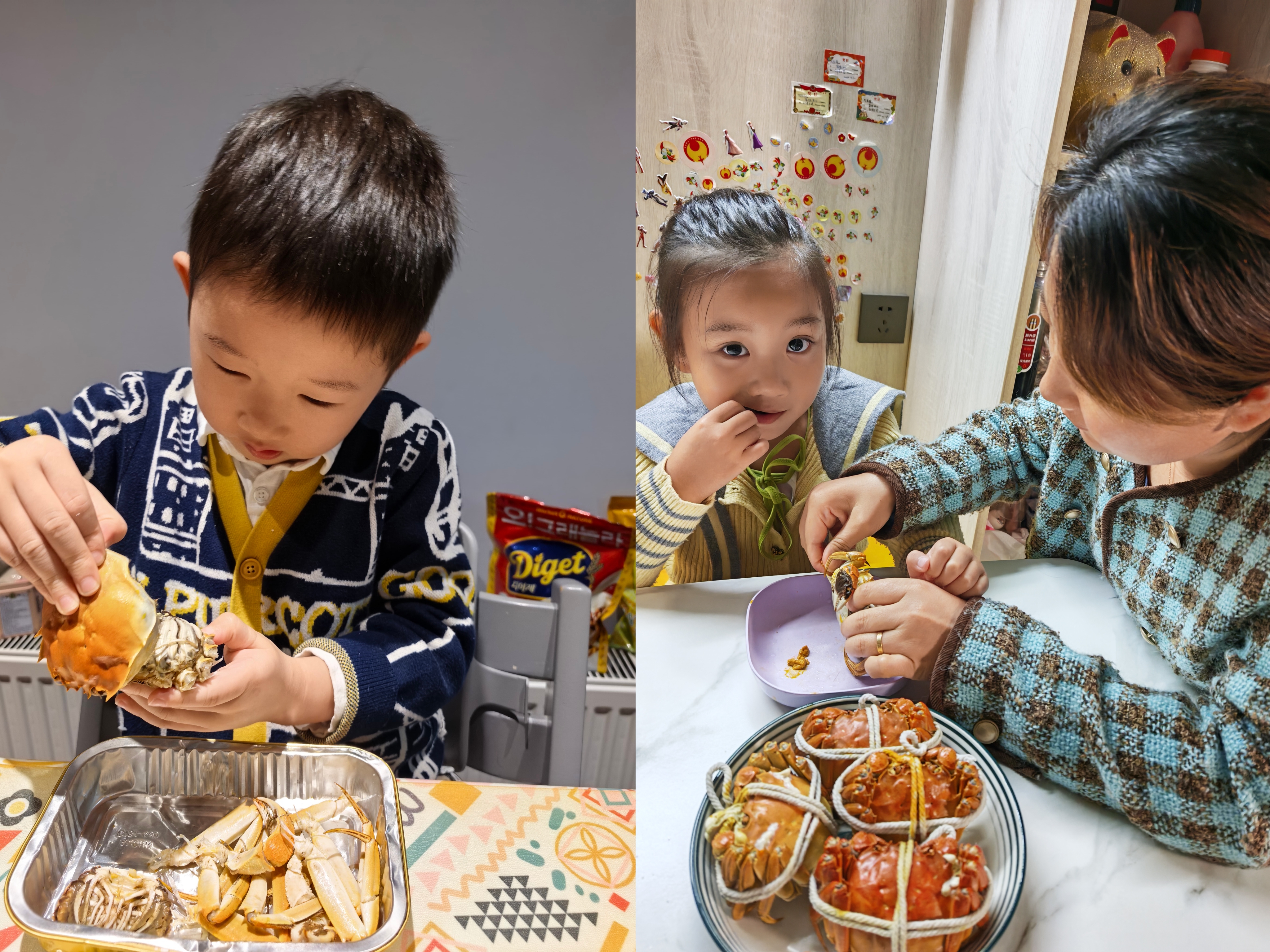 品螃蟹:餐桌上,螃蟹飘香。家长耐心讲解螃蟹的结构,示范如何剥蟹。孩子们品尝着鲜美的蟹肉,脸上洋溢着满足与幸福的笑容。