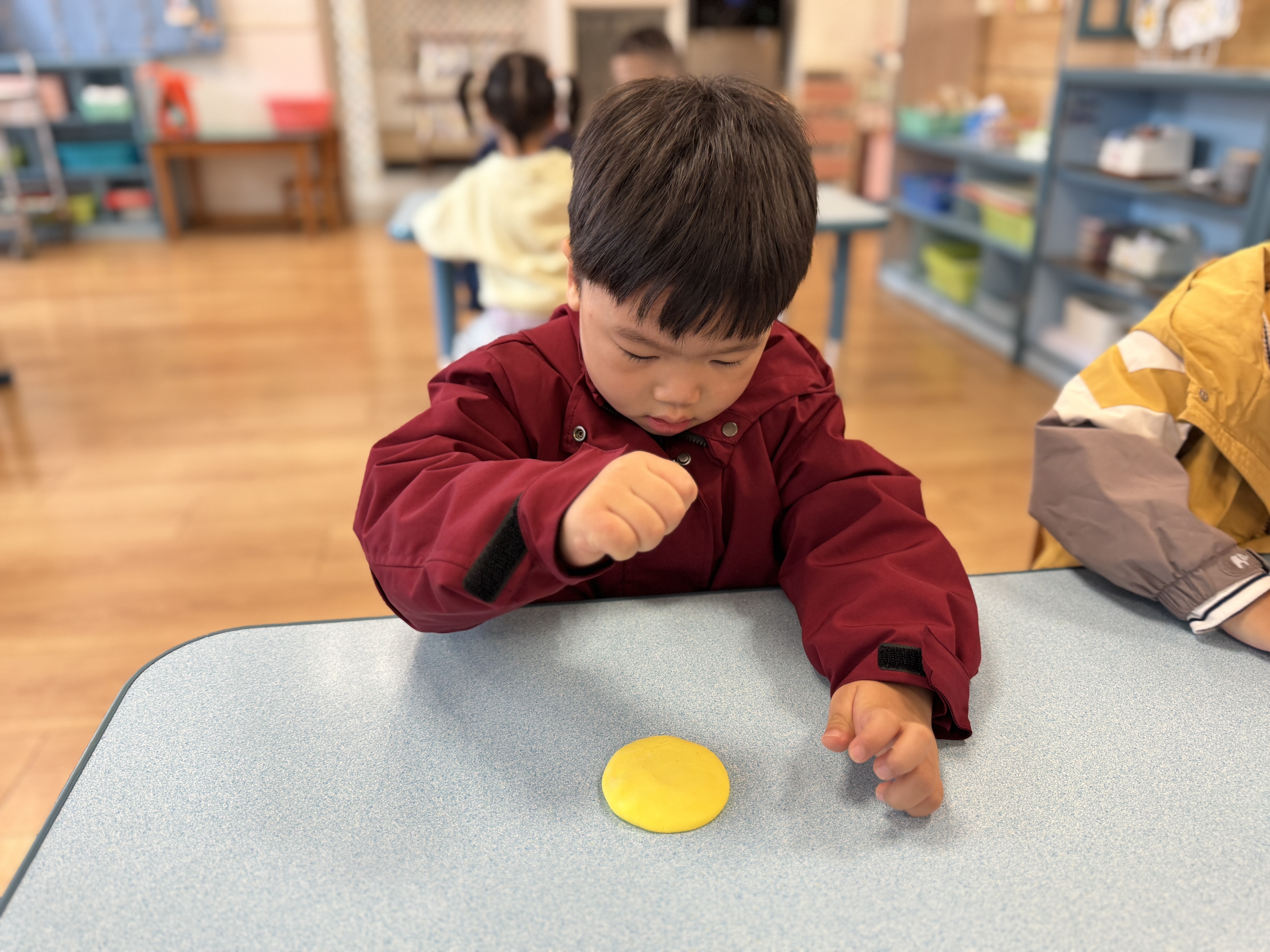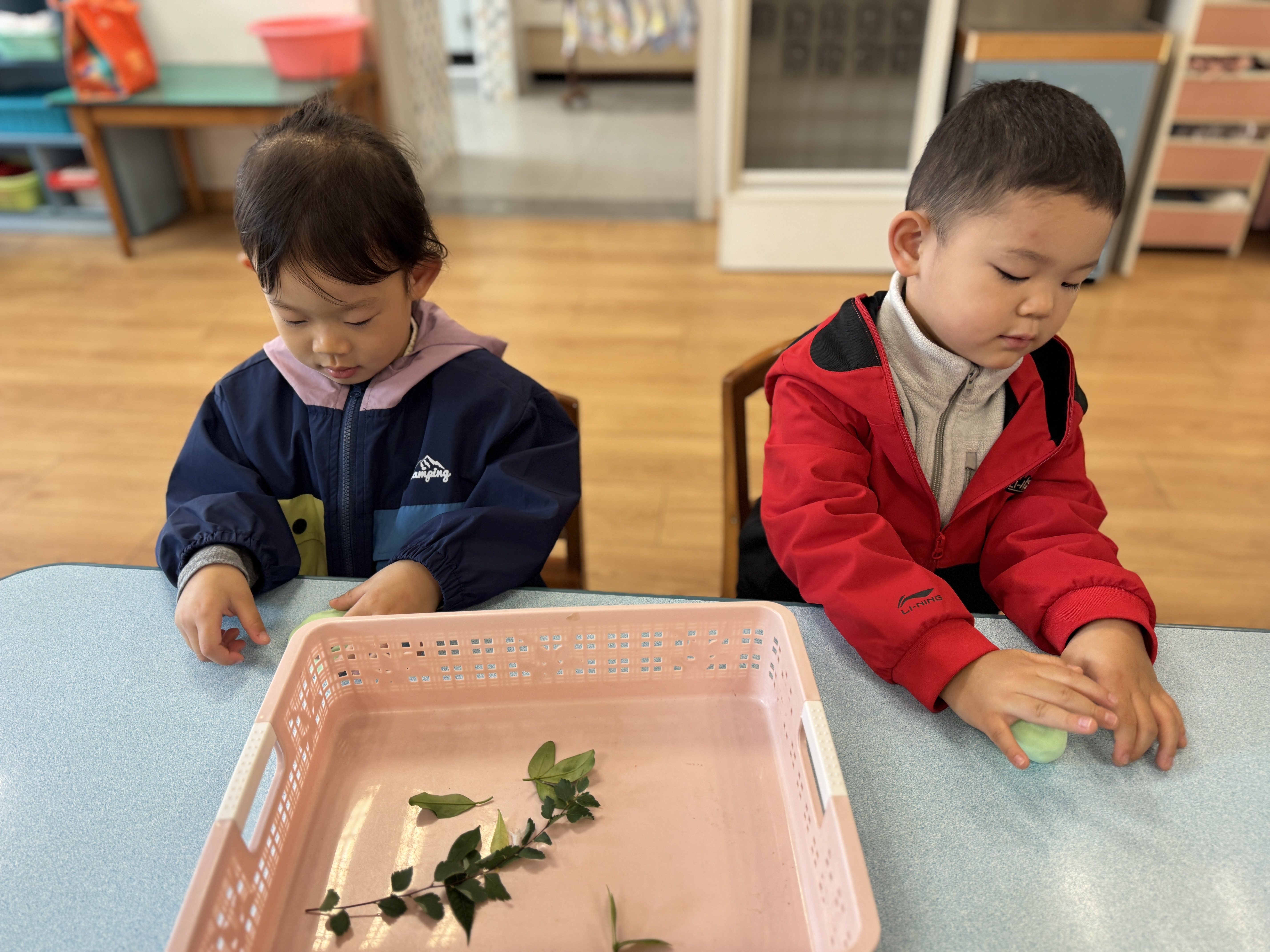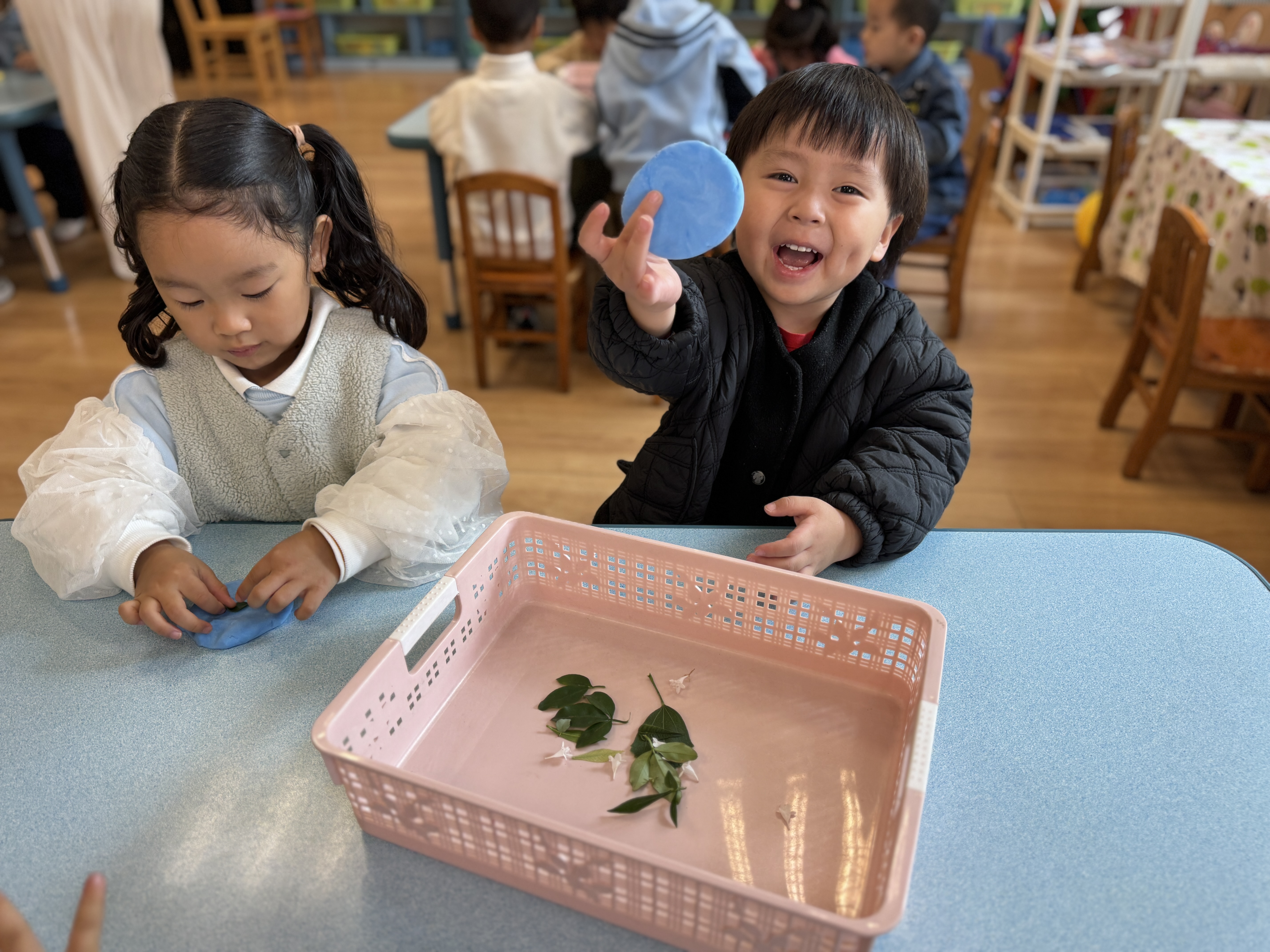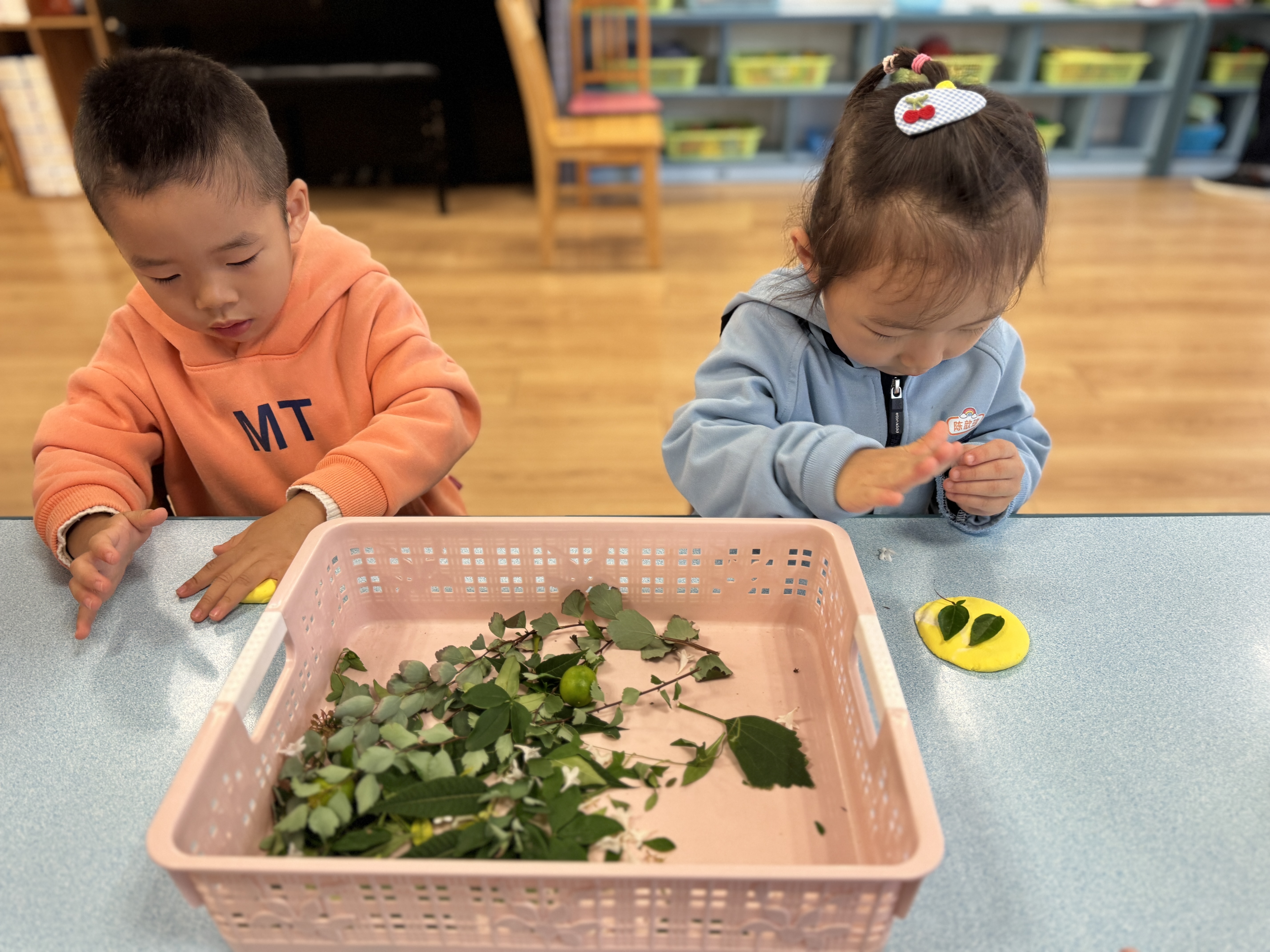 手工《花叶挂牌》:手工制作《花叶挂牌》环节,孩子们将粘土塑成饼状,再将提前收集的秋日花叶轻轻嵌入,制作成独一无二的自然挂牌。这份亲手制作的礼物,将成为送给爷爷奶奶的专属祝福。