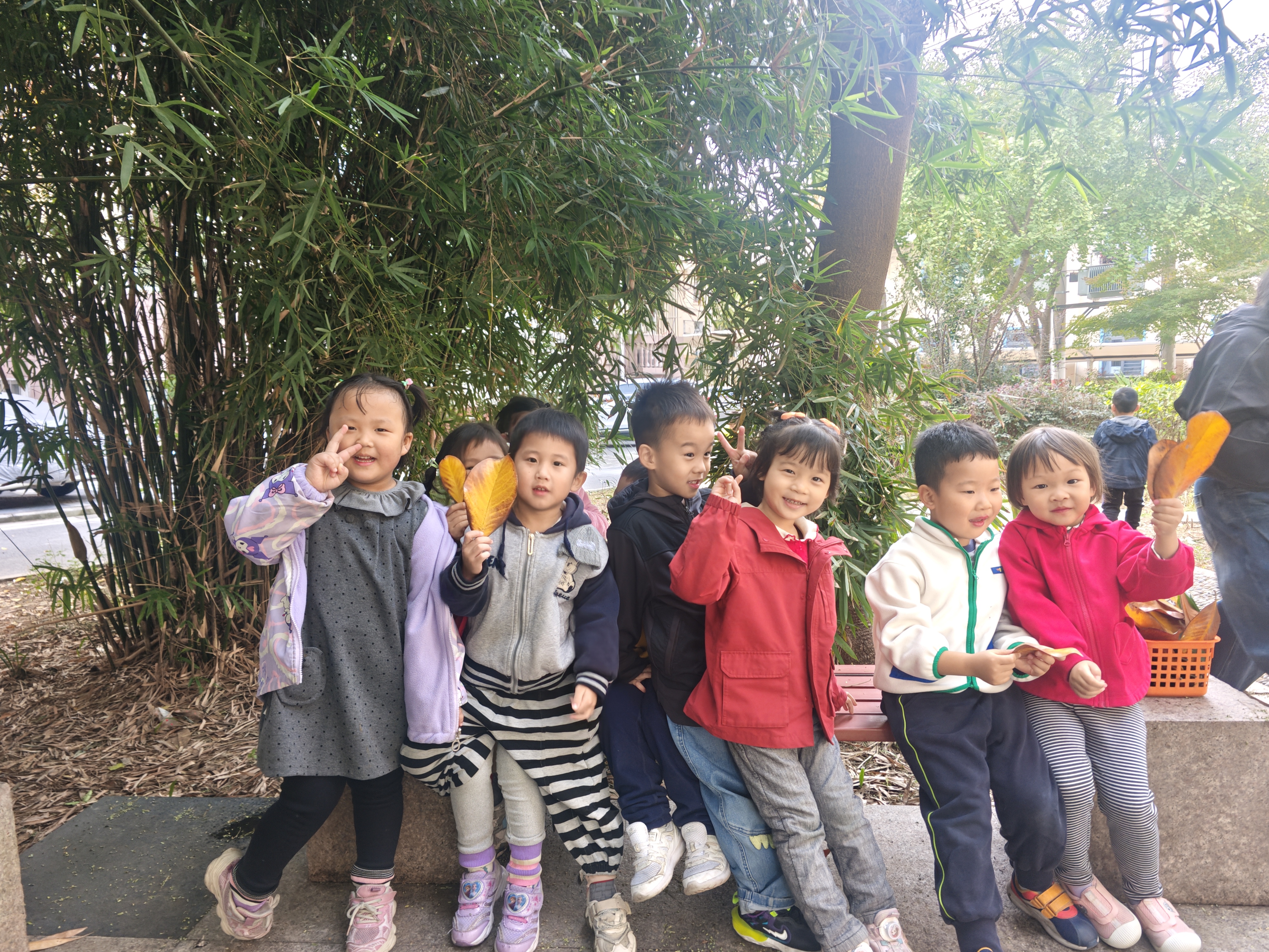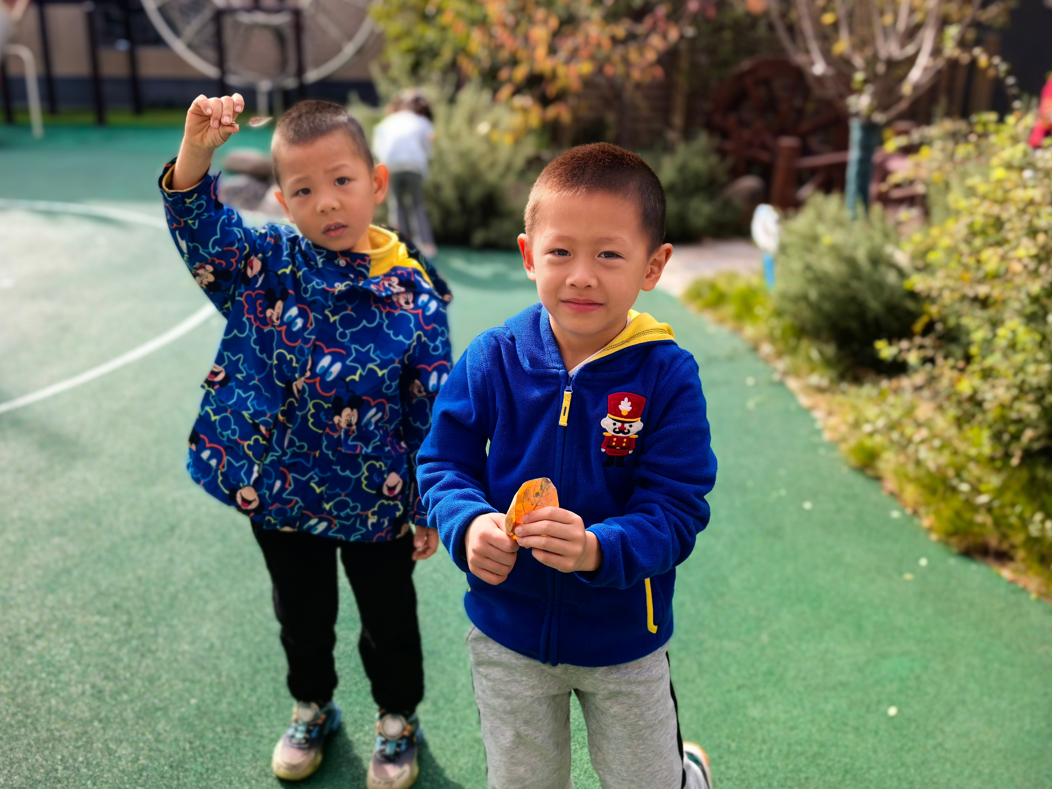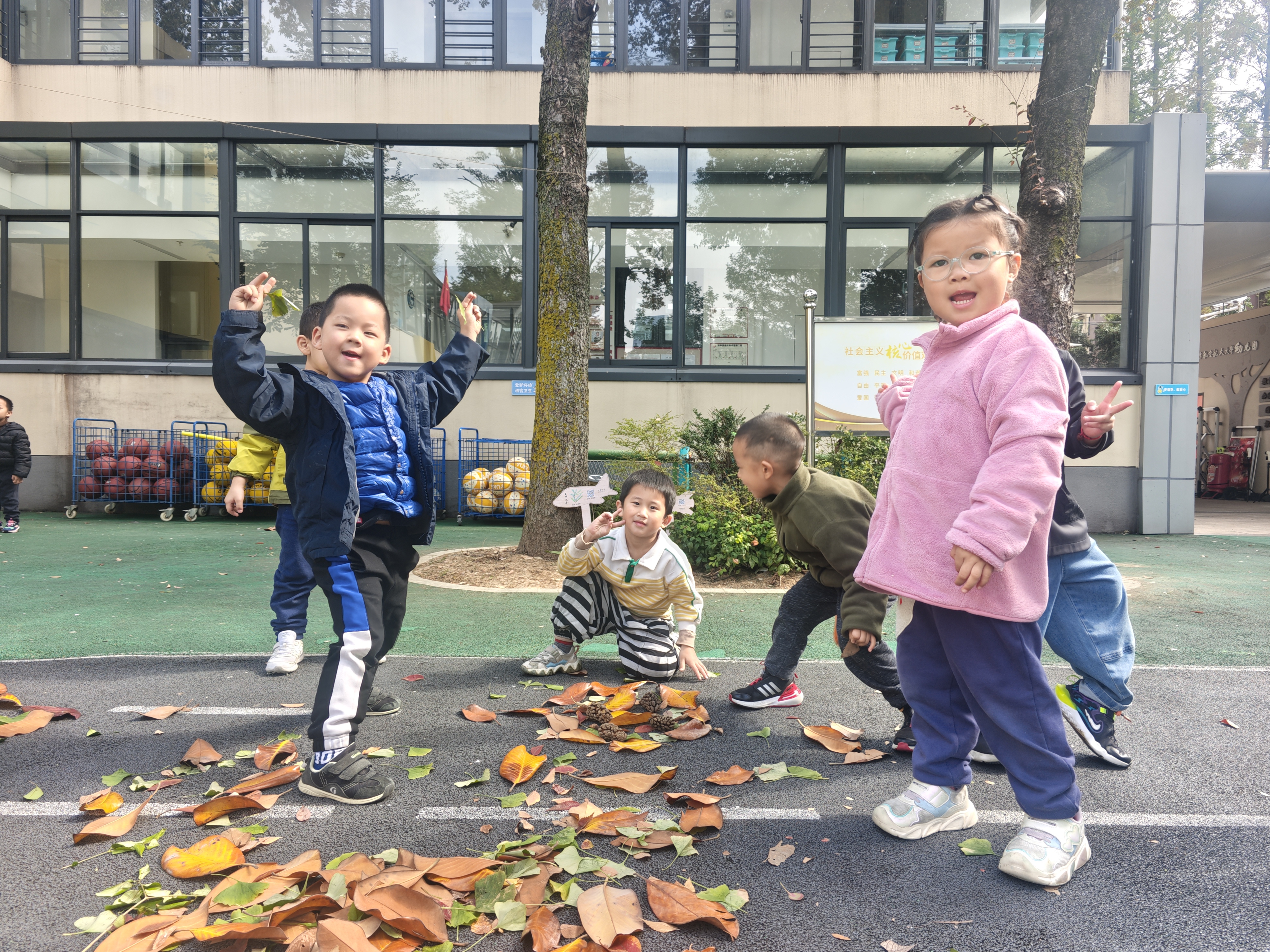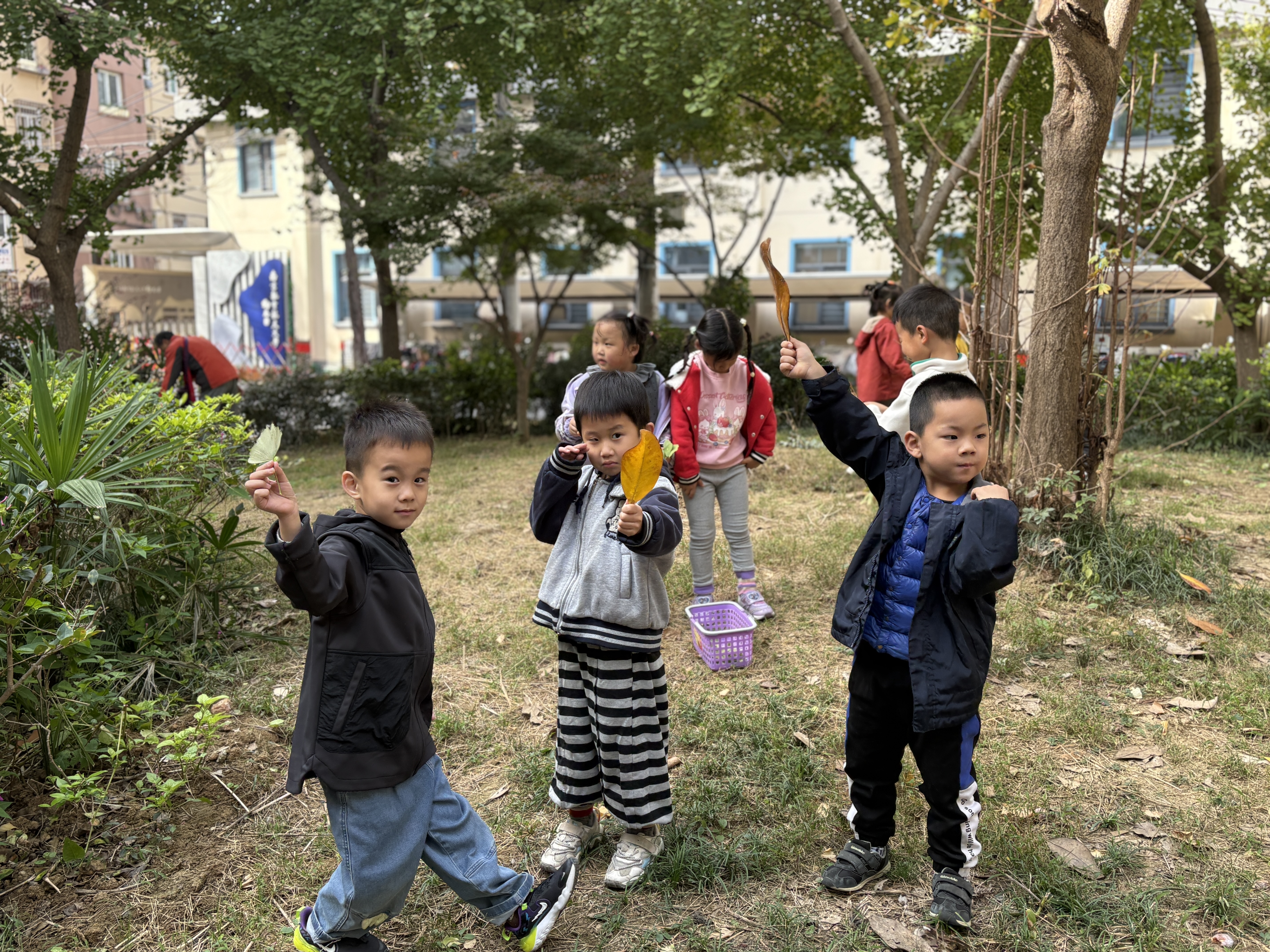 捡拾落叶:孩子们兴致勃勃地捡拾落叶,有的小心翼翼捧在手心,有的欢快地扬起一场“落叶雨”,在自然的怀抱中感受初冬的诗意与美好。