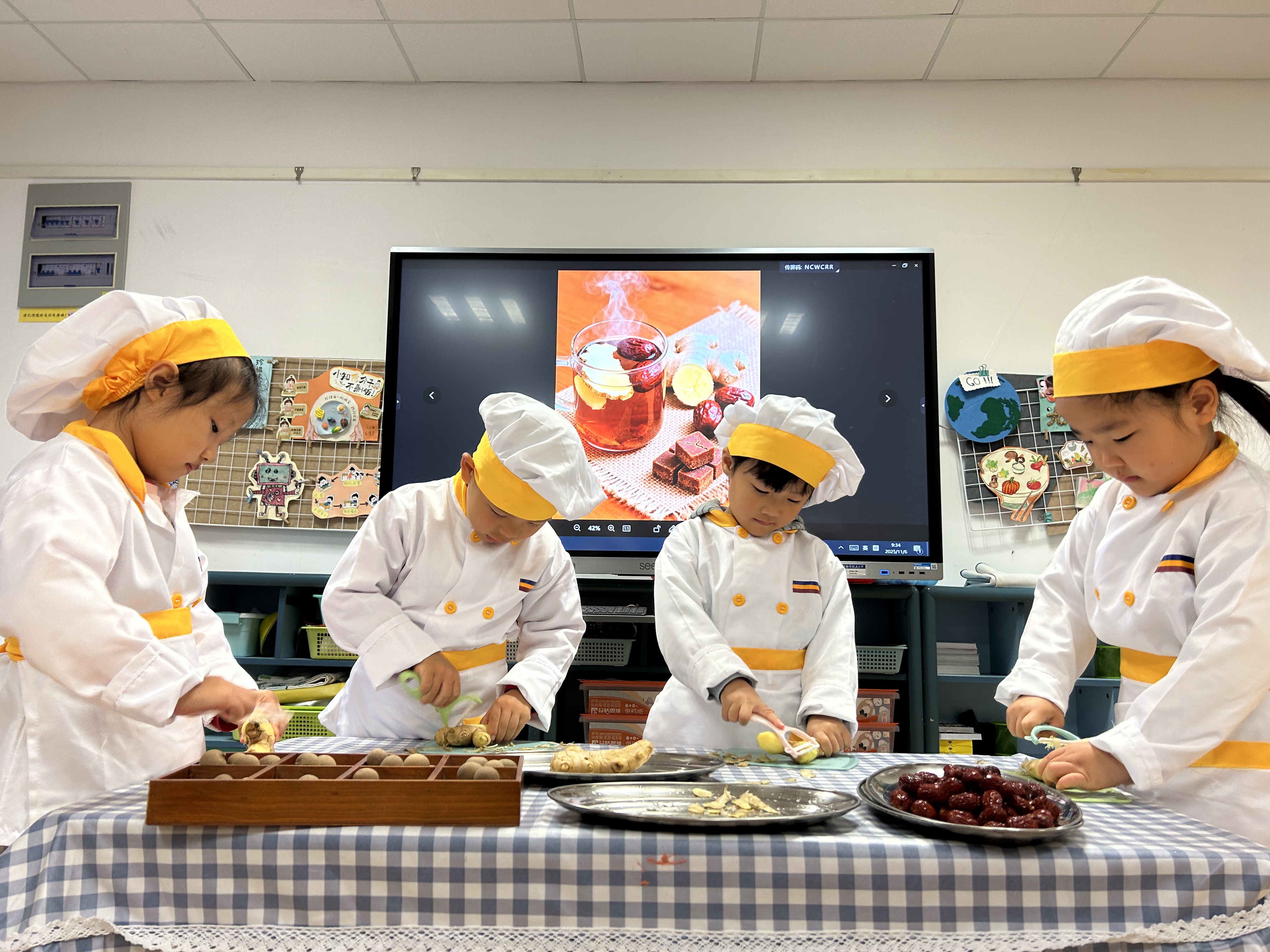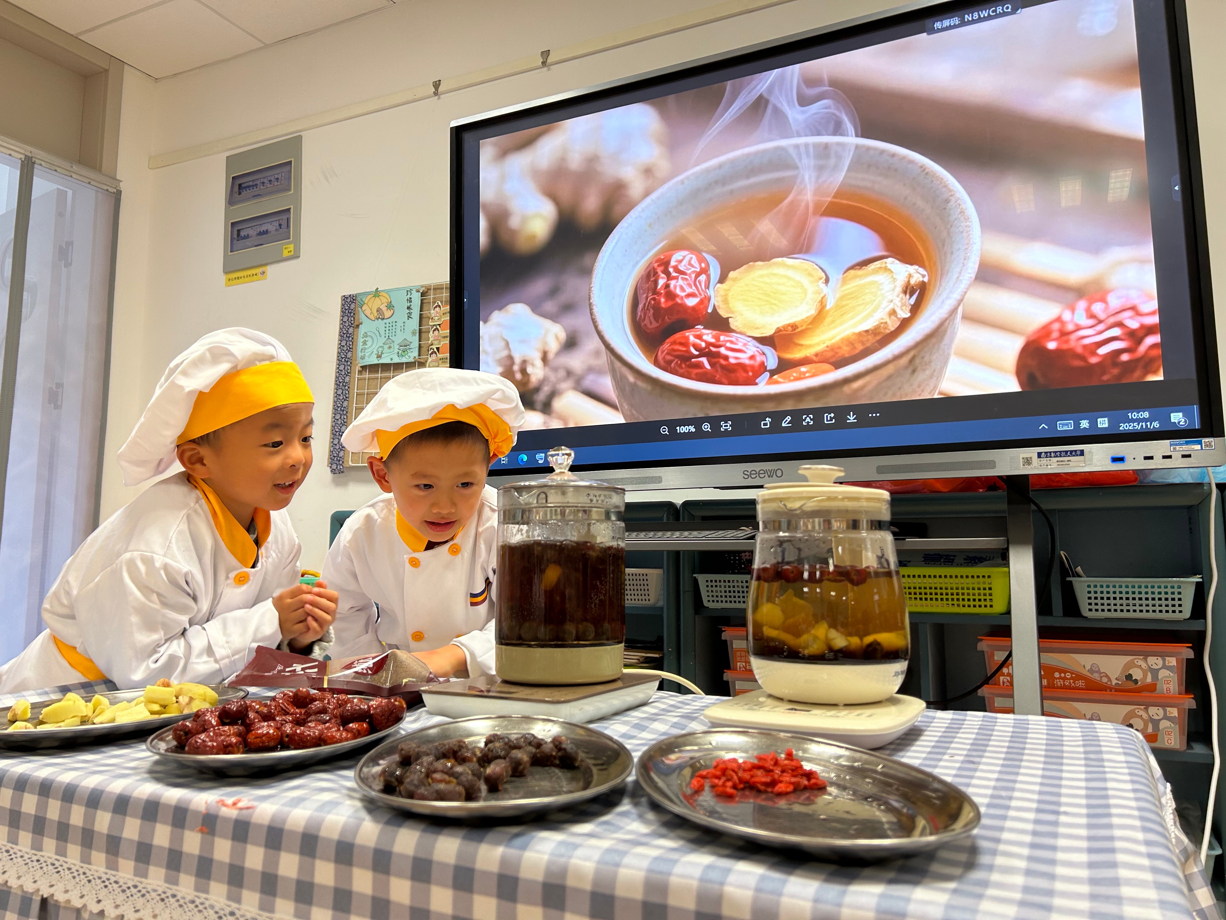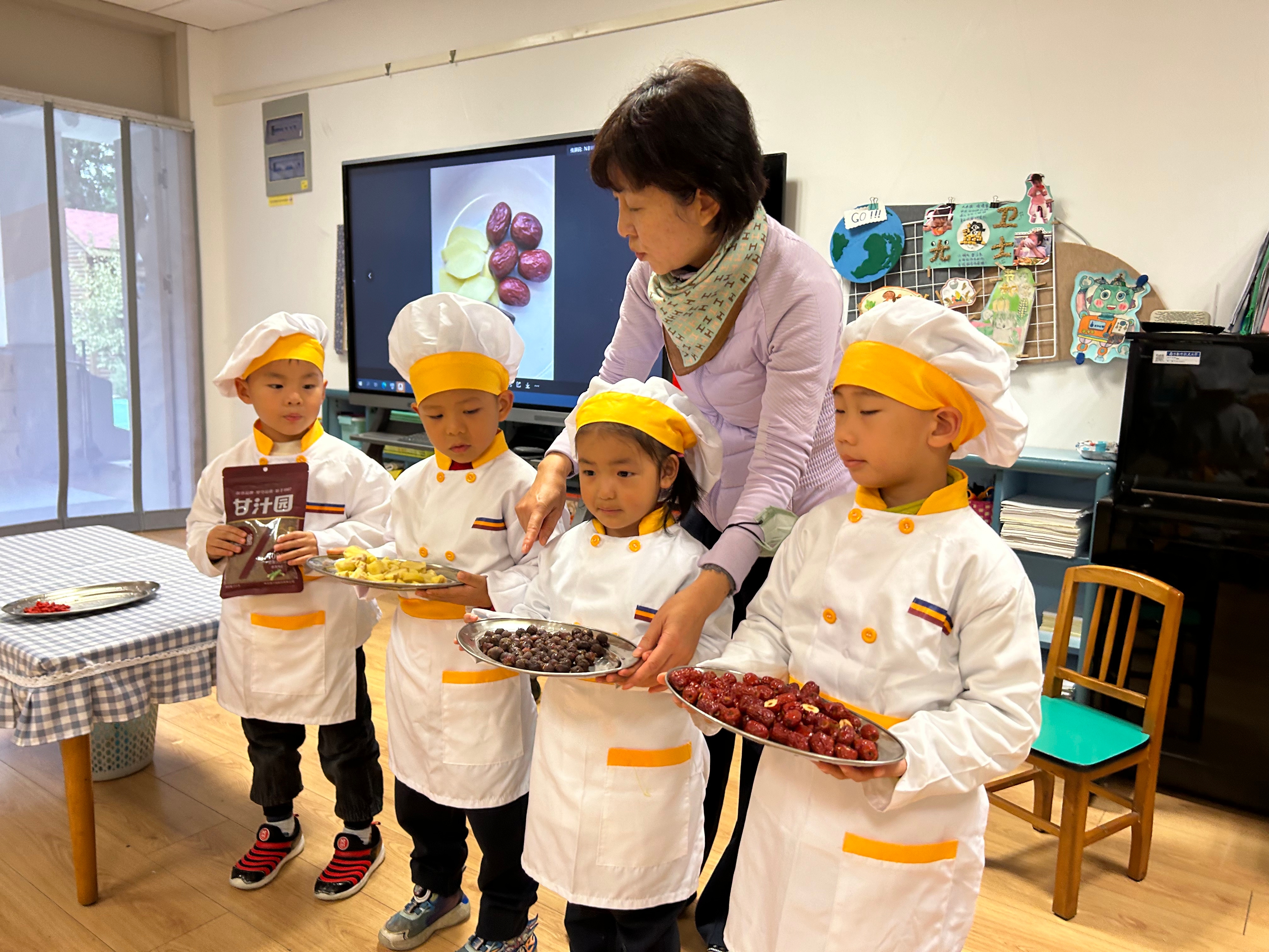 立冬有“温补”的习俗,幼儿园开展了“自制姜枣茶”体验活动。孩子们通过看、摸、闻认识姜、桂圆等食材,亲手完成清洗、剥壳等步骤,再将食材放入养生壶中慢慢烹煮。一杯热气腾腾的茶,不仅驱散了冬日的寒意,更传递出节气里的温情与陪伴。