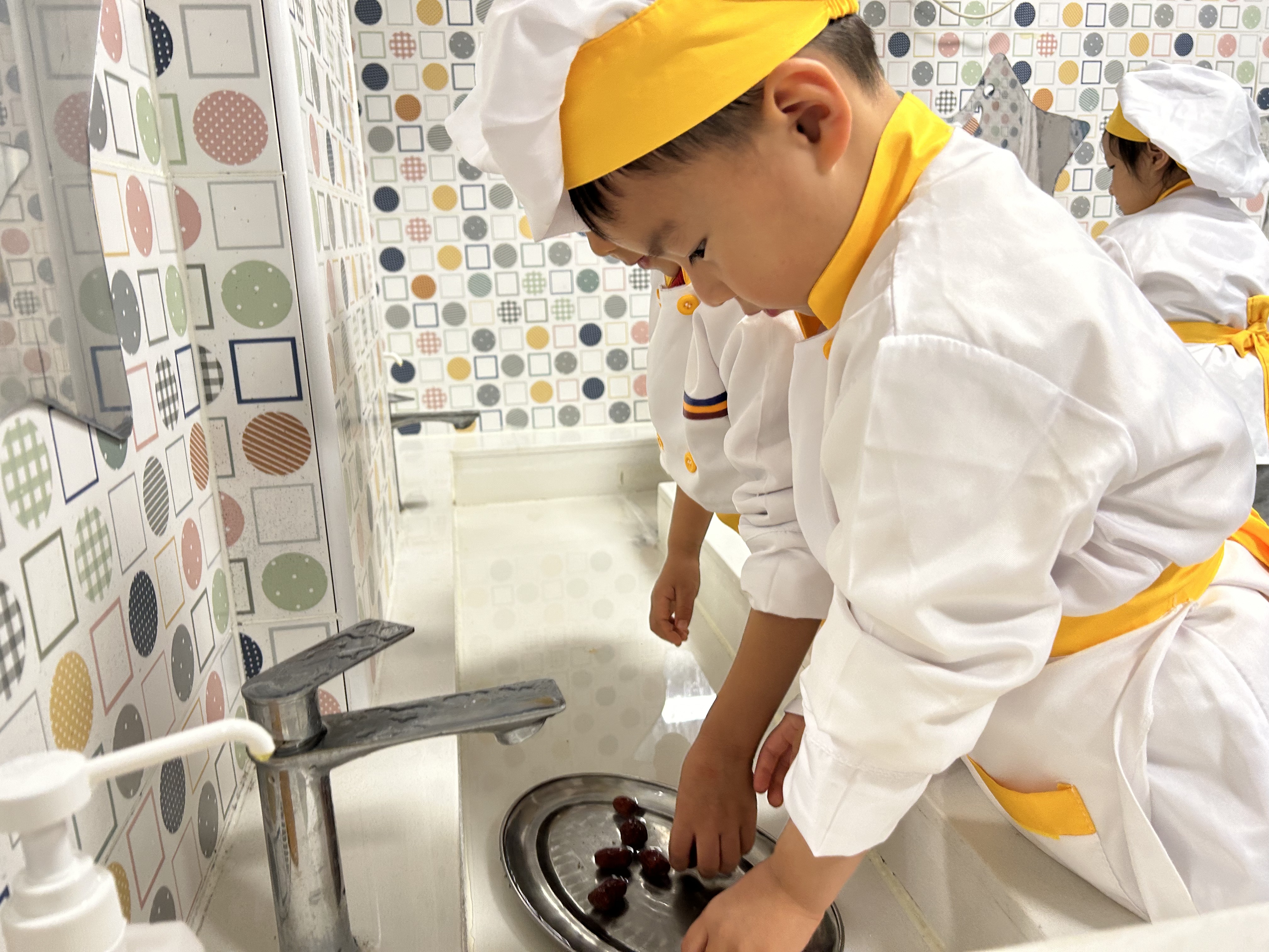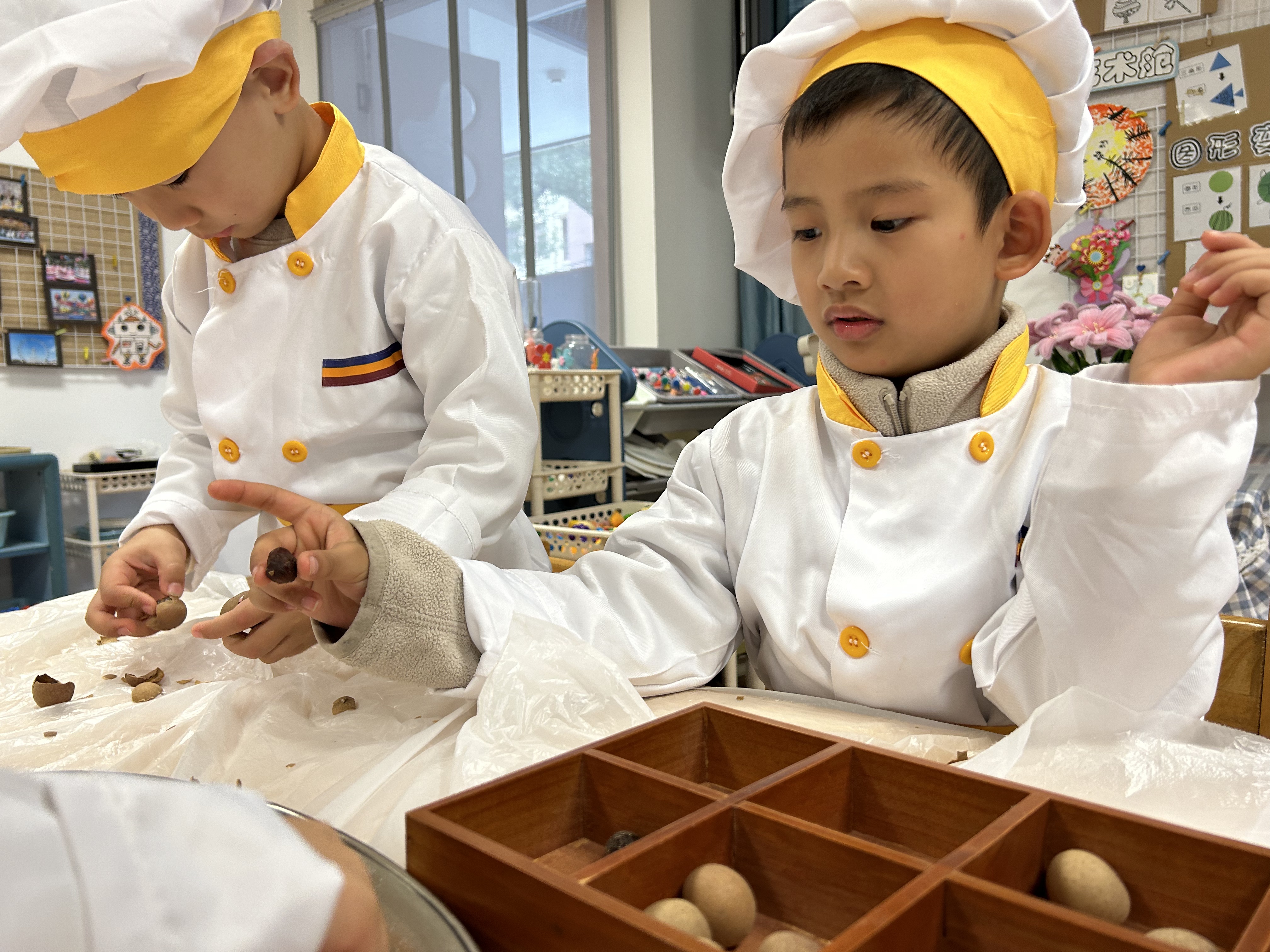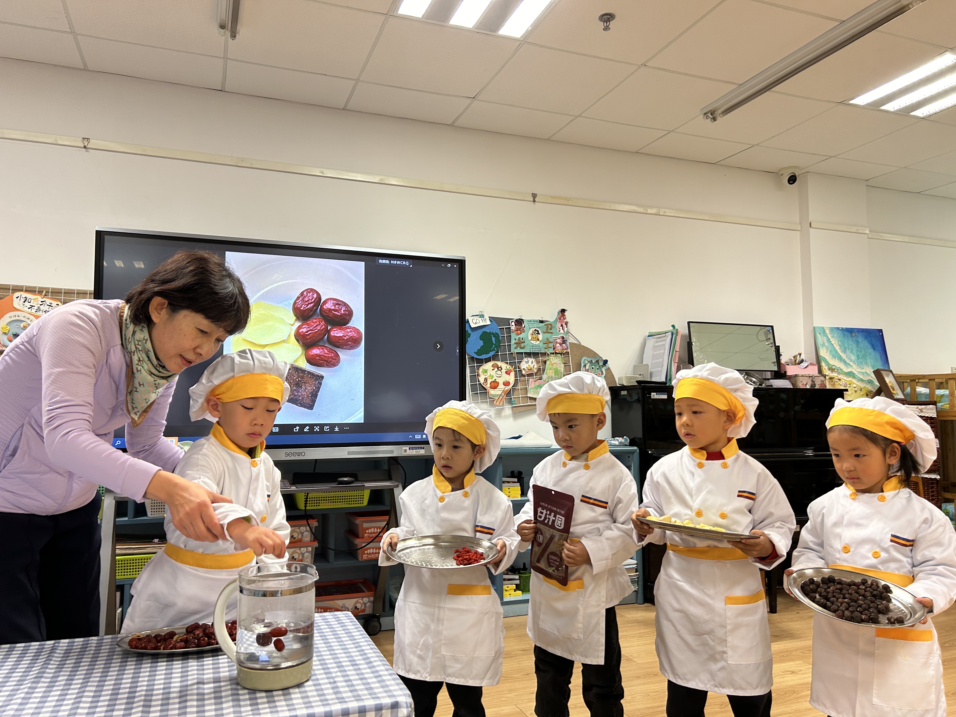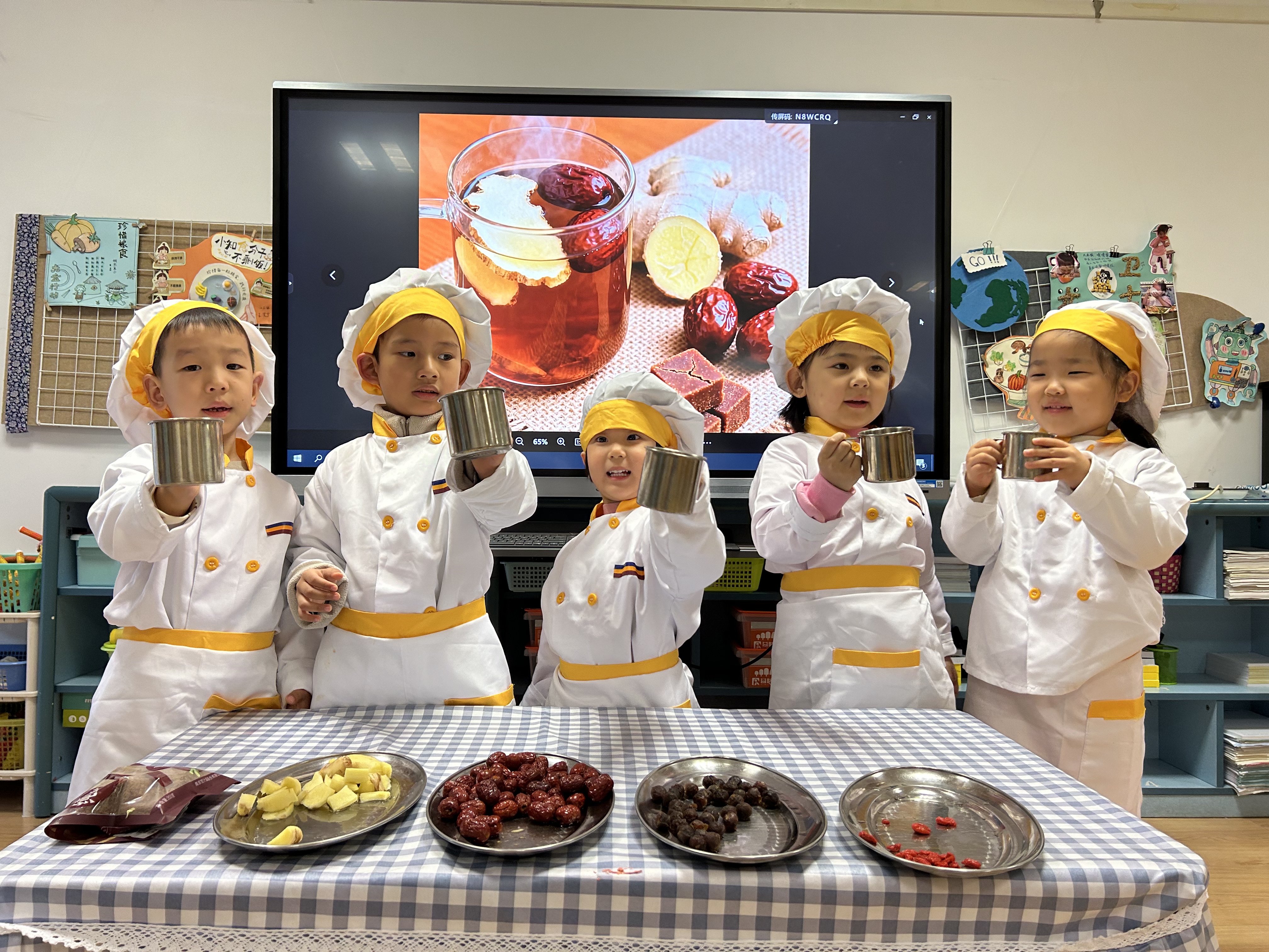立冬有“温补”的习俗,幼儿园开展了“自制姜枣茶”体验活动。孩子们通过看、摸、闻认识姜、桂圆等食材,亲手完成清洗、剥壳等步骤,再将食材放入养生壶中慢慢烹煮。一杯热气腾腾的茶,不仅驱散了冬日的寒意,更传递出节气里的温情与陪伴。