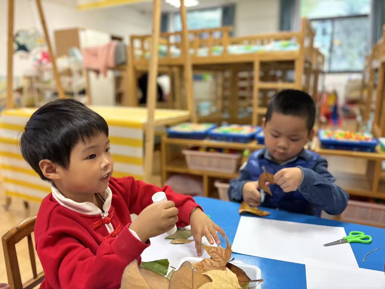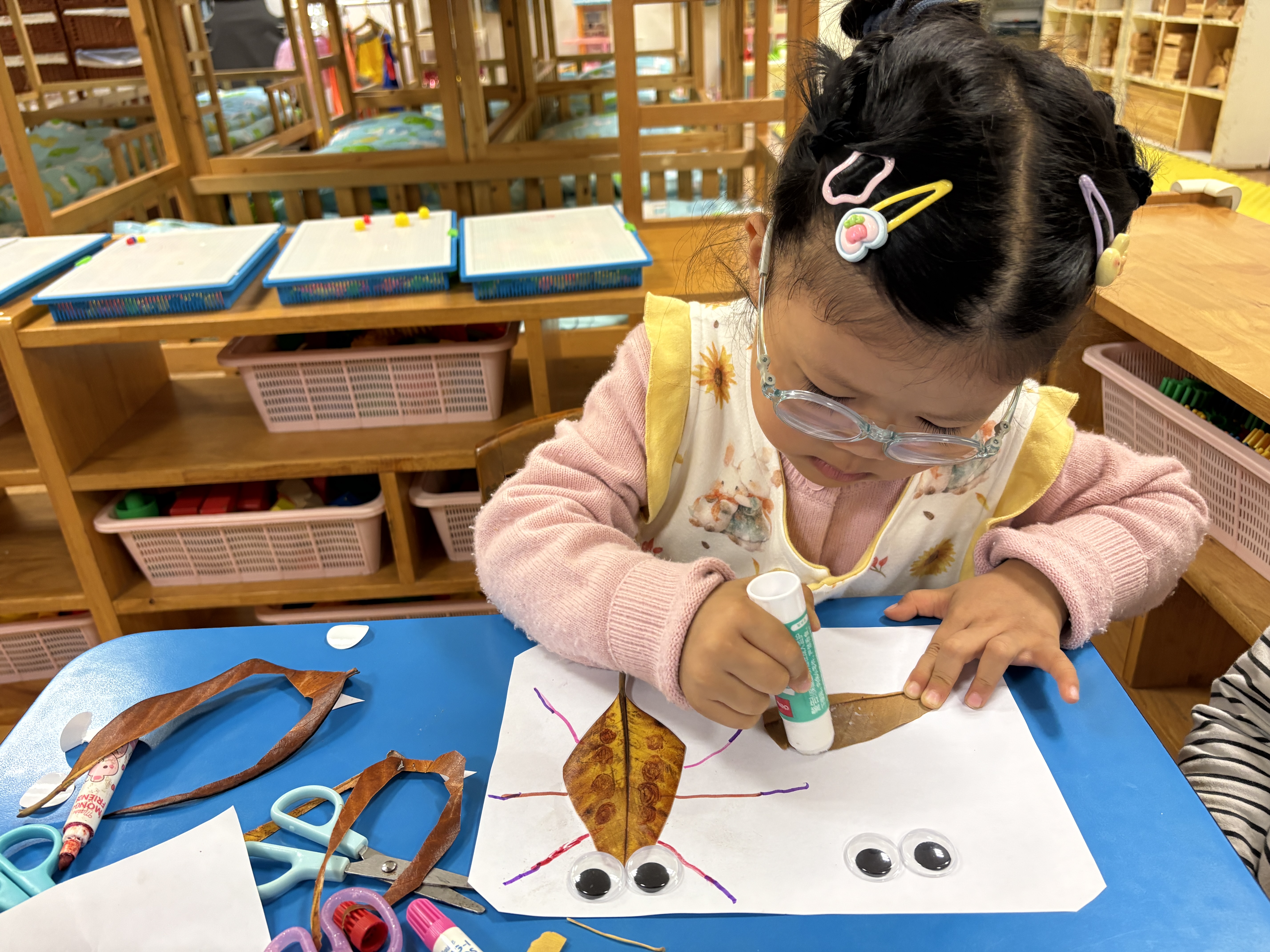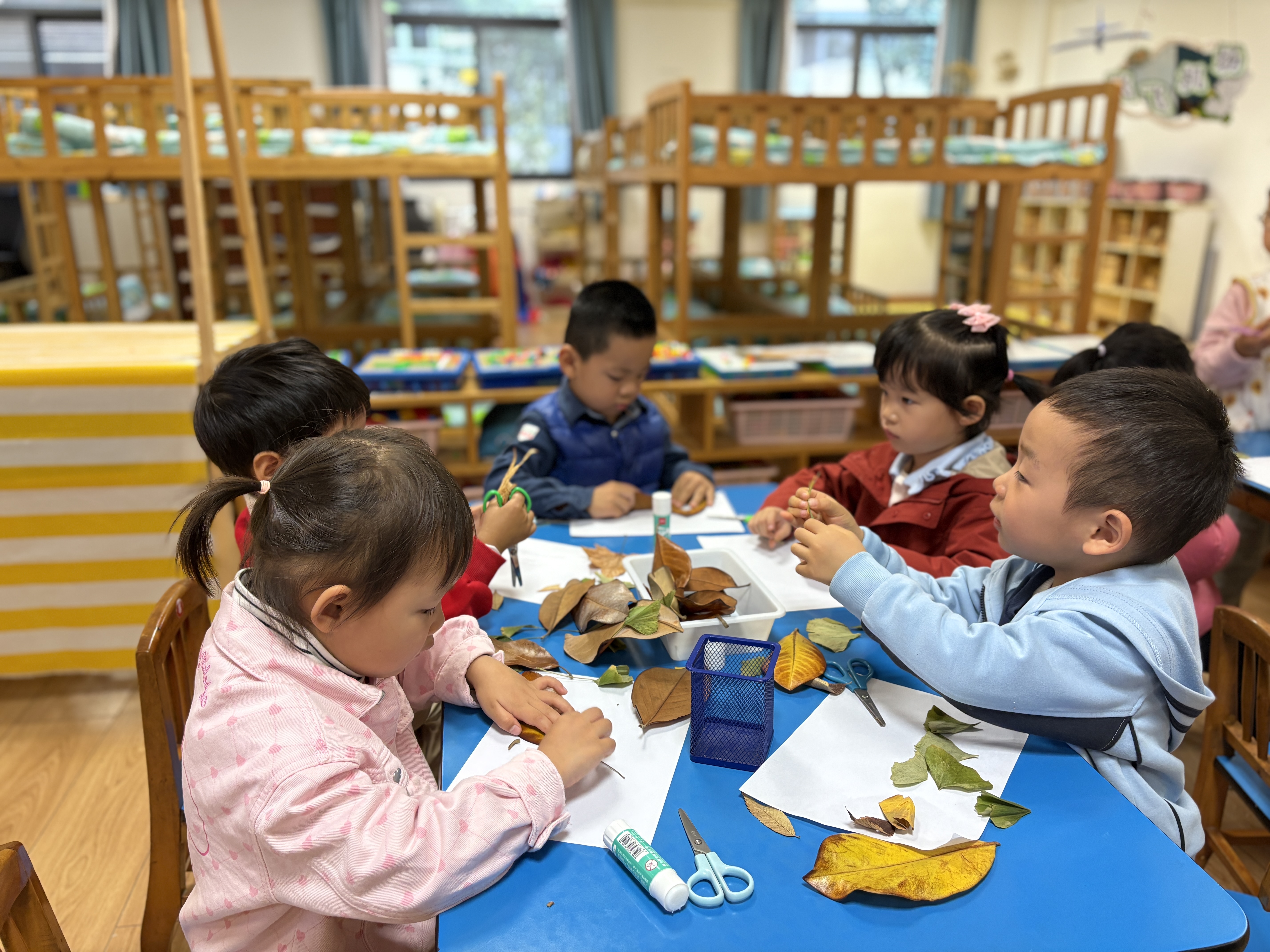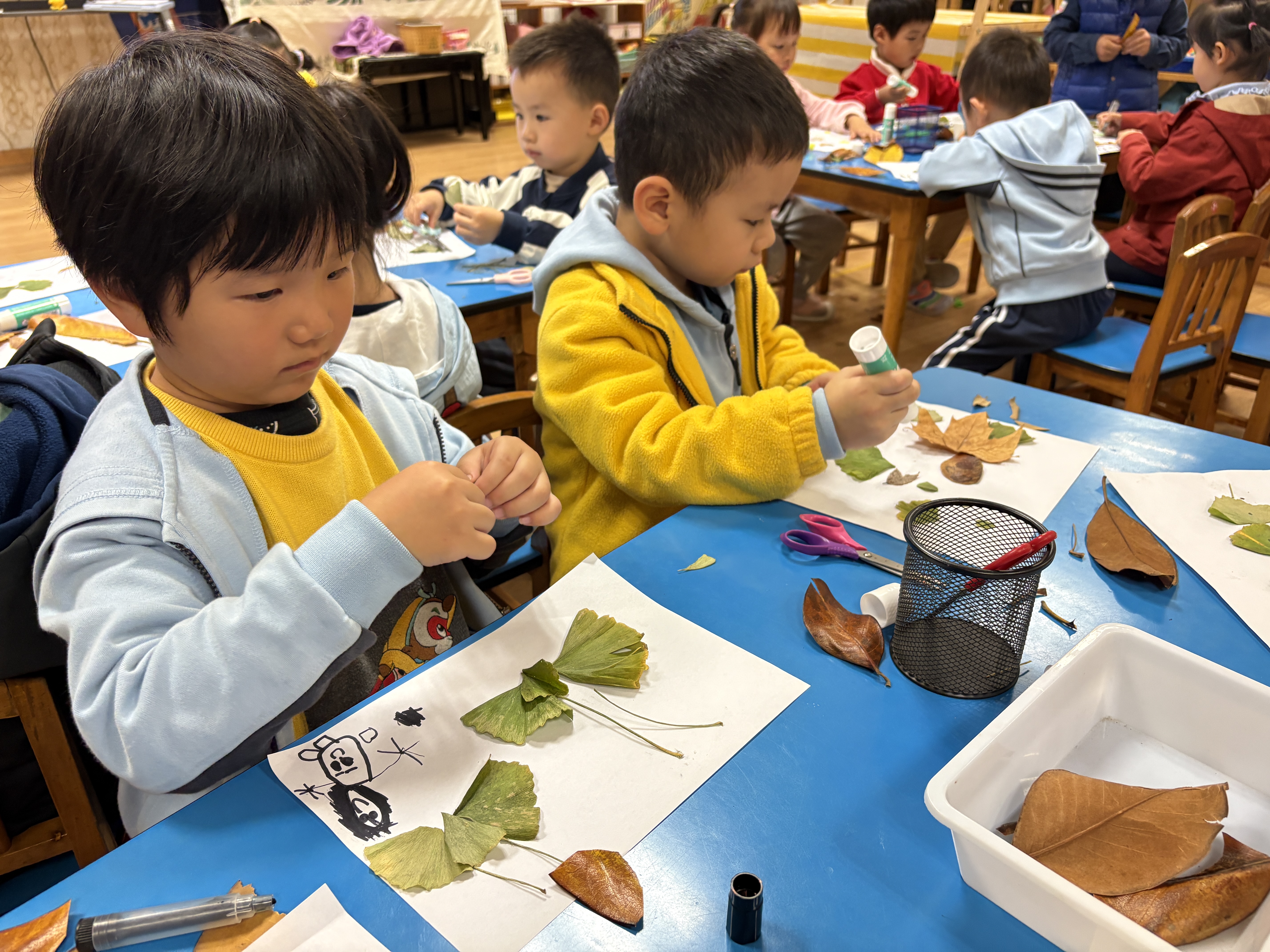 落叶拼画:落叶也成为艺术创作的素材。孩子们仔细观察叶子的形状与颜色,通过拼贴、组合、添画,将一片片寻常落叶变成充满童趣的作品。笑脸与创意交织,定格成这个初冬最温馨的画面。