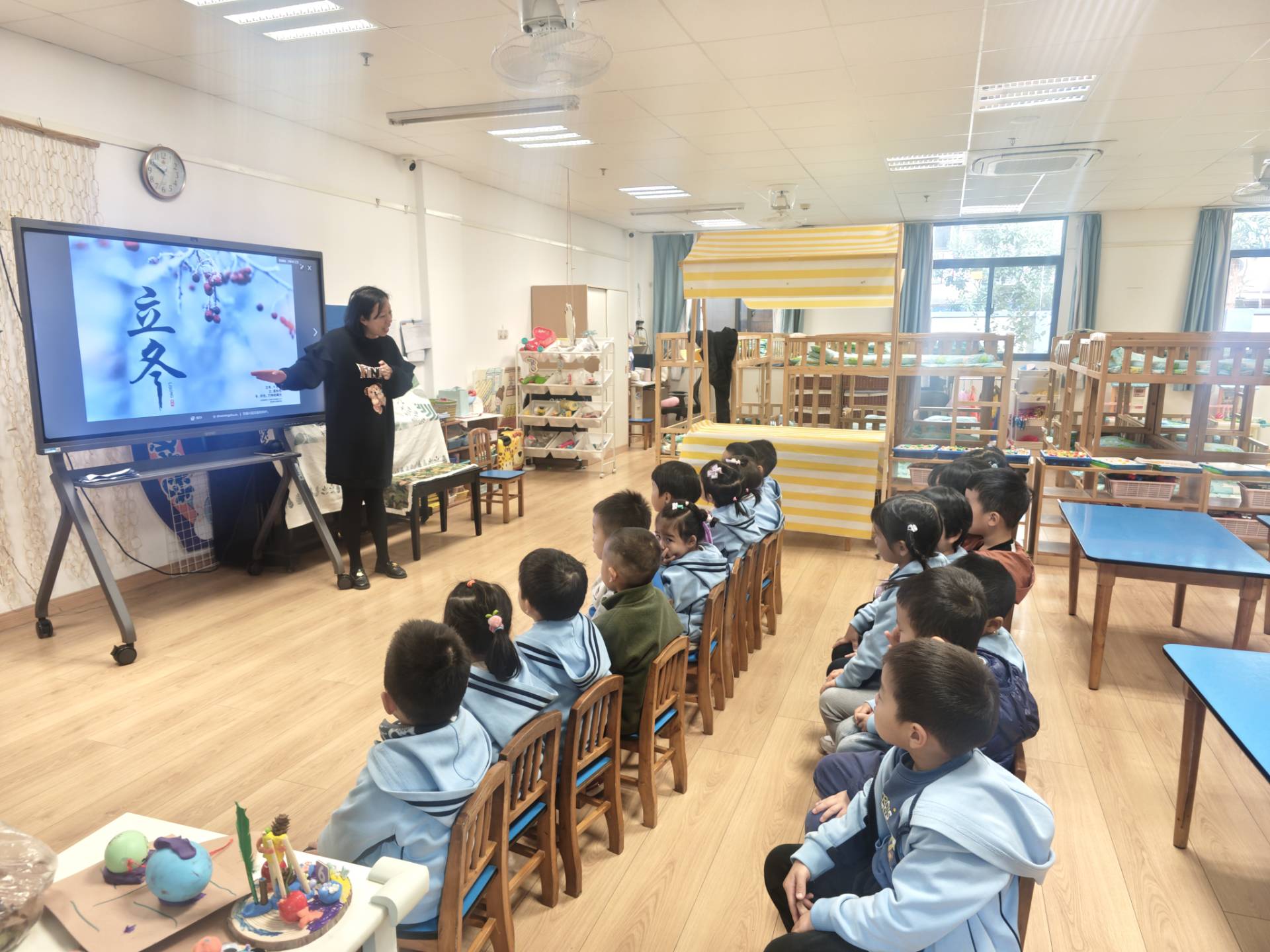 老师们通过多种形式进一步拓展孩子们的认知:借助节气绘本讲述立冬由来,围绕“冬天来了会怎样”开展趣味谈话,带领孩子们到户外观察初冬天色与植物的细微变化。孩子们在听、说、看的过程中真切感受到了传统节气的独特魅力。