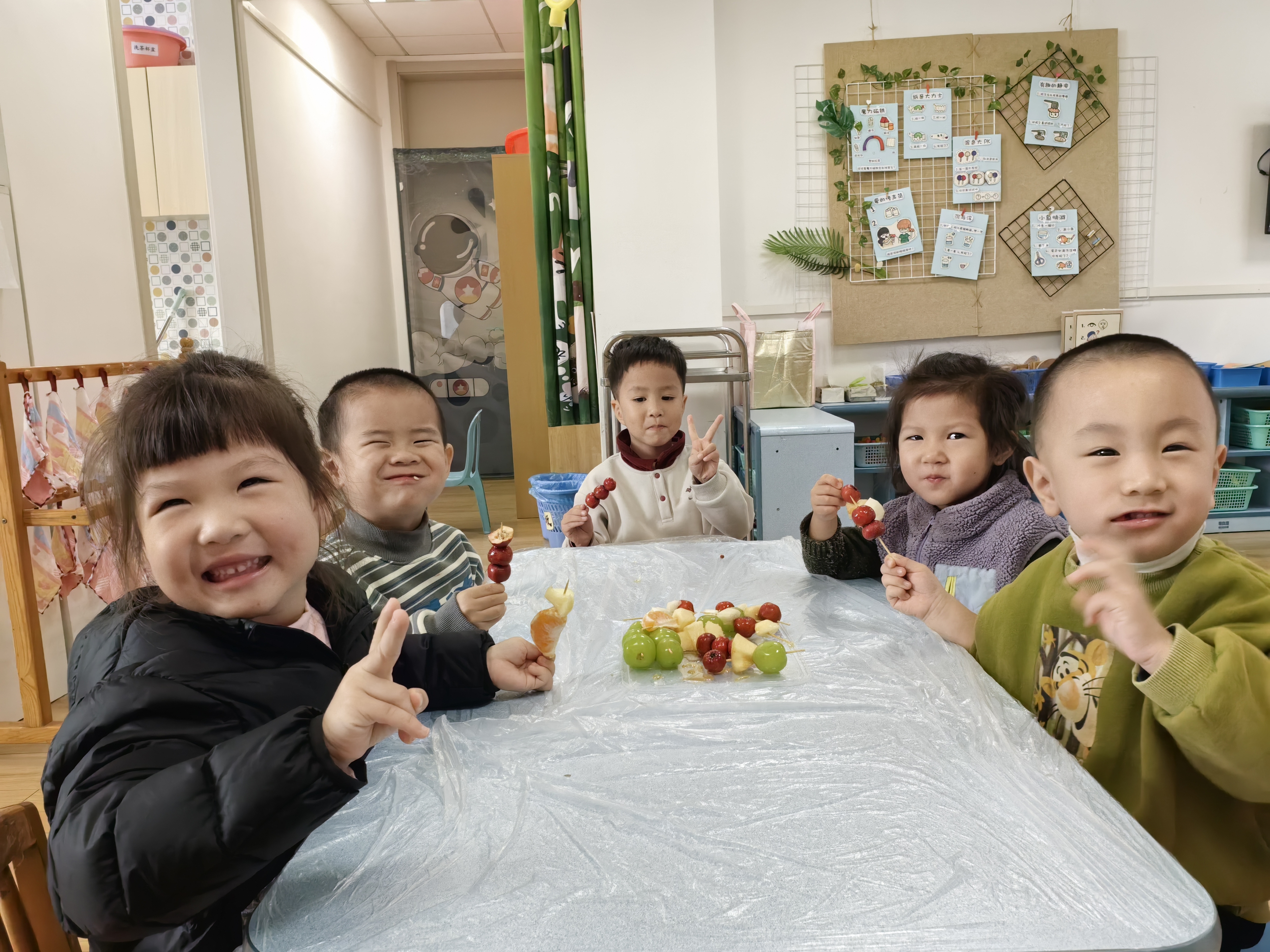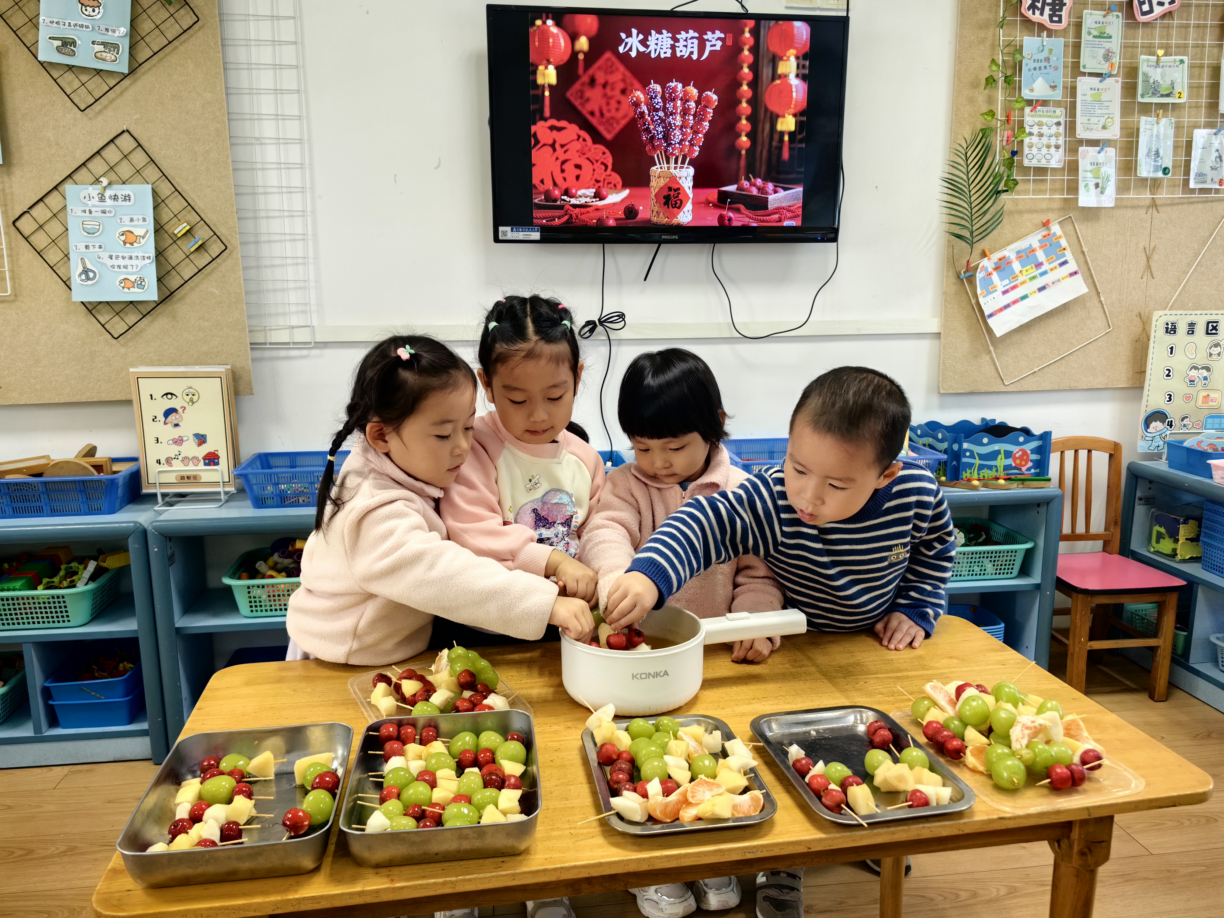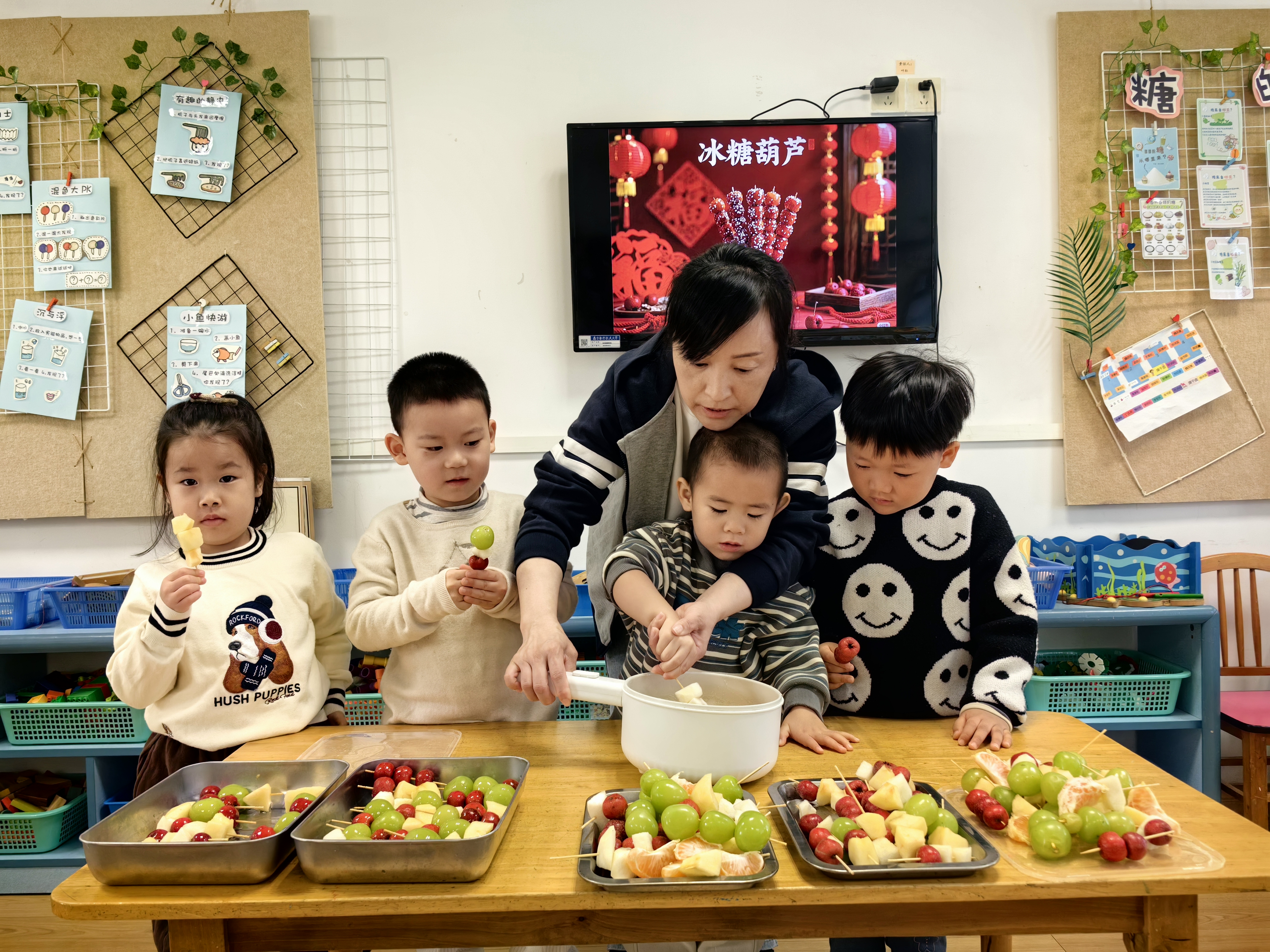“冰糖葫芦甜又甜,红红果子圆又圆”,小班的萌娃们开启了糖葫芦制作之旅。洗净的水果一颗颗串起,在老师的协助下裹上晶莹的糖衣,仿佛穿上了一层薄纱。咬下一口酸甜,舌尖的甜蜜与心间的喜悦交织,定格成珍贵的记忆。
