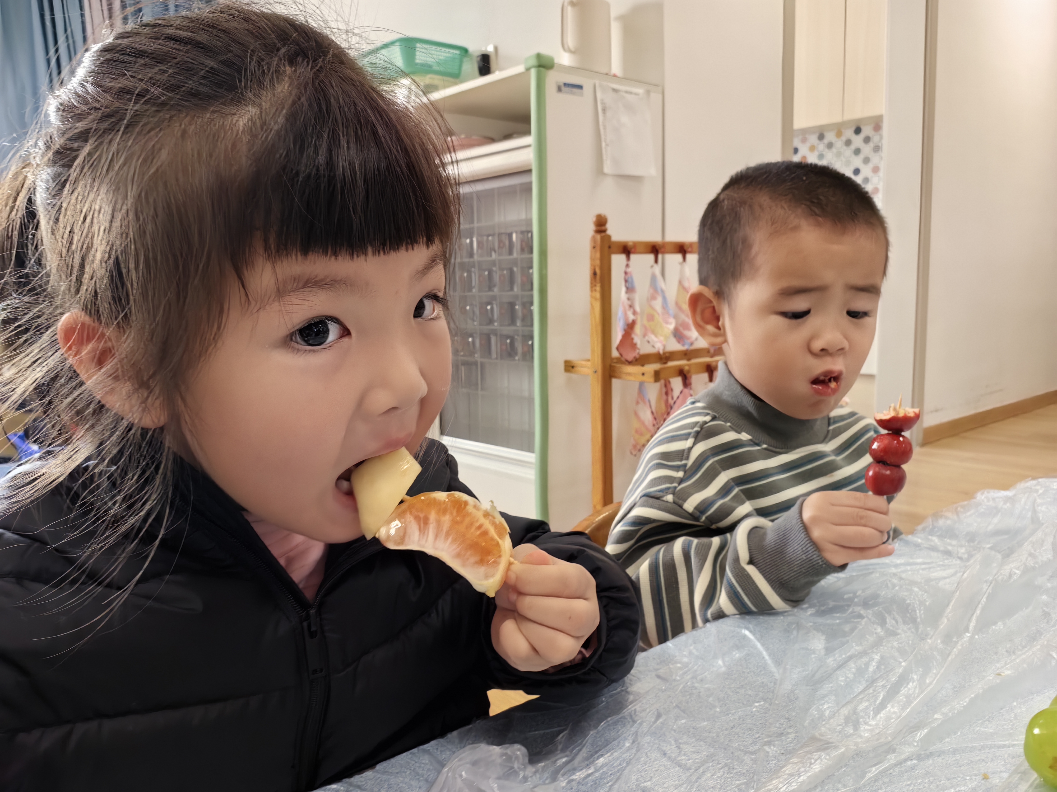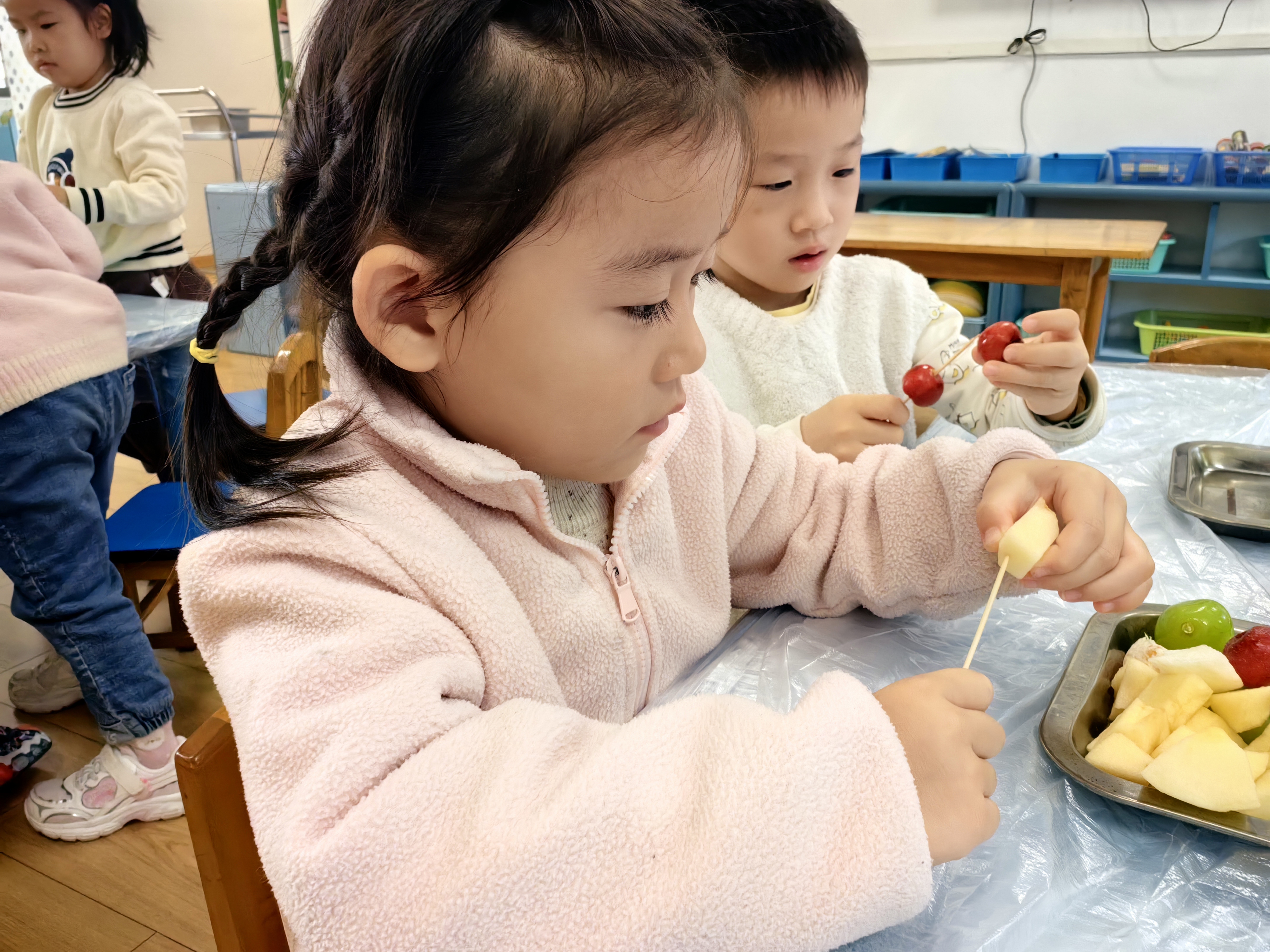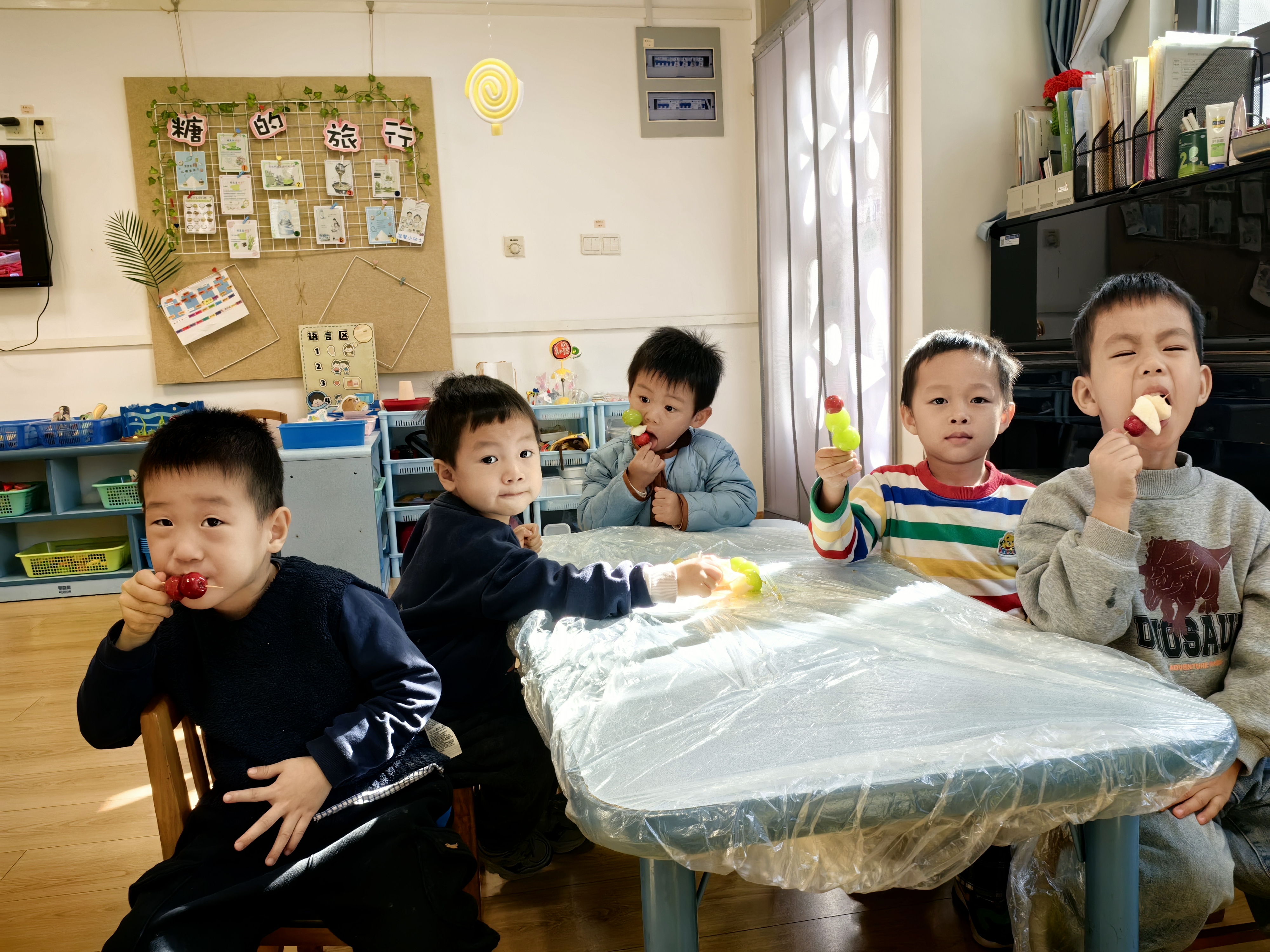 “冰糖葫芦甜又甜,红红果子圆又圆”,小班的萌娃们开启了糖葫芦制作之旅。洗净的水果一颗颗串起,在老师的协助下裹上晶莹的糖衣,仿佛穿上了一层薄纱。咬下一口酸甜,舌尖的甜蜜与心间的喜悦交织,定格成珍贵的记忆。