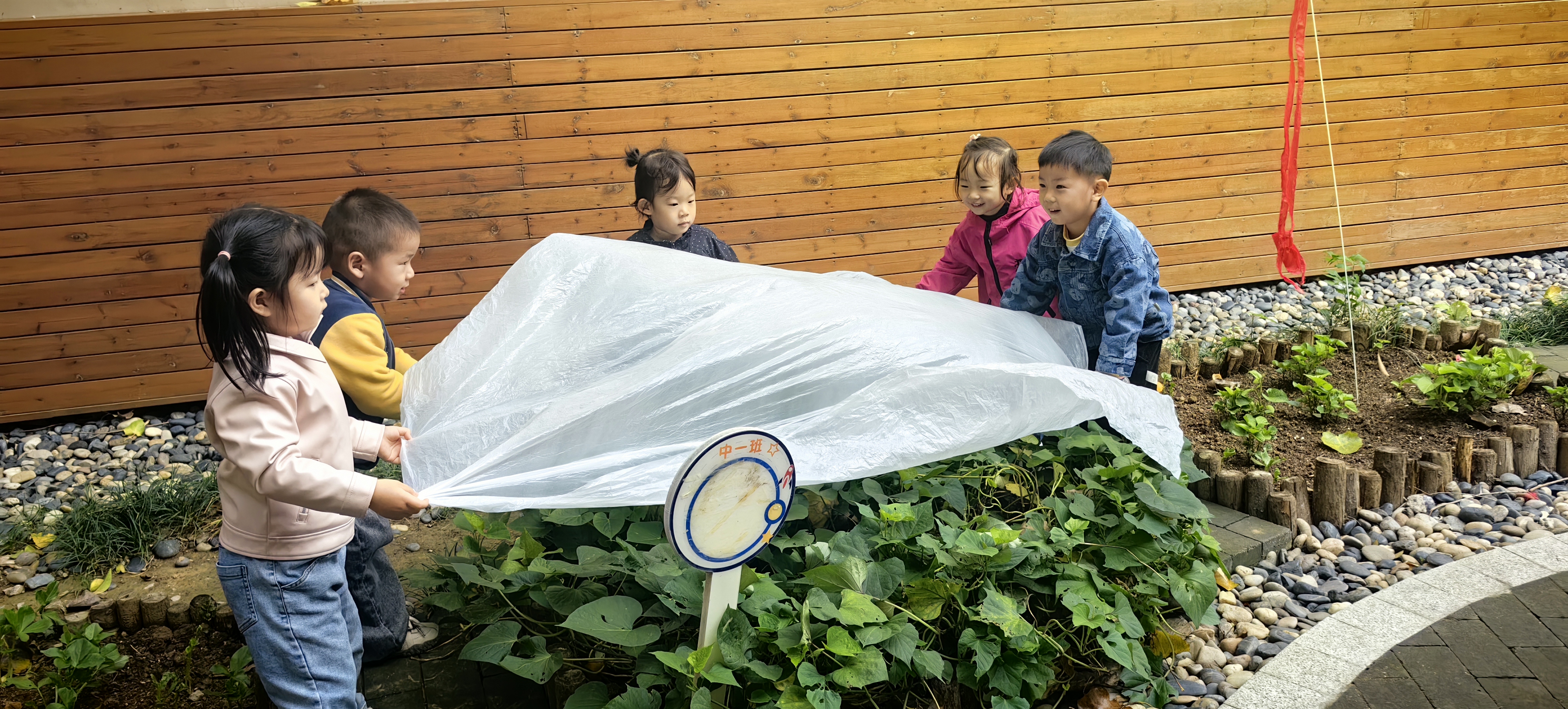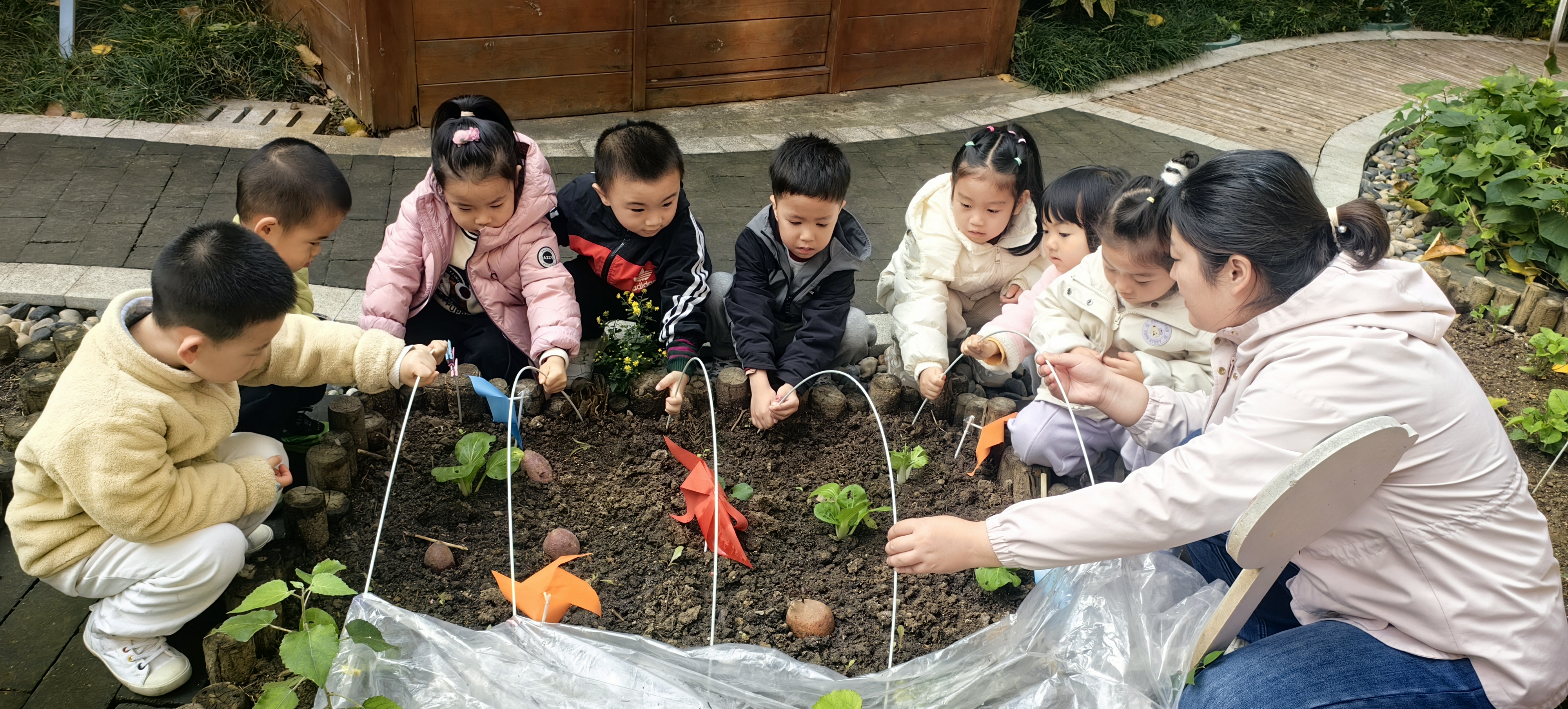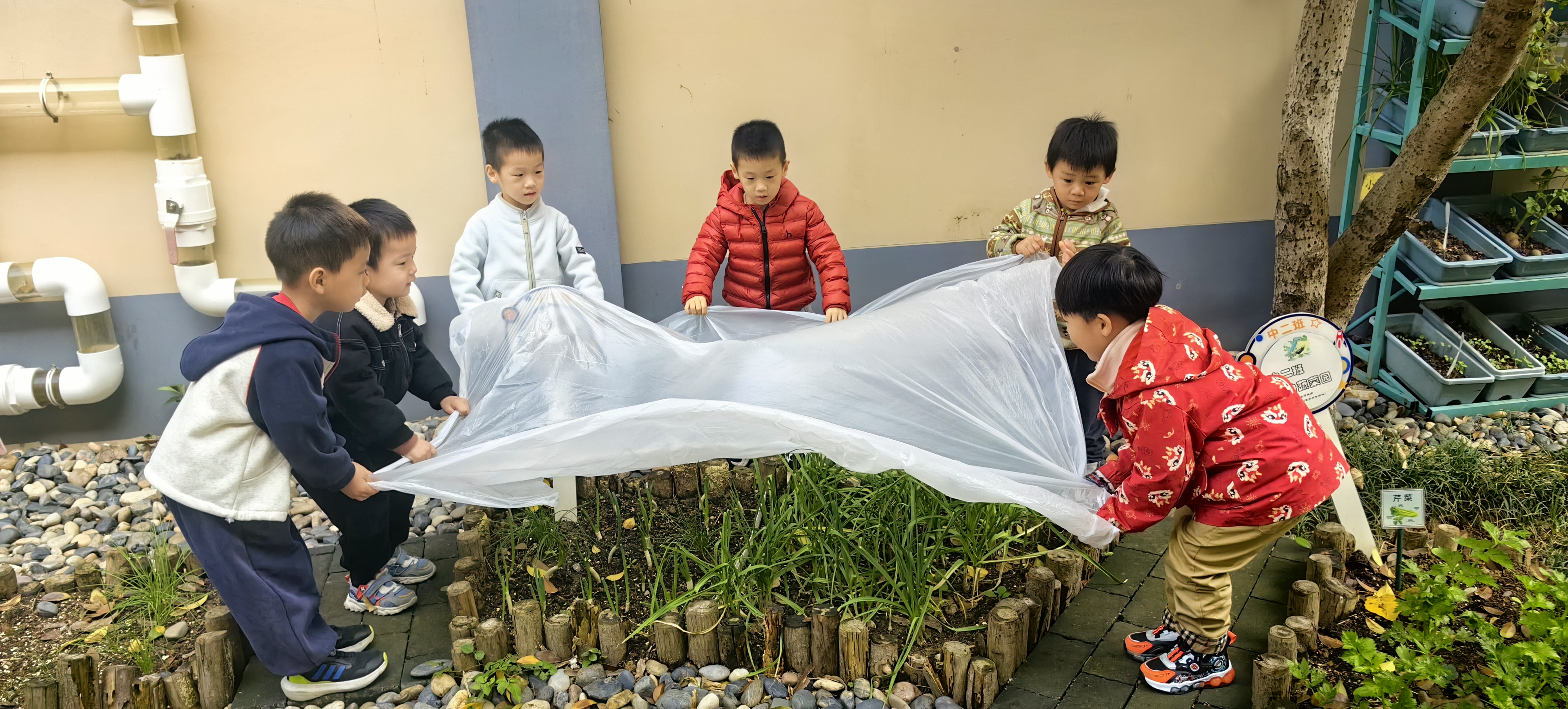 天气转凉,菜园里的蔬菜宝宝也需要温暖守护。孩子们化身“护绿小卫士”,齐心协力为蔬菜搭建温暖的大棚,如同为它们盖上一层厚厚的“棉被”。在动手实践中,孩子们懂得了植物越冬的小知识,也在心中播下了爱护自然的种子。