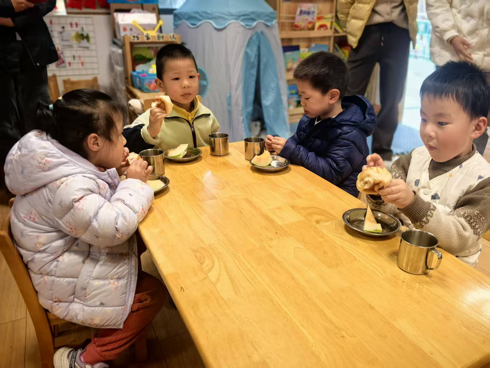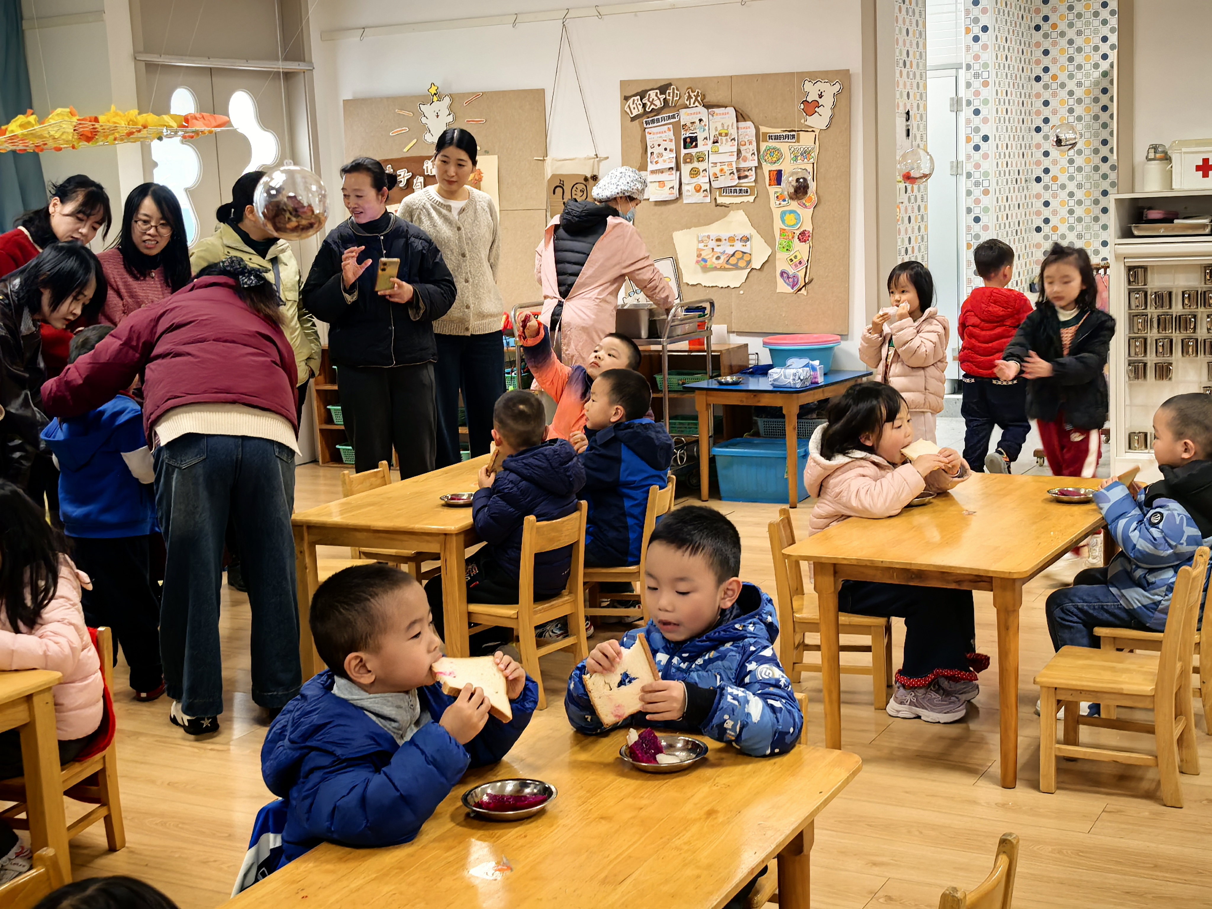 活动从观摩幼儿生活环节开始。孩子们有条不紊地穿衣、整理物品,稚嫩的动作中透出坚持与独立;喝水时自觉排队、按需取水;点心时间有序洗手、安静用餐,每一个细节都展现出良好的生活习惯;家长们亲眼见证孩子在自理能力上的成长,深切体会到“生活即教育”的理念在点滴日常中的渗透,为孩子们的进步感到欣慰。