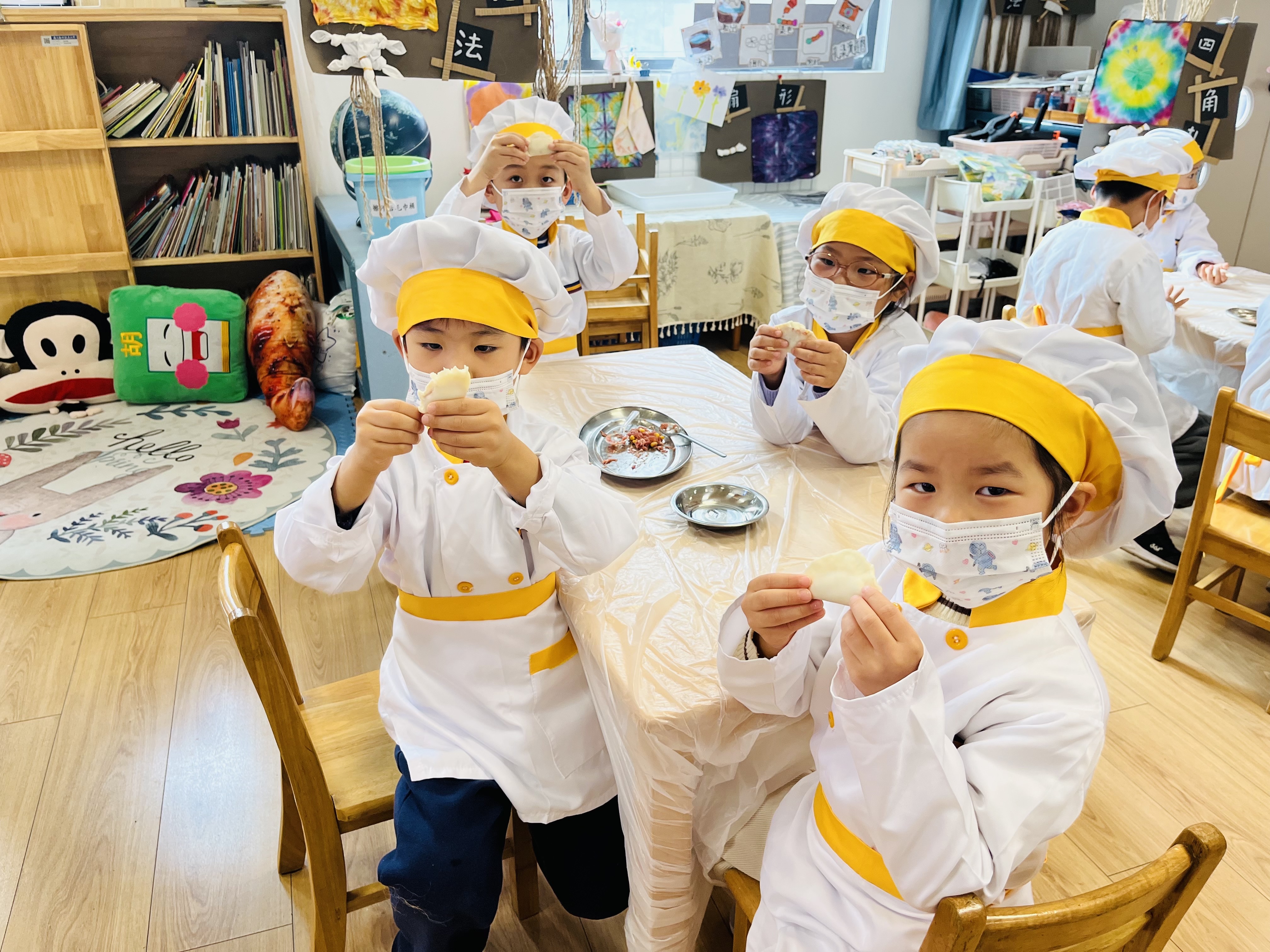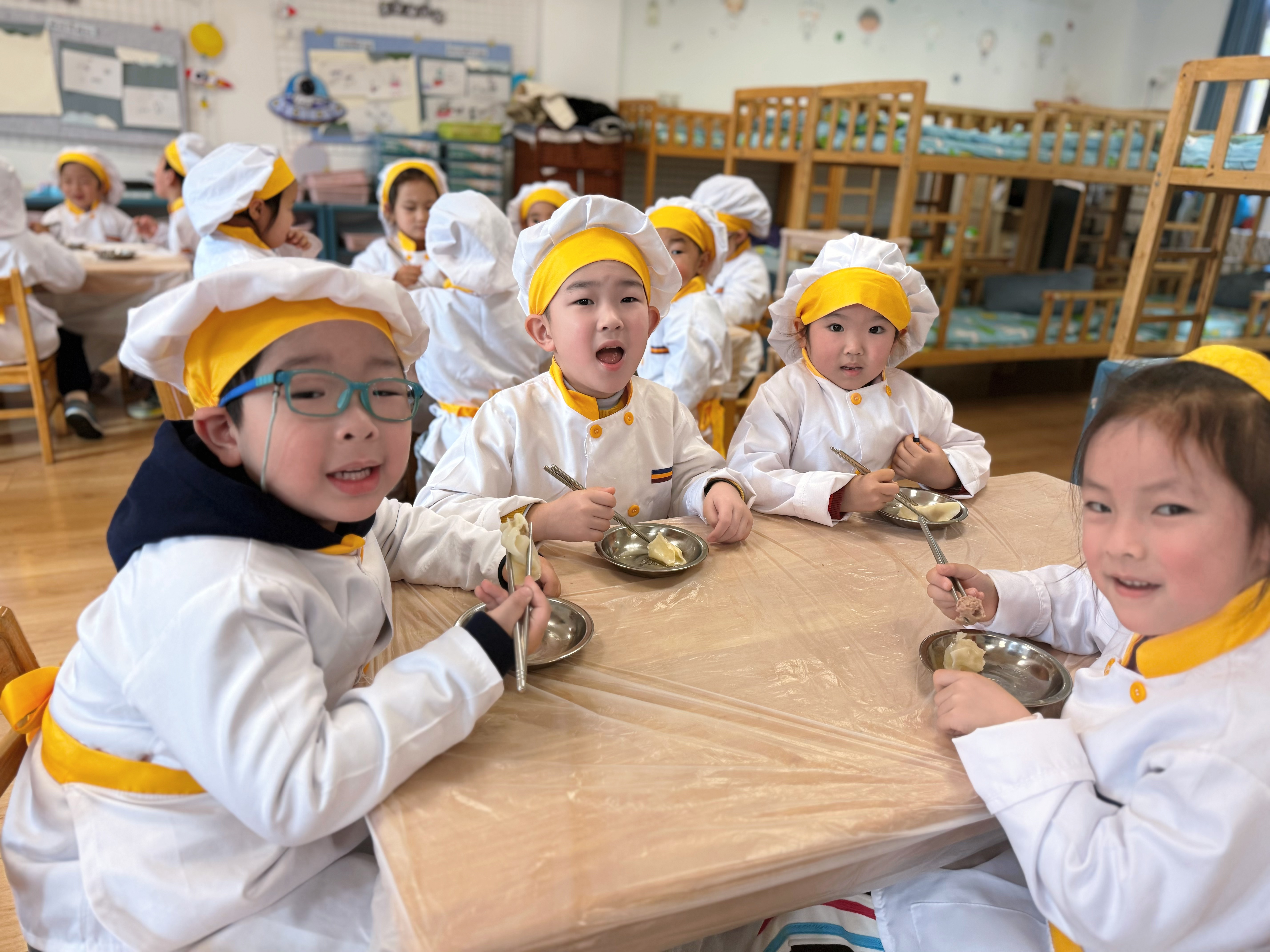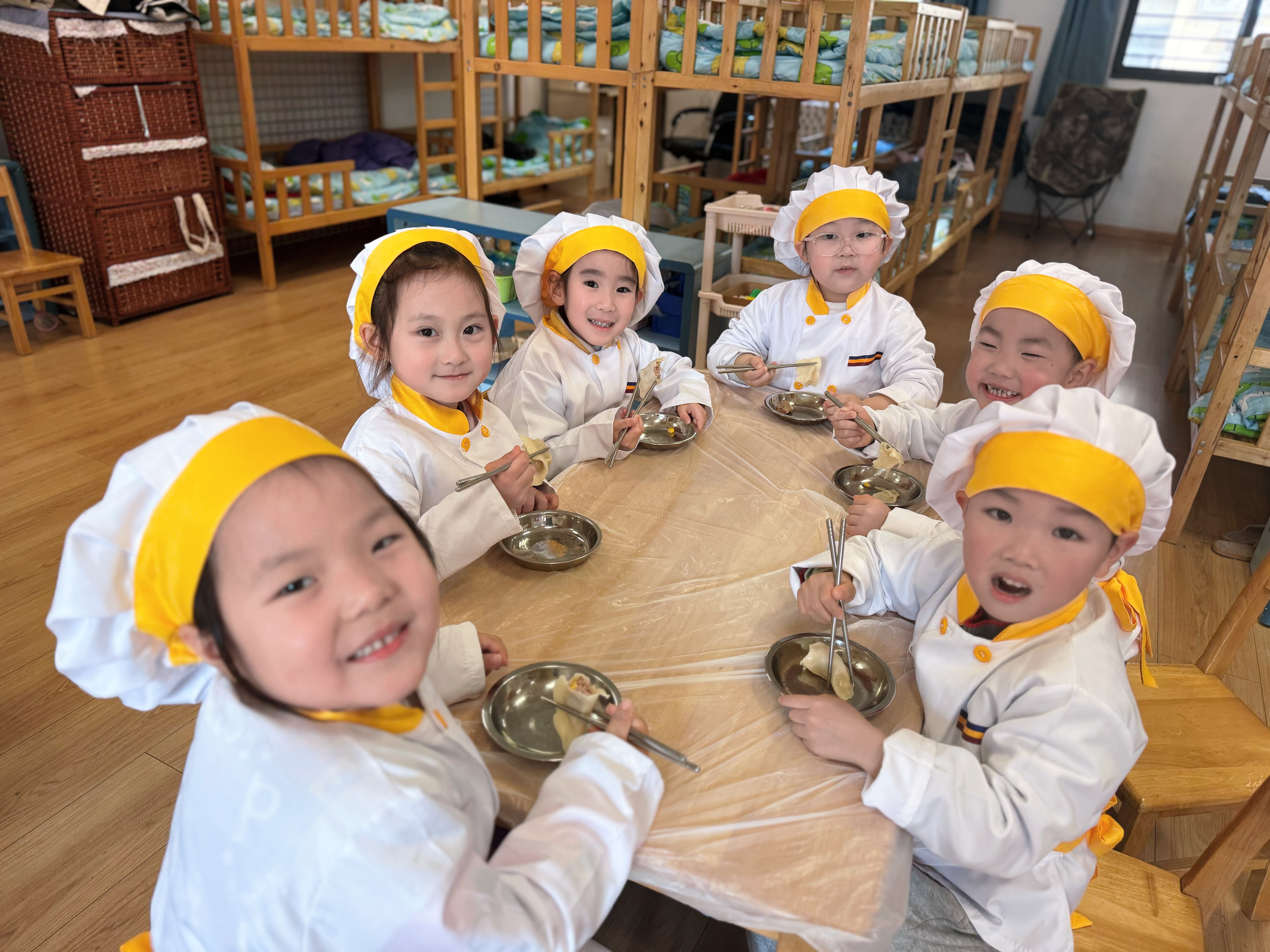 包饺子是冬至不可或缺的传统习俗。食育活动中,孩子们热情高涨,在教师的悉心指导下认真填馅、捏合,形态各异的饺子承载着童真与创意。当热气腾腾的饺子出锅,孩子们品尝着自己的劳动成果,满足与自豪之情溢于言表,在舌尖美味中感受冬日的温暖与团圆的意义。