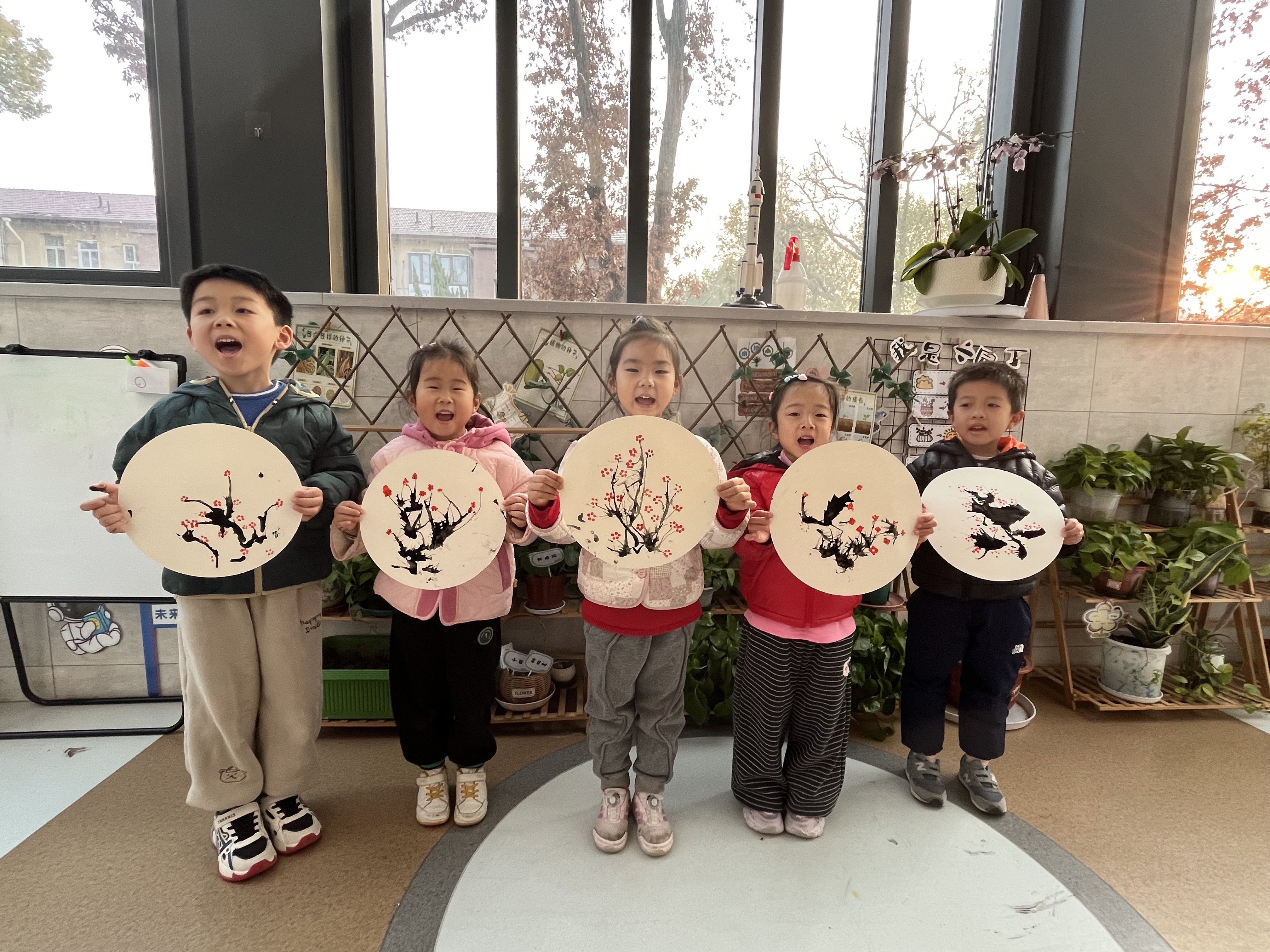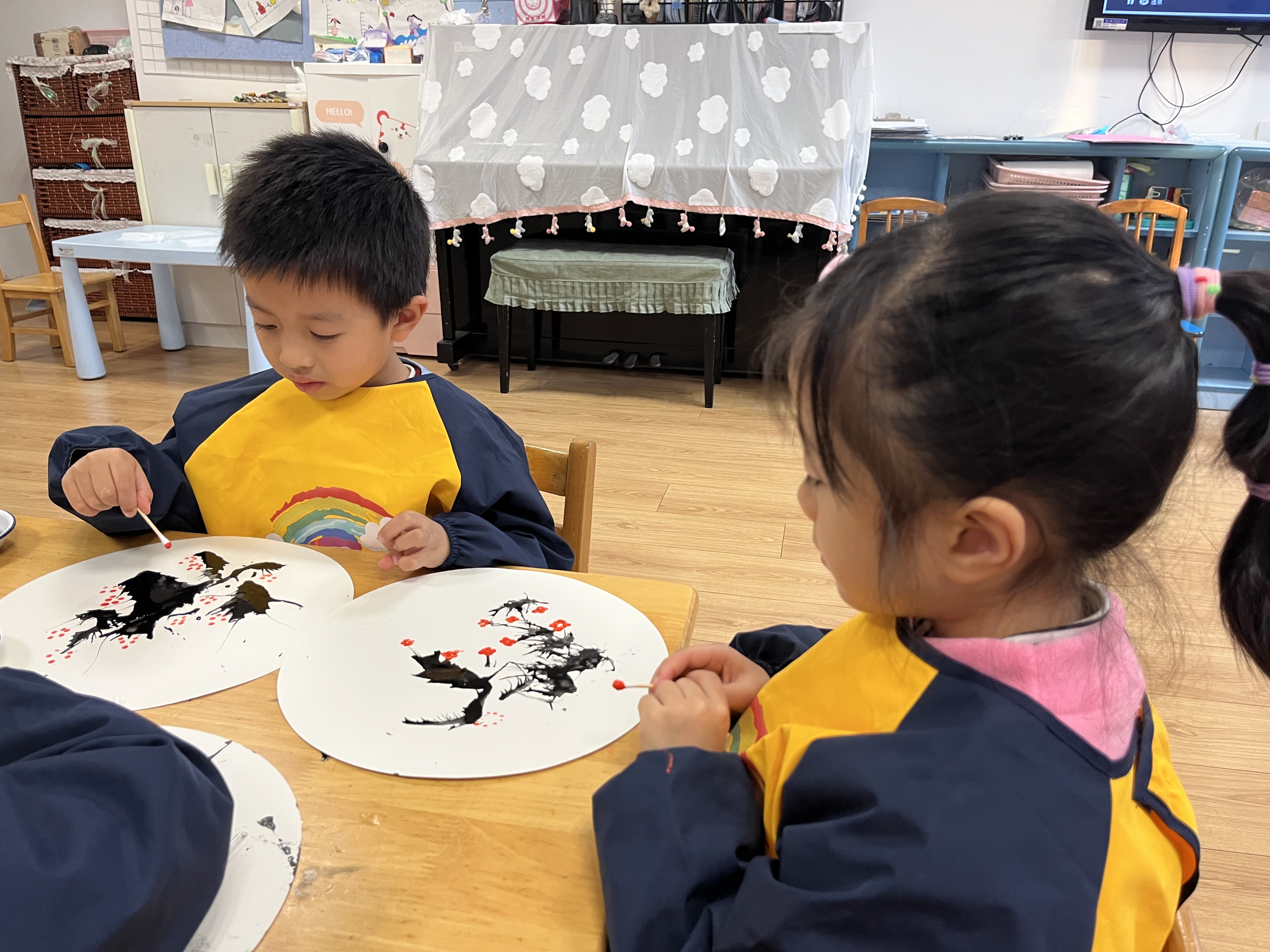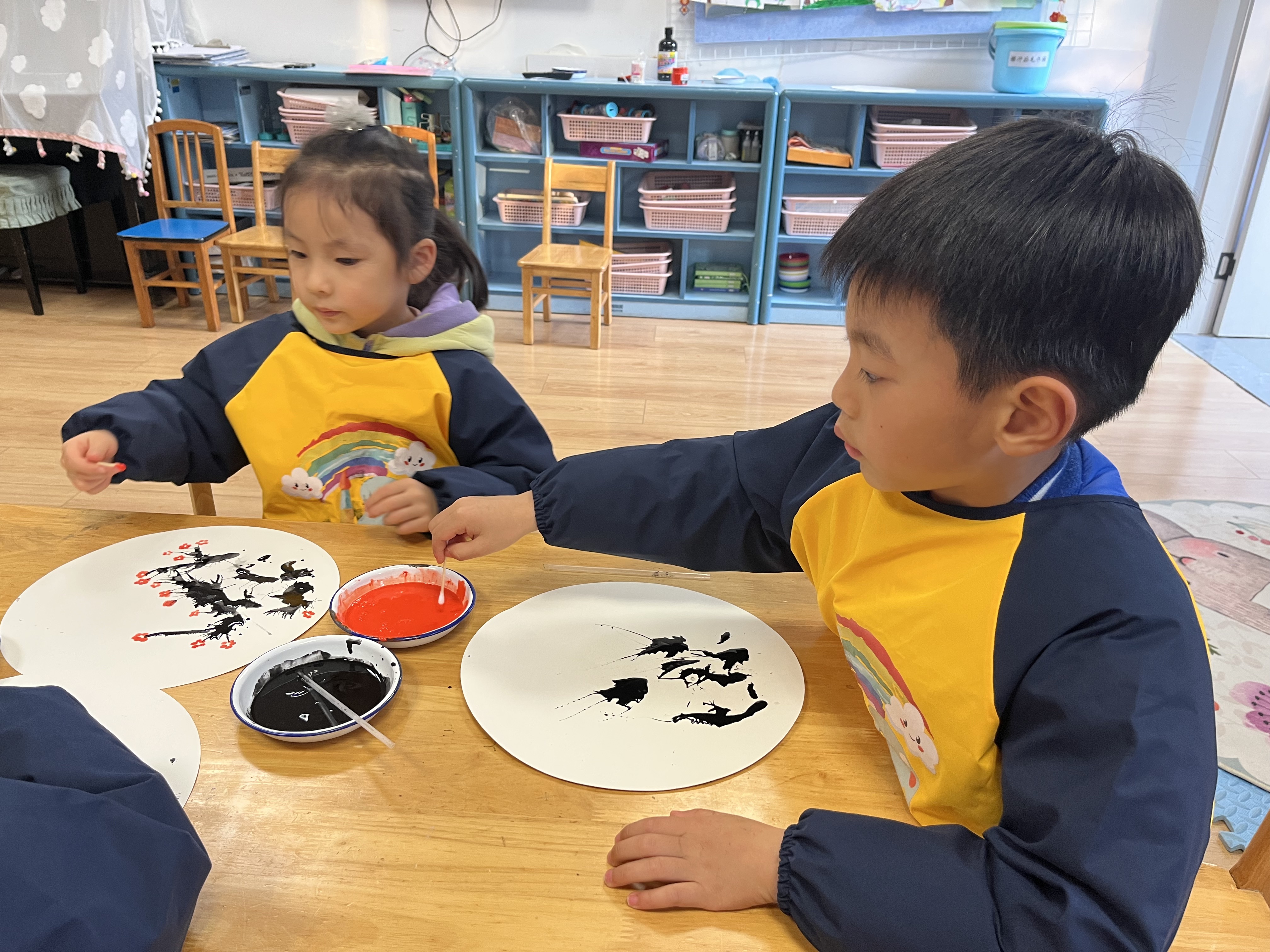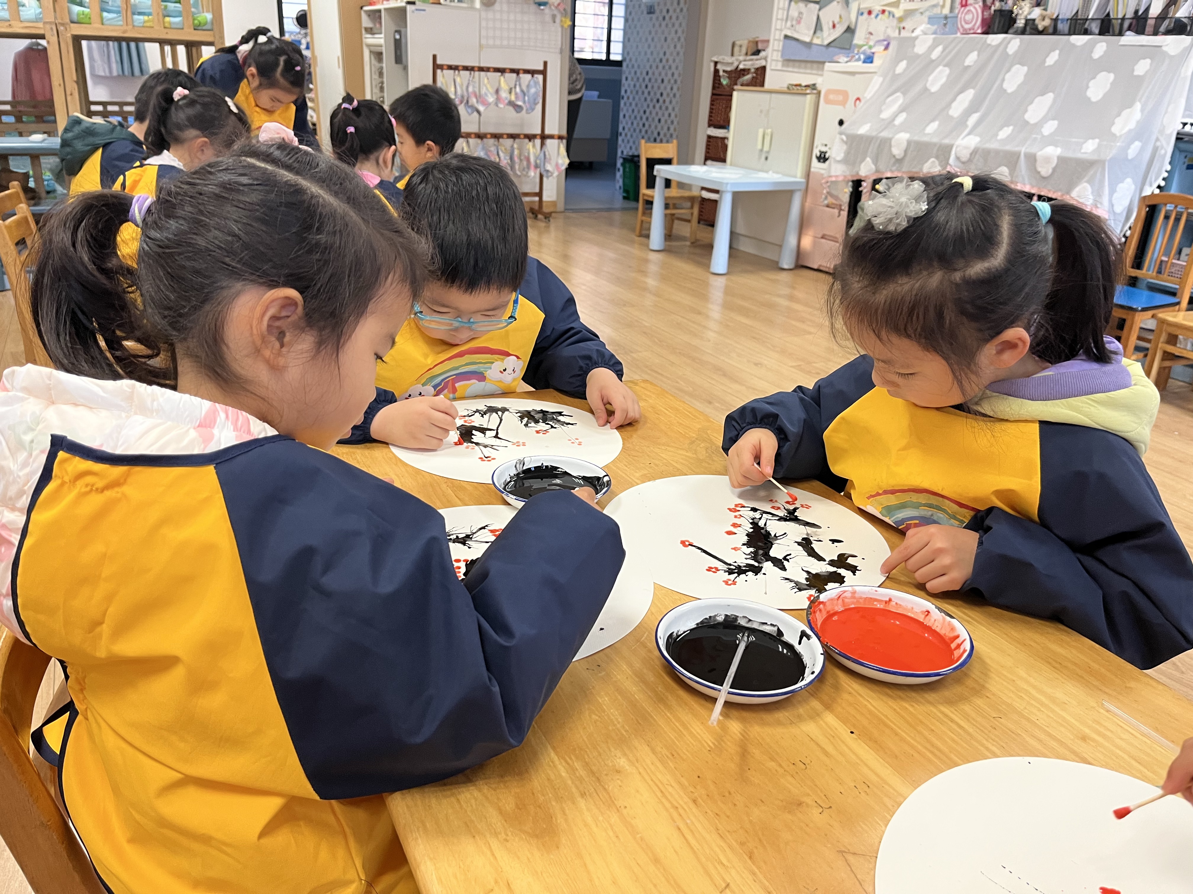 创意艺术活动为冬至增添别样的文化诗意。“吹画消寒图”创作中,幼儿巧用吸管吹墨成枝、棉签点蕊成花,一幅幅童趣盎然的作品跃然纸上,在体验传统“数九”习俗的同时,锻炼手眼协调与艺术表现力。