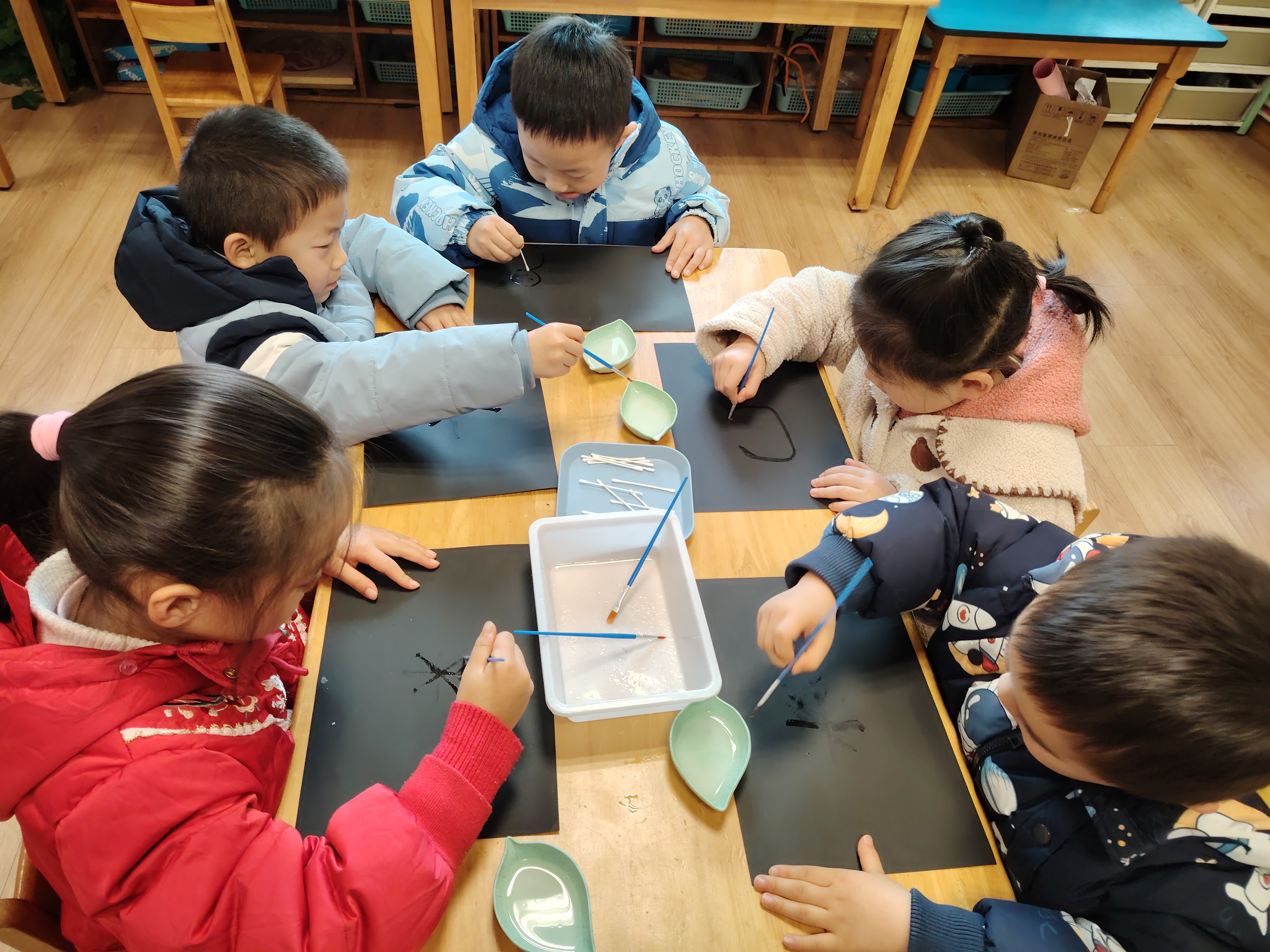 趣味科学小实验为孩子们打开探索自然的窗口。“盐水雪花”实验中,幼儿亲手调制温盐水,用棉签在卡纸上绘出图案,待水分蒸发后,晶莹的“盐雪花”便浮现眼前,让孩子们在惊叹科学现象的同时,联想冬至时节的冰雪盛景。