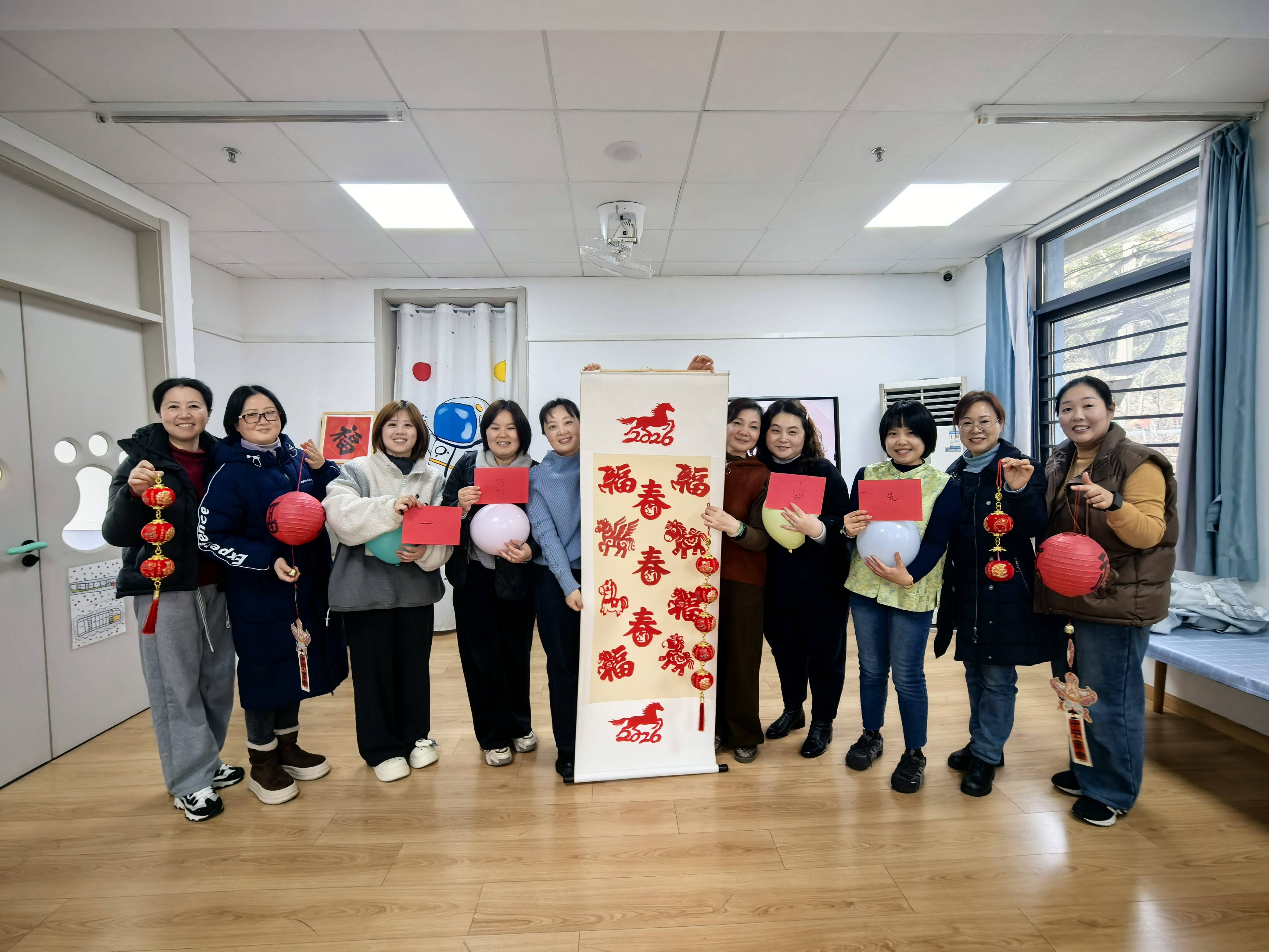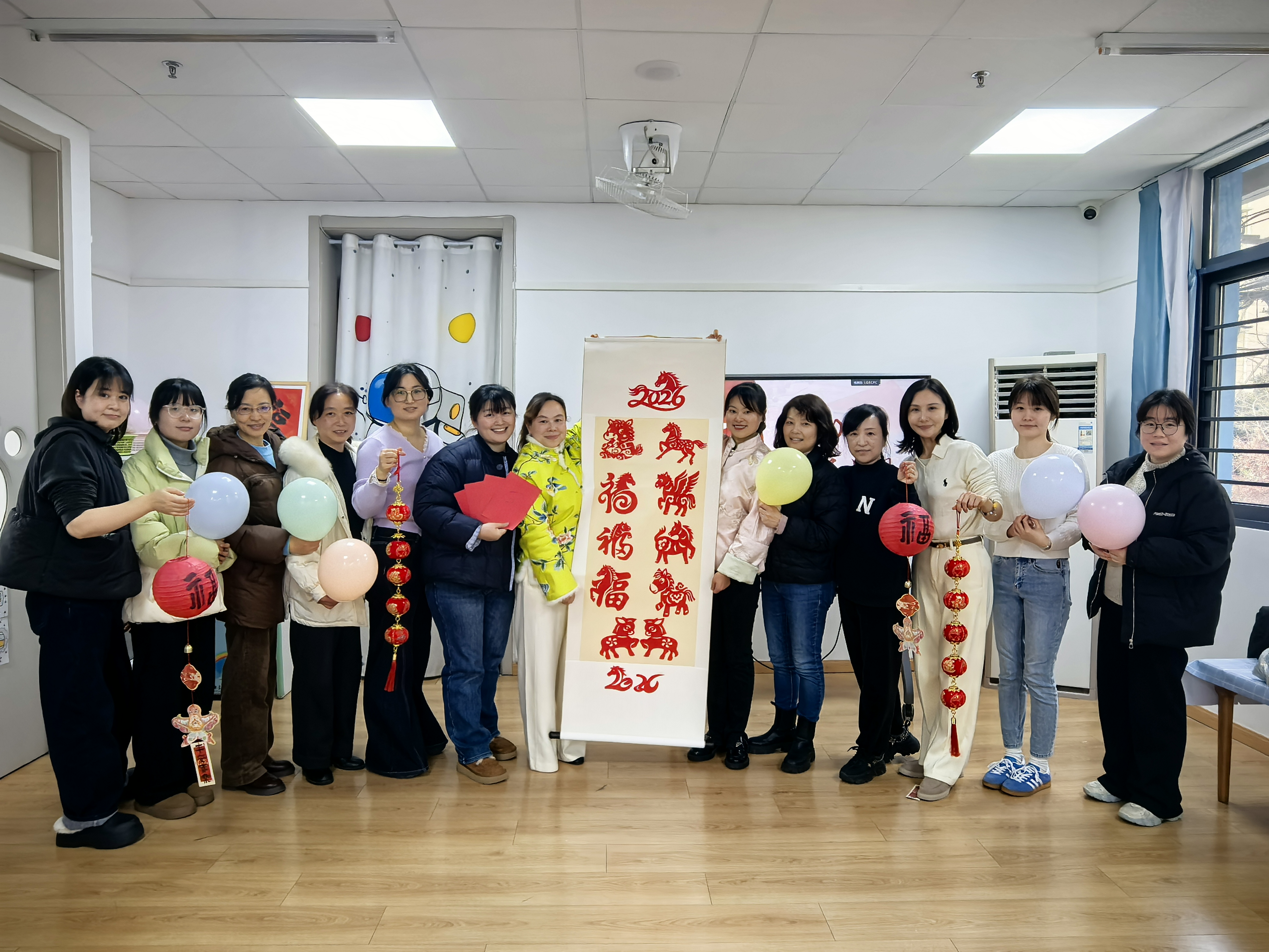 讲解后,教职工们开始动手体验,红纸在指尖翻飞,剪刀在纸上流转,一幅幅矫健、俊朗、可爱的祥马剪纸作品跃然纸上,与福字、春字等喜庆纹样相映成趣。创作完成后,“彩球接福”互动环节将气氛推向高潮,大家合作参与游戏,把新年祝福写在纸上,连成一句四字祝福成语,欢声笑语中传递着集体的温暖与对新年的期待。