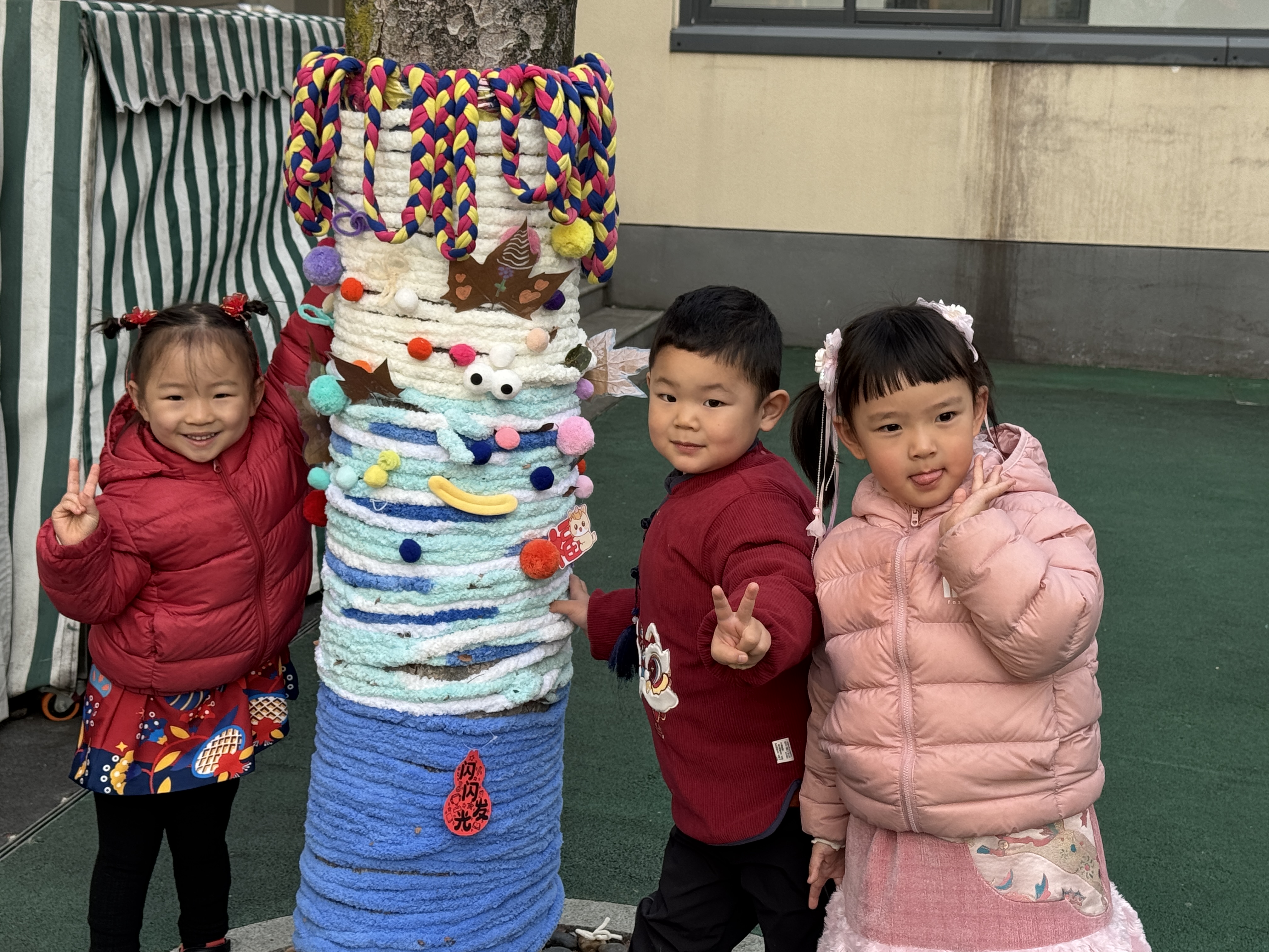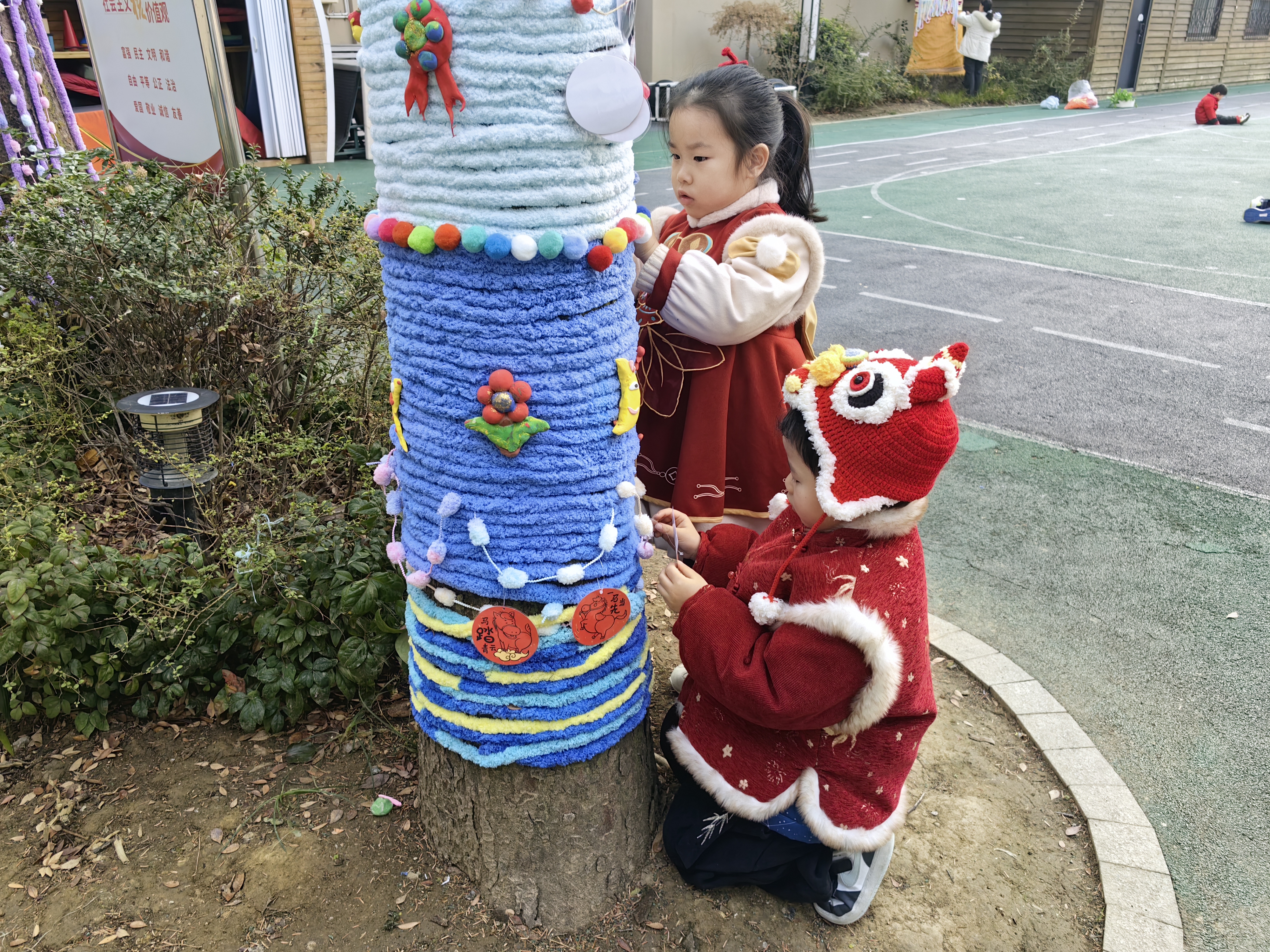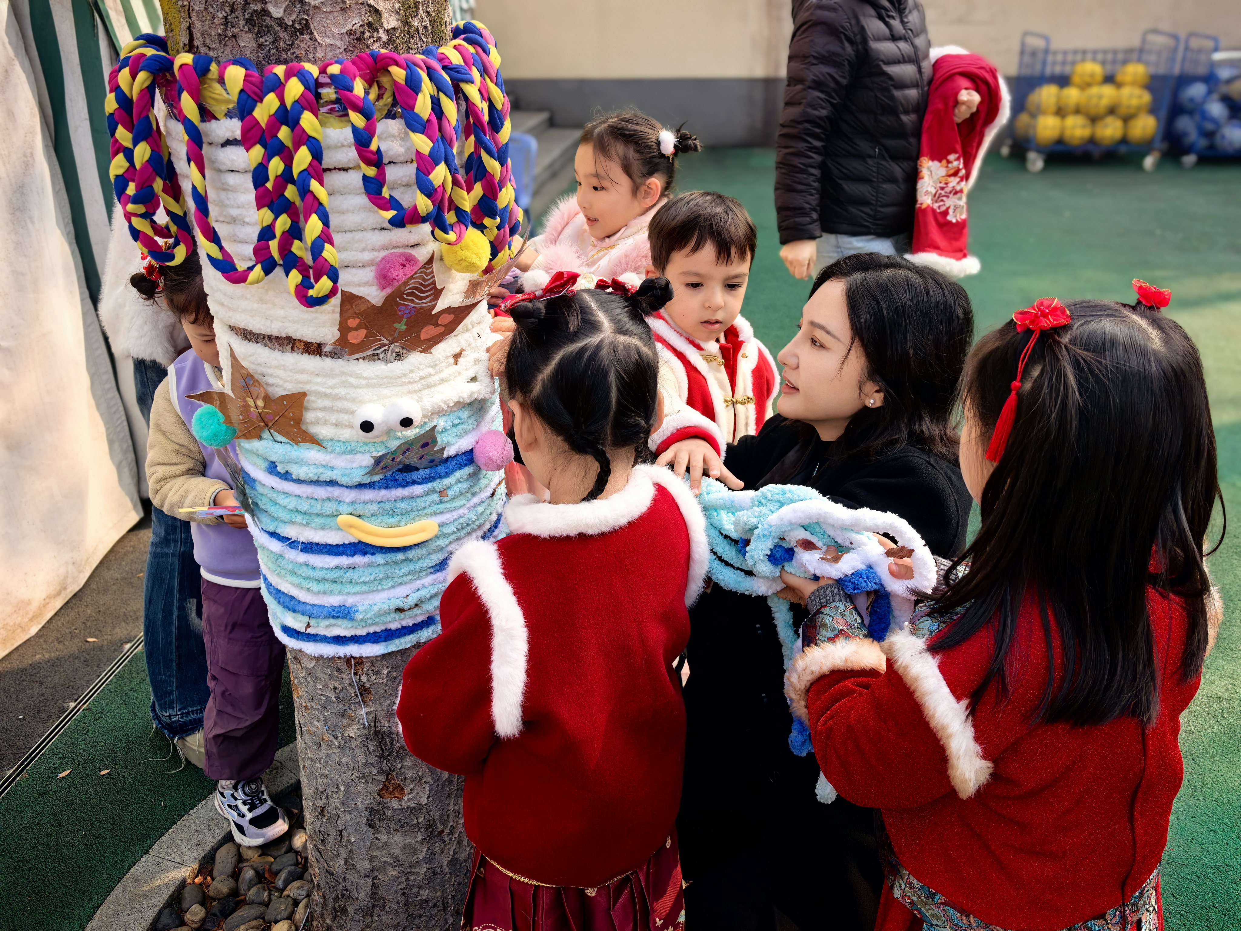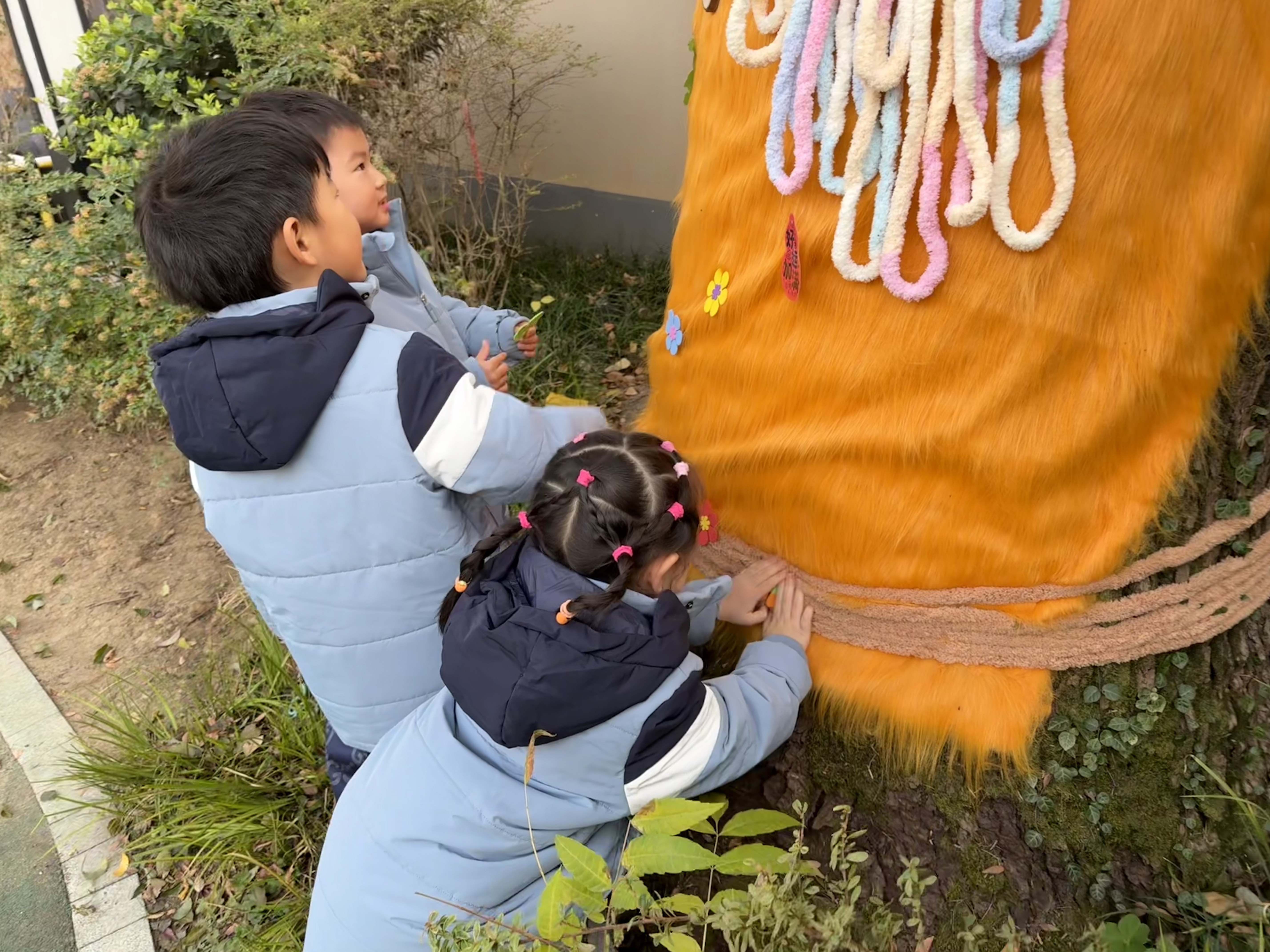 中大班的哥哥姐姐化身巧手工匠,细心为大树“缝制”一件件明艳的新年彩衣;小班的弟弟妹妹也不甘示弱,用五彩贴纸、可爱挂饰,树叶,泥工作品等为树木缀满俏皮的新年元素。在一双双小手的奇思妙想与通力合作下,原本素雅的树木焕然一新,摇身变成了一棵棵绚丽夺目的“新年树”。孩子们在分工协作的欢乐氛围里,真切触摸到辞旧迎新的温度,感受到新年将至的美好寓意。