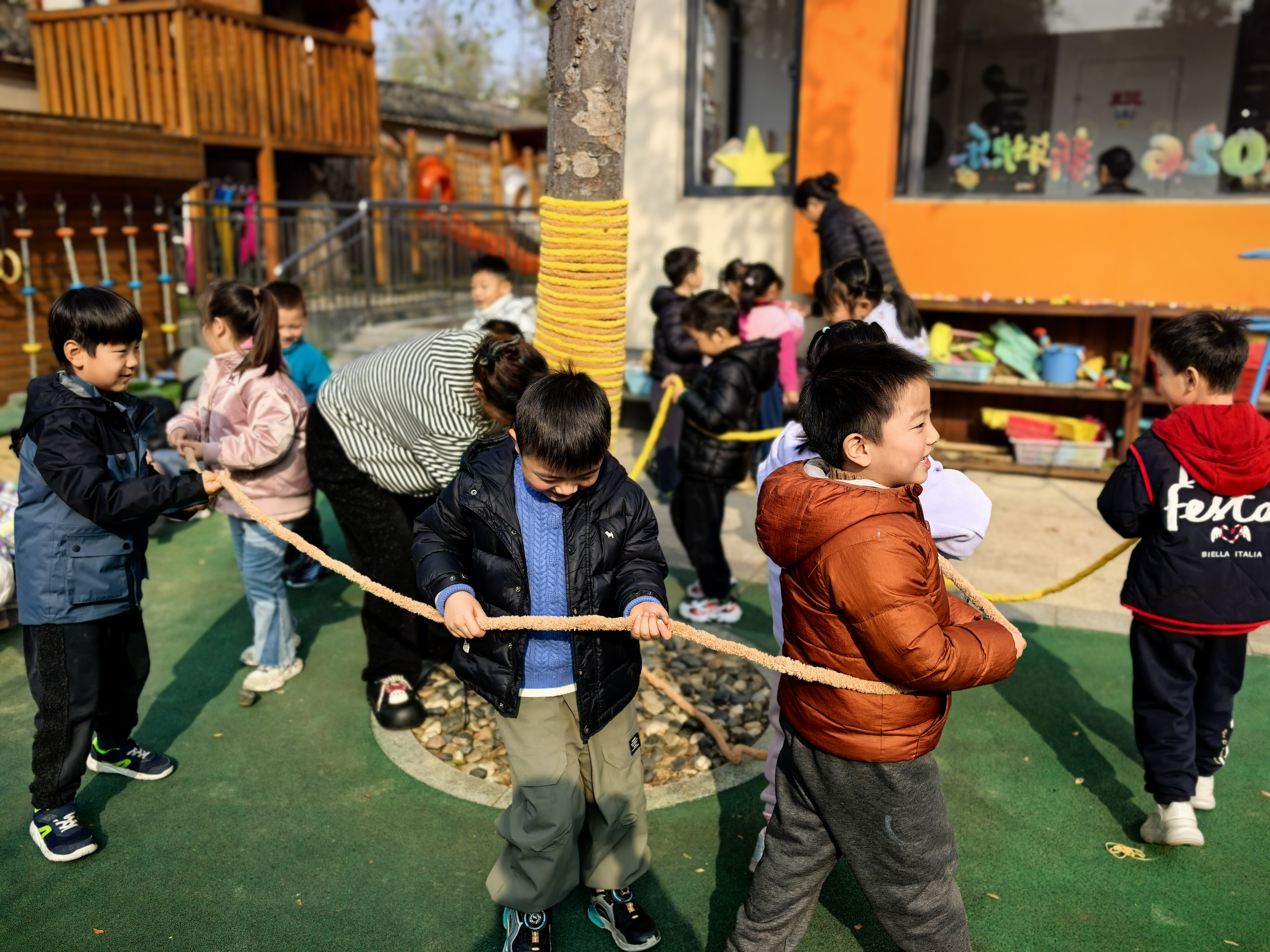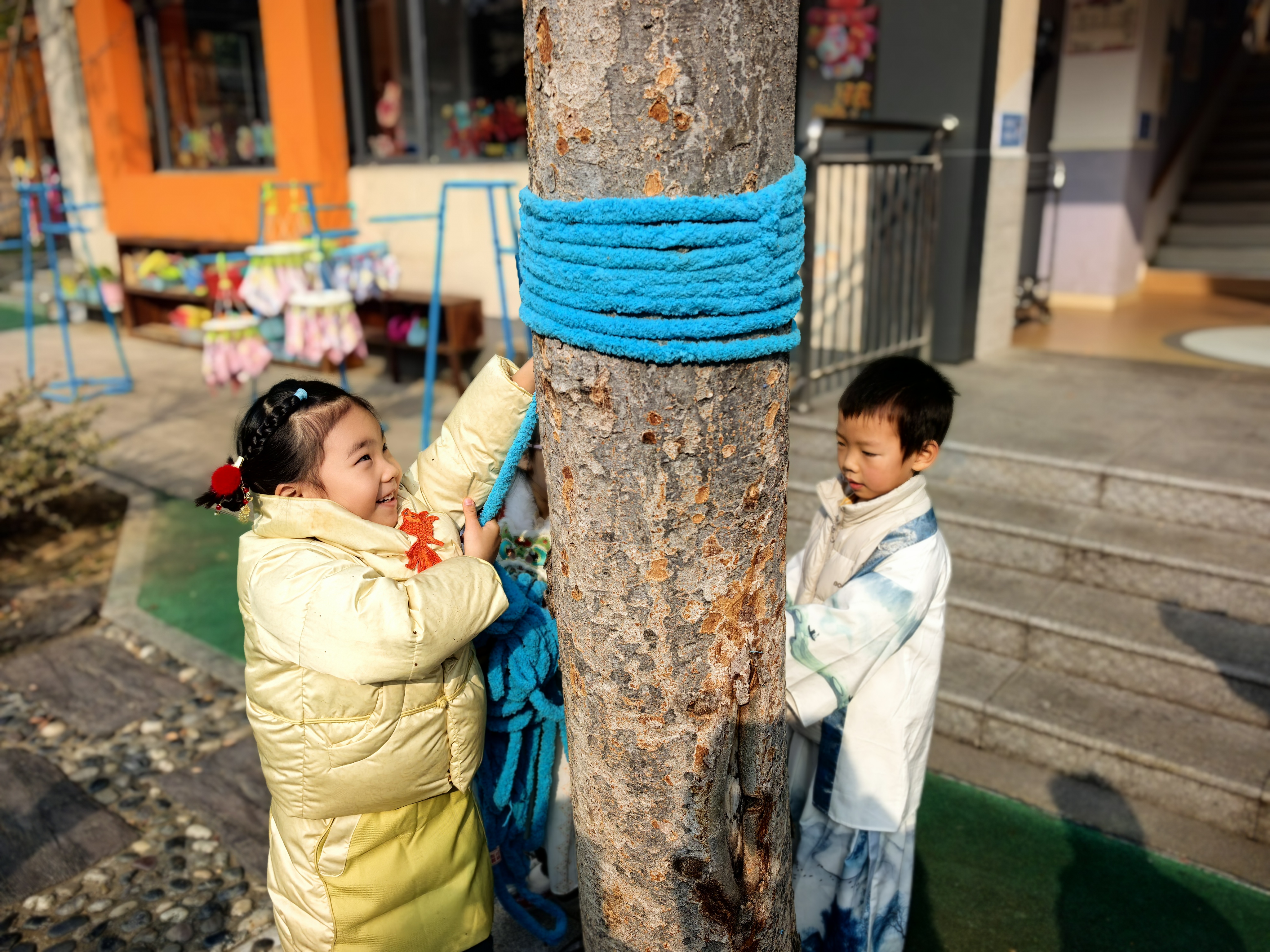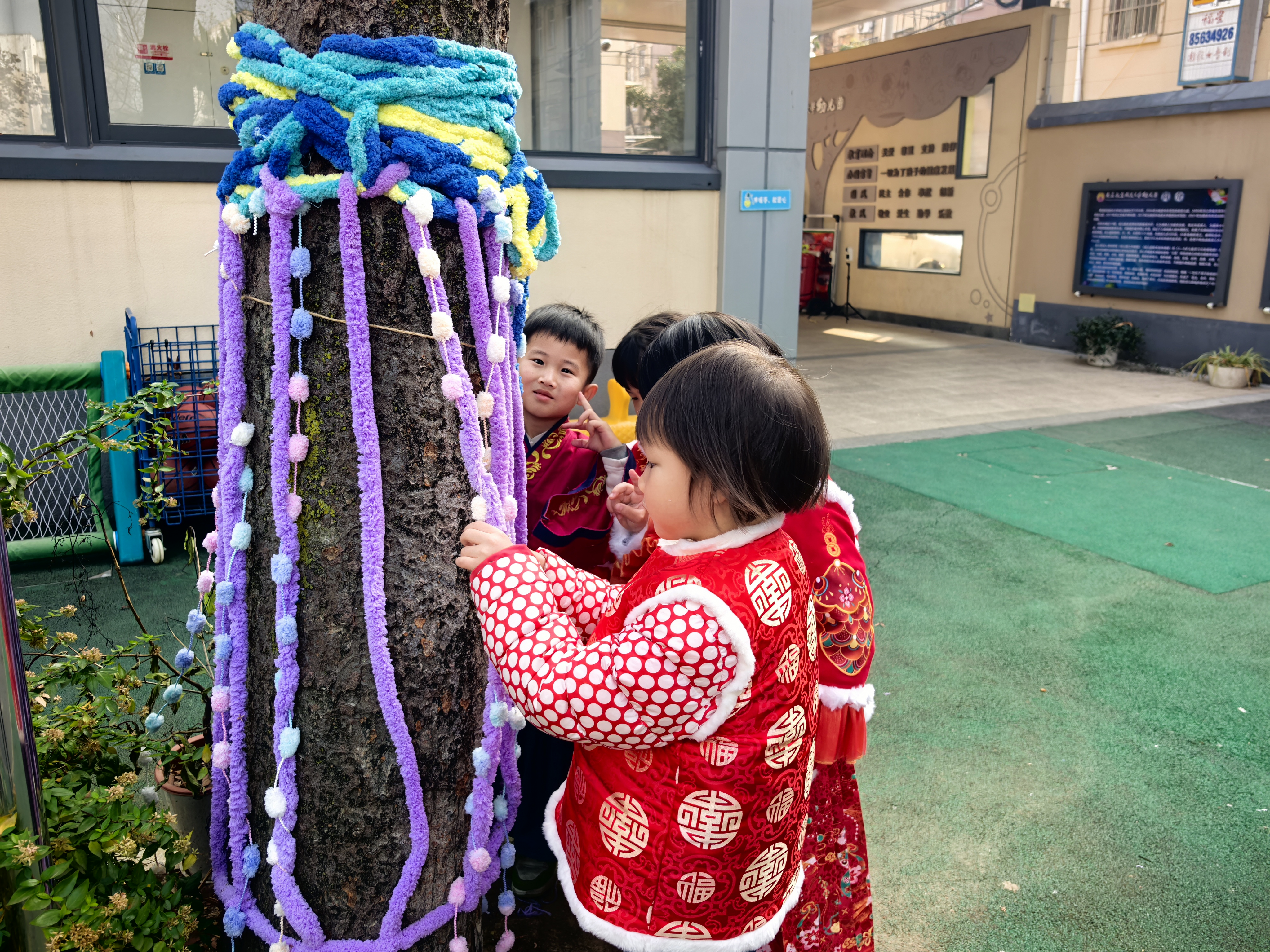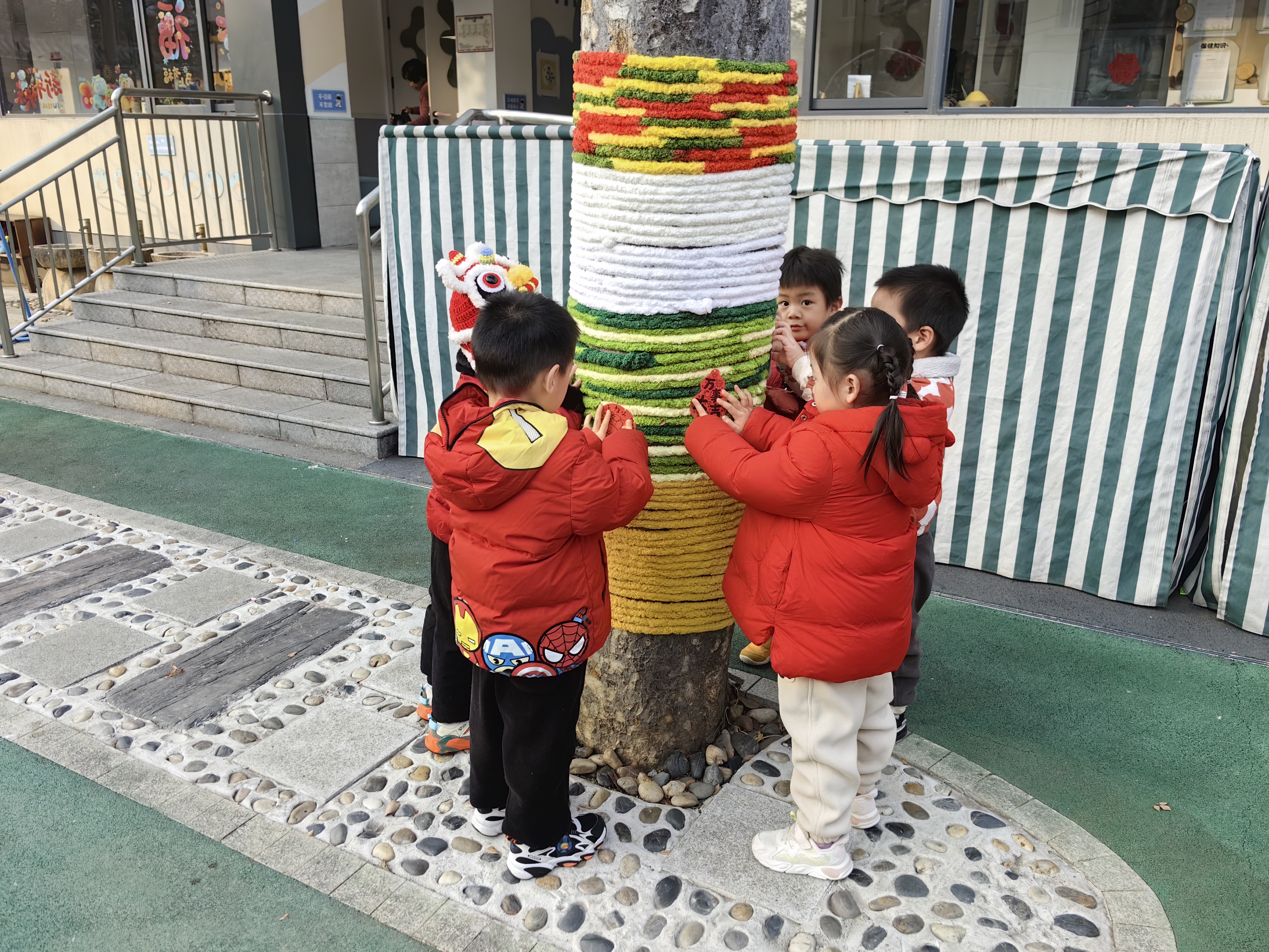 中大班的哥哥姐姐化身巧手工匠,细心为大树“缝制”一件件明艳的新年彩衣;小班的弟弟妹妹也不甘示弱,用五彩贴纸、可爱挂饰,树叶,泥工作品等为树木缀满俏皮的新年元素。在一双双小手的奇思妙想与通力合作下,原本素雅的树木焕然一新,摇身变成了一棵棵绚丽夺目的“新年树”。孩子们在分工协作的欢乐氛围里,真切触摸到辞旧迎新的温度,感受到新年将至的美好寓意。