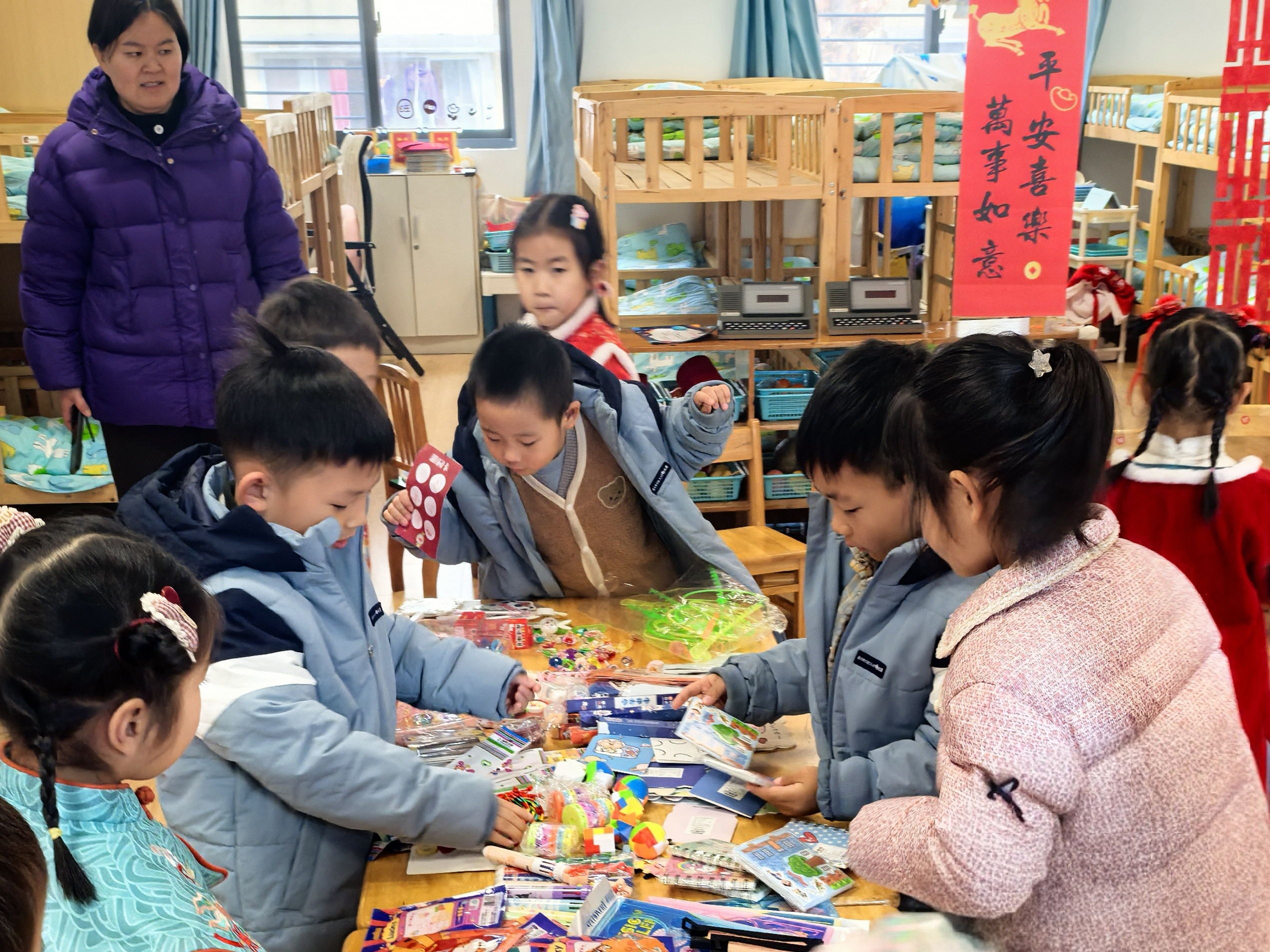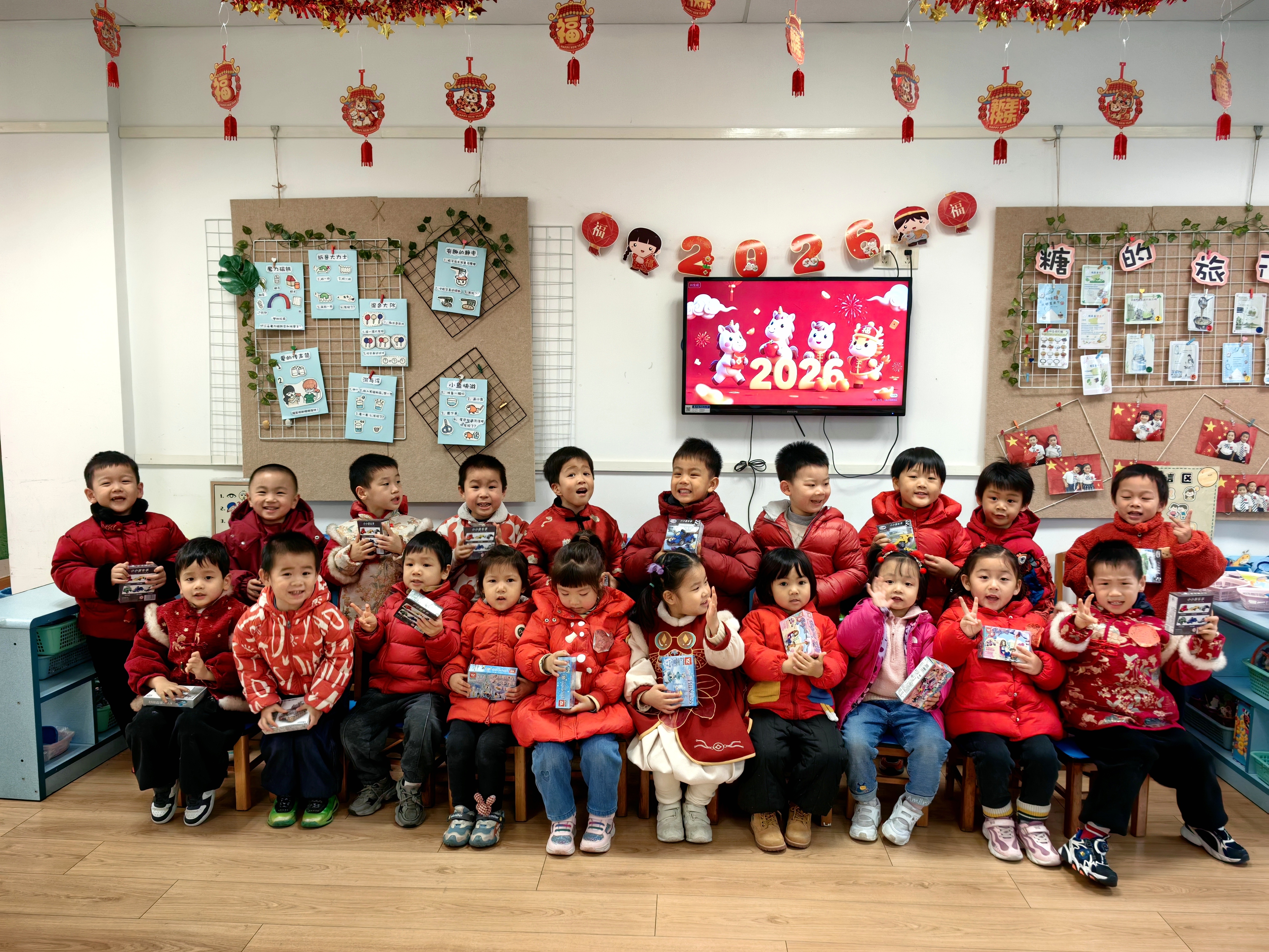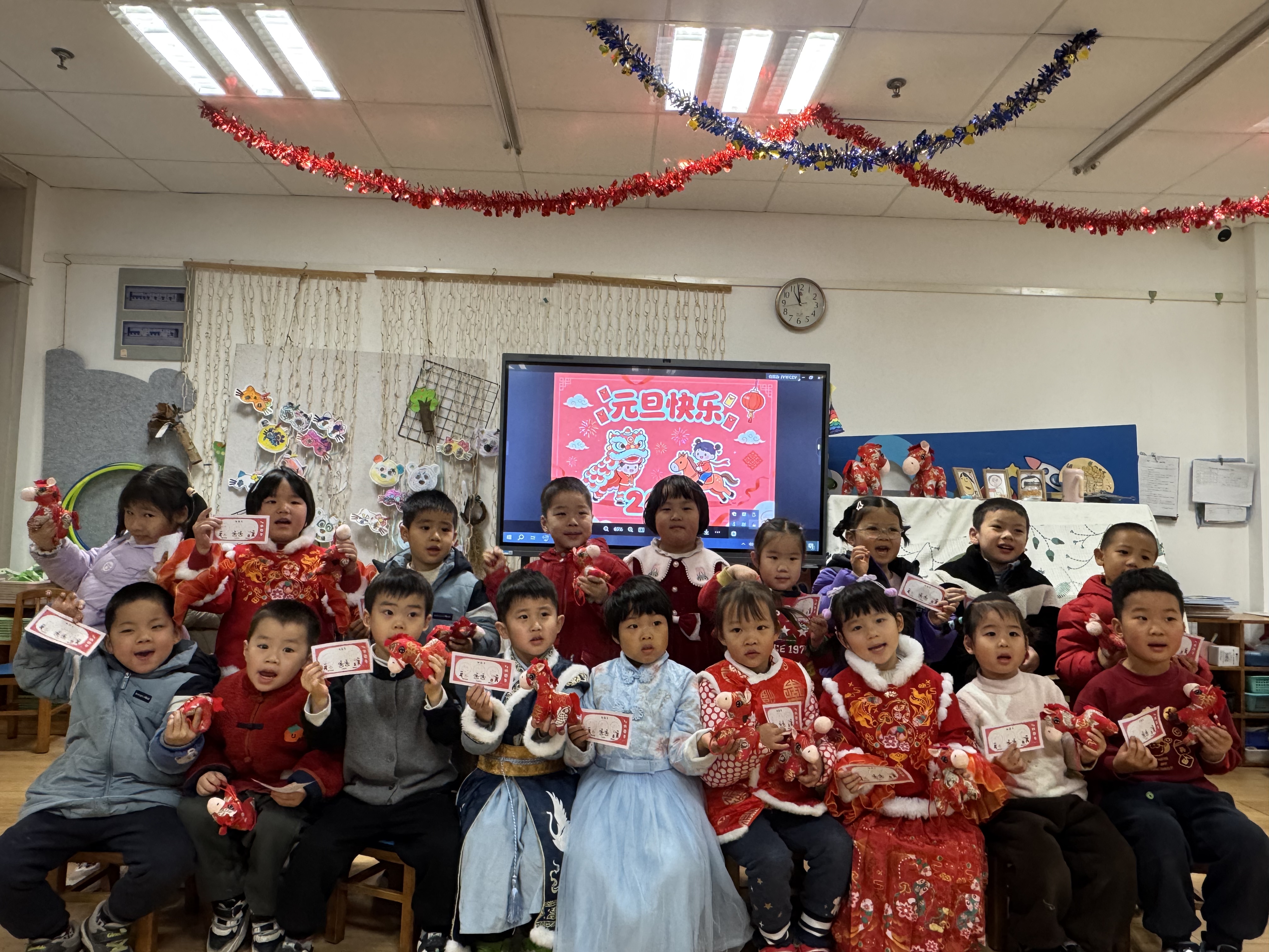 活动最后,孩子们凭集满福章的游园卡兑换了心仪的新年小礼物,并迫不及待地与同伴分享新年的收获。全体师生欢聚一堂,齐声唱响《新年好》《恭喜恭喜》等经典歌曲,稚嫩而纯真的歌声在园所回荡,每一个音符都承载着孩子们对新年最美好的憧憬。
