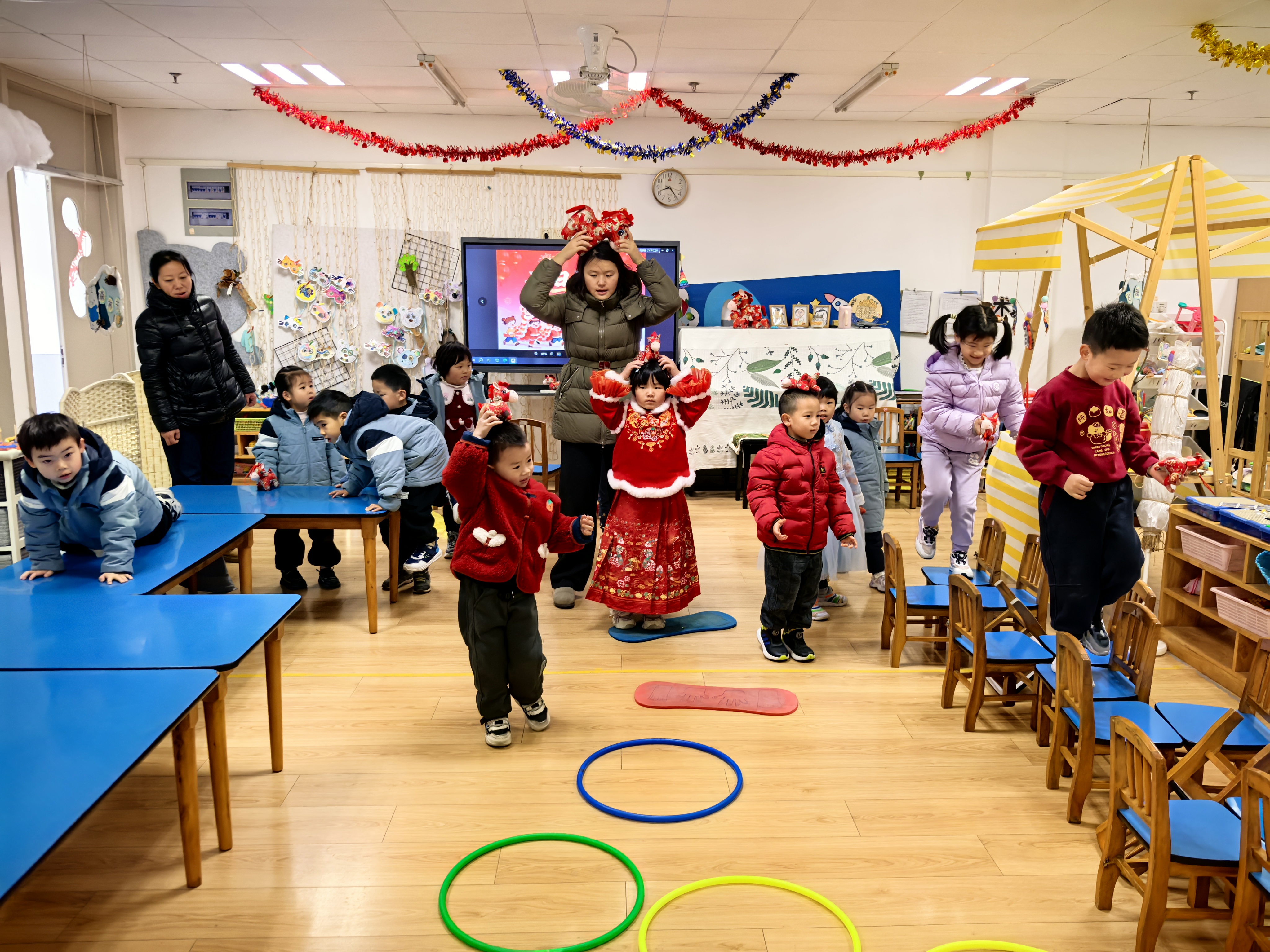 各年级组结合幼儿年龄特点,设计了丰富多样的趣味游戏:大班的“彩虹摇马”“福气满满”“小马奔腾”活力四射;中班的“福马迎新”“木马接力”“趣套福气”欢乐多多;小班的“小马过河”“福马拓印”“礼花迎新”创意无限;宝宝班的“冰糖葫芦甜又圆”则让孩子们运用彩泥体验亲手制作的乐趣。各班组的孩子们穿梭于班级游戏之间,游园卡上的福章渐渐盖满,快乐也在欢声笑语中持续传递。