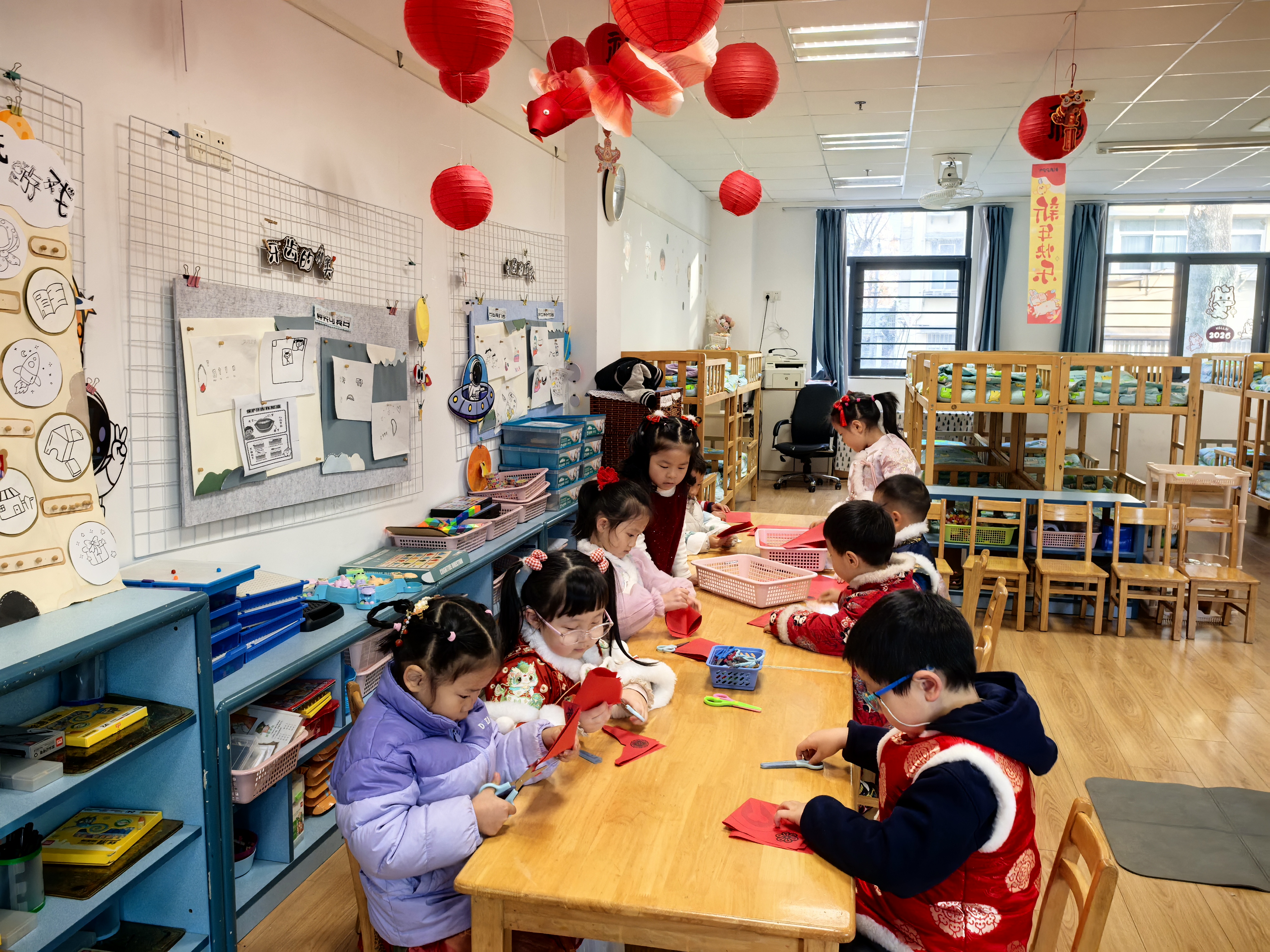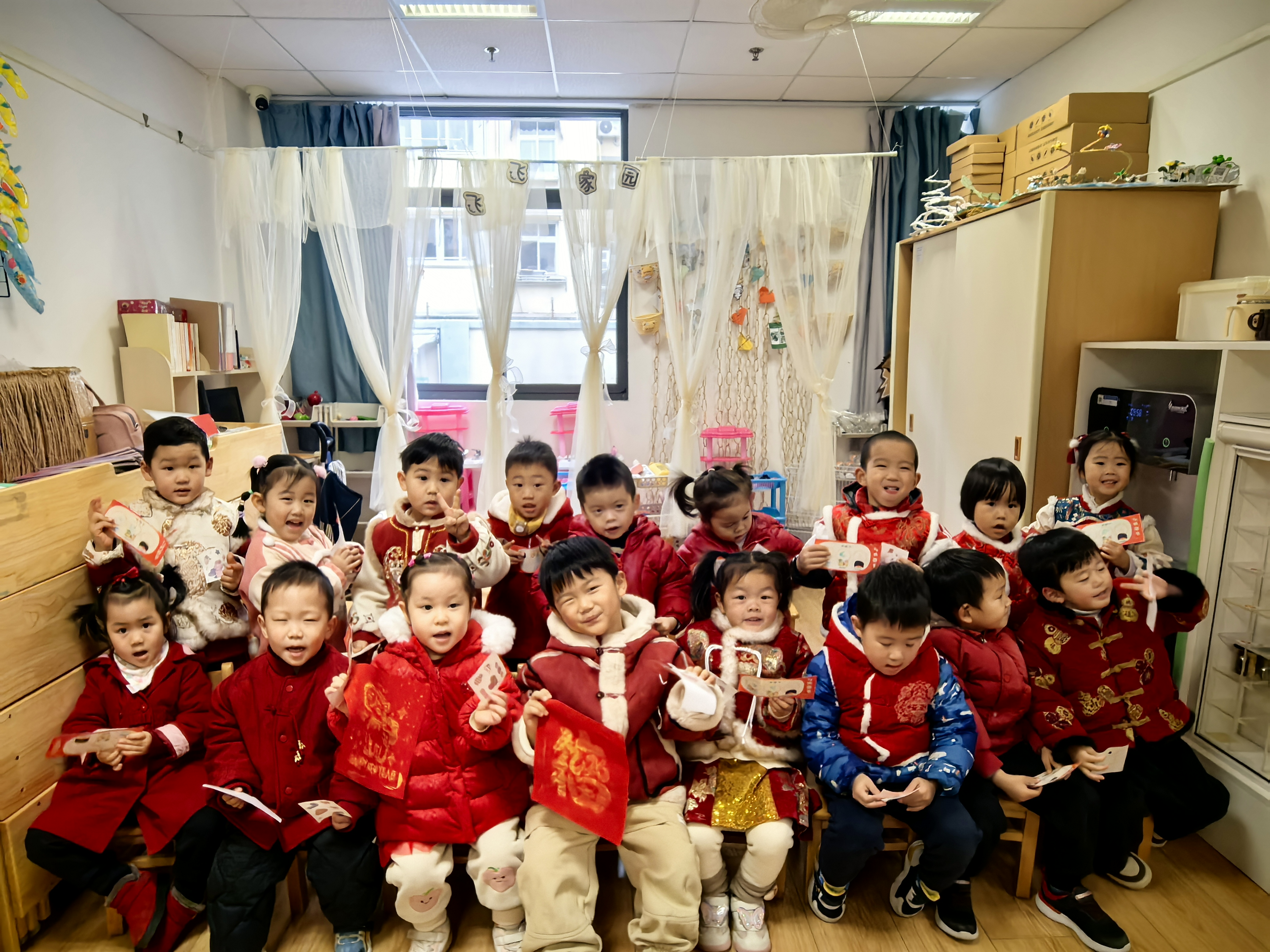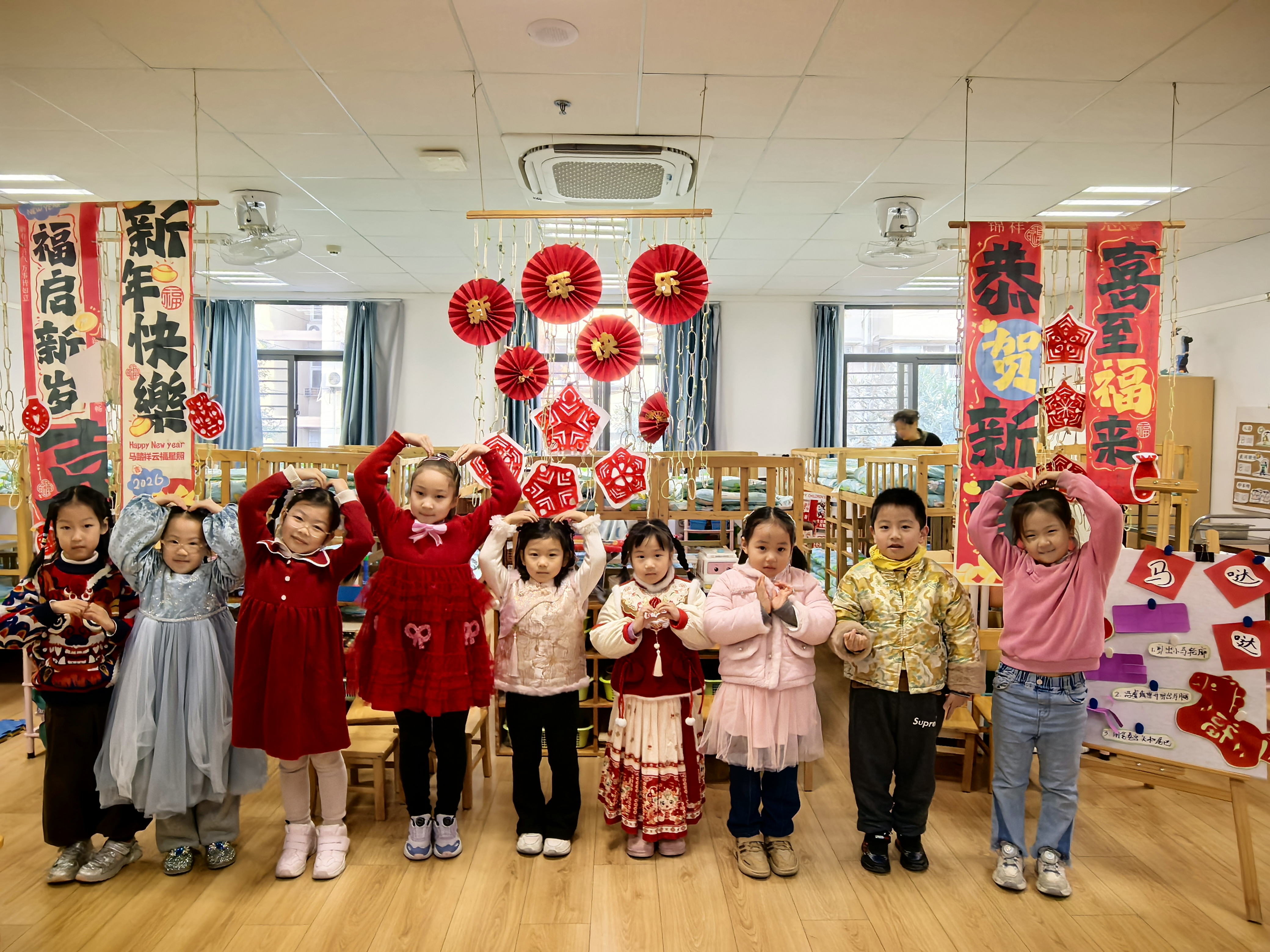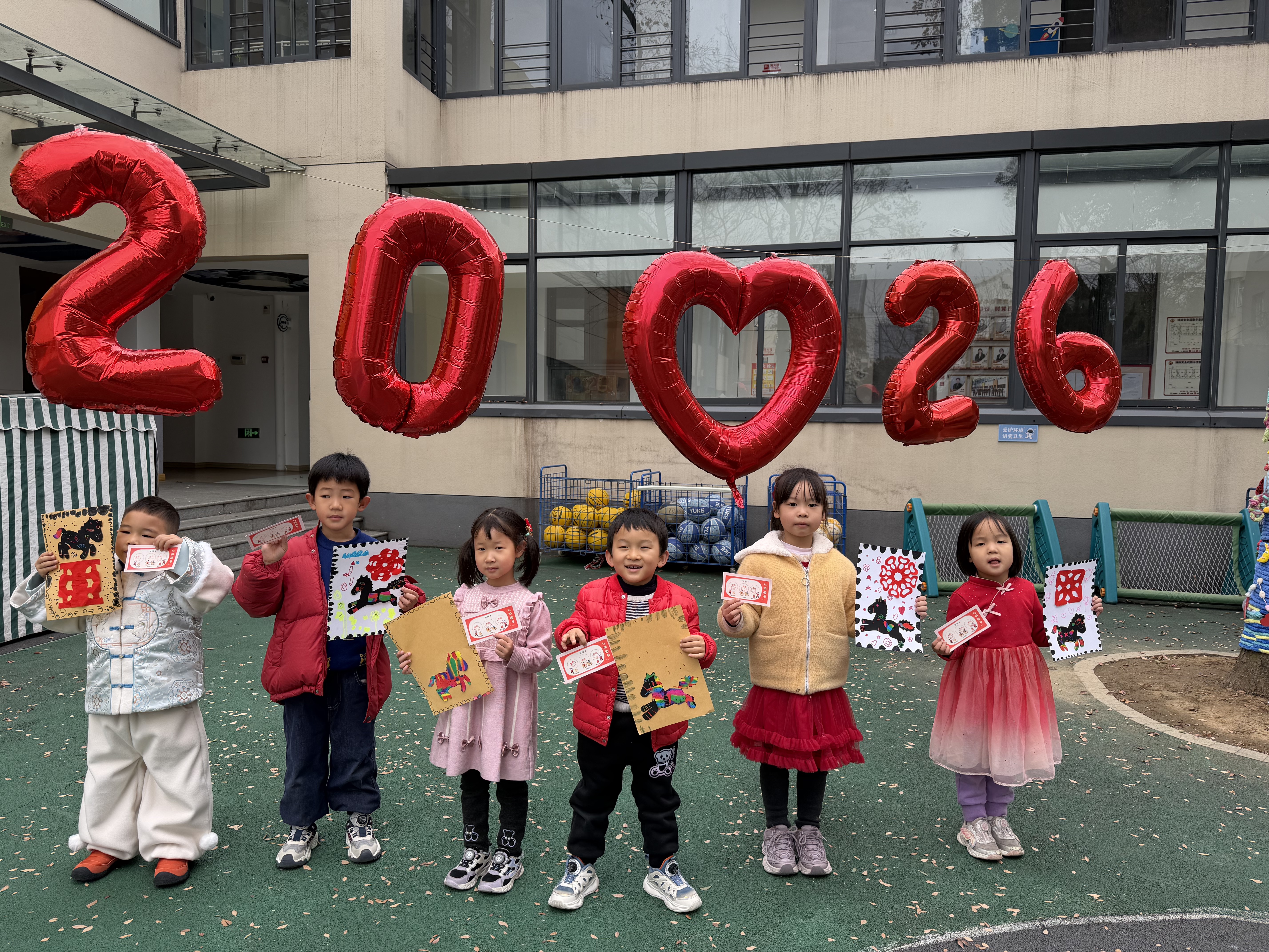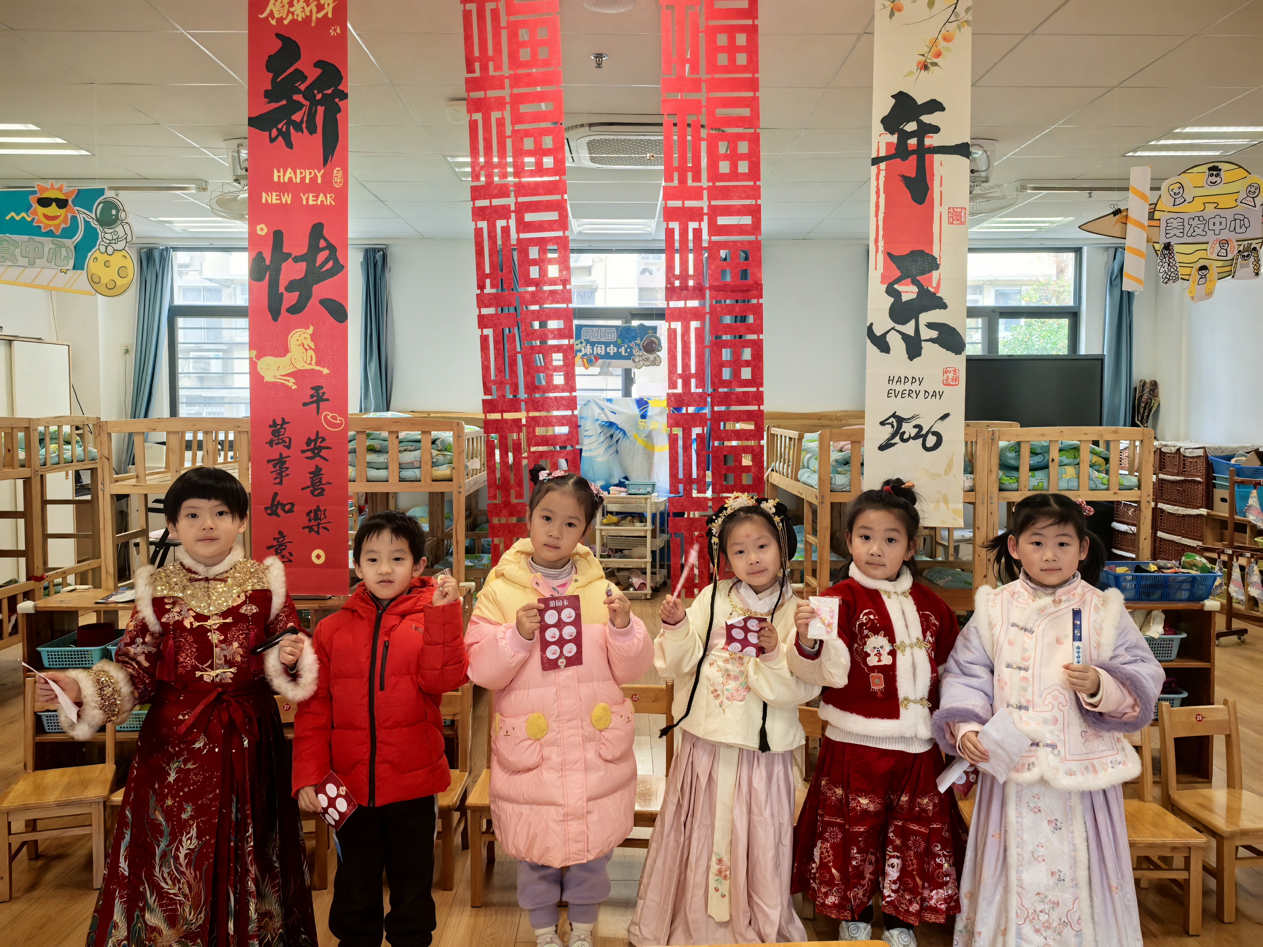 12月31日,孩子们身着传统喜庆的服饰,带着灿烂的笑容走进幼儿园,“2026”数字气球、剪纸、福字等将园所装点得年味浓浓,温馨热闹的氛围正式为这场迎新活动拉开序幕。各班教室萦绕着欢快的新年乐曲,冬日的寒意丝毫没有减弱孩子们迎接新年的热情。